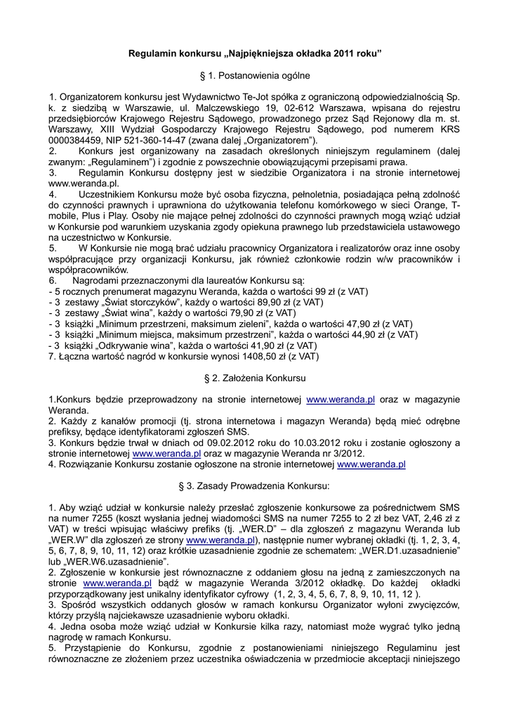 Regulamin konkursu „Najpiękniejsza okładka 2011 roku” § 1. Postanowienia ogólne 1. Organizatorem konkursu jest Wydawnictwo Te-Jot spółka z ograniczoną odpowiedzialnością Sp. k. z siedzibą w Warszawie, ul. Malczewskiego 19, 02-612 Warszawa, wpisana do rejestru przedsiębiorców Krajowego Rejestru Sądowego, prowadzonego przez Sąd Rejonowy dla m. st. Warszawy, XIII Wydział Gospodarczy Krajowego Rejestru Sądowego, pod numerem KRS 0000384459, NIP 521-360-14-47 (zwana dalej „Organizatorem”). 2. Konkurs jest organizowany na zasadach określonych niniejszym regulaminem (dalej zwanym: „Regulaminem”) i zgodnie z powszechnie obowiązującymi przepisami prawa. 3. Regulamin Konkursu dostępny jest w siedzibie Organizatora i na stronie internetowej www.weranda.pl. 4. Uczestnikiem Konkursu może być osoba fizyczna, pełnoletnia, posiadająca pełną zdolność do czynności prawnych i uprawniona do użytkowania telefonu komórkowego w sieci Orange, Tmobile, Plus i Play. Osoby nie mające pełnej zdolności do czynności prawnych mogą wziąć udział w Konkursie pod warunkiem uzyskania zgody opiekuna prawnego lub przedstawiciela ustawowego na uczestnictwo w Konkursie. 5. W Konkursie nie mogą brać udziału pracownicy Organizatora i realizatorów oraz inne osoby współpracujące przy organizacji Konkursu, jak również członkowie rodzin w/w pracowników i współpracowników. 6. Nagrodami przeznaczonymi dla laureatów Konkursu są: - 5 rocznych prenumerat magazynu Weranda, każda o wartości 99 zł (z VAT) - 3 zestawy „Świat storczyków”, każdy o wartości 89,90 zł (z VAT) - 3 zestawy „Świat wina”, każdy o wartości 79,90 zł (z VAT) - 3 książki „Minimum przestrzeni, maksimum zieleni”, każda o wartości 47,90 zł (z VAT) - 3 książki „Minimum miejsca, maksimum przestrzeni”, każda o wartości 44,90 zł (z VAT) - 3 książki „Odkrywanie wina”, każda o wartości 41,90 zł (z VAT) 7. Łączna wartość nagród w konkursie wynosi 1408,50 zł (z VAT) § 2. Założenia Konkursu 1.Konkurs będzie przeprowadzony na stronie internetowej www.weranda.pl oraz w magazynie Weranda. 2. Każdy z kanałów promocji (tj. strona internetowa i magazyn Weranda) będą mieć odrębne prefiksy, będące identyfikatorami zgłoszeń SMS. 3. Konkurs będzie trwał w dniach od 09.02.2012 roku do 10.03.2012 roku i zostanie ogłoszony a stronie internetowej www.weranda.pl oraz w magazynie Weranda nr 3/2012. 4. Rozwiązanie Konkursu zostanie ogłoszone na stronie internetowej www.weranda.pl § 3. Zasady Prowadzenia Konkursu: 1. Aby wziąć udział w konkursie należy przesłać zgłoszenie konkursowe za pośrednictwem SMS na numer 7255 (koszt wysłania jednej wiadomości SMS na numer 7255 to 2 zł bez VAT, 2,46 zł z VAT) w treści wpisując właściwy prefiks (tj. „WER.D” – dla zgłoszeń z magazynu Weranda lub „WER.W” dla zgłoszeń ze strony www.weranda.pl), następnie numer wybranej okładki (tj. 1, 2, 3, 4, 5, 6, 7, 8, 9, 10, 11, 12) oraz krótkie uzasadnienie zgodnie ze schematem: „WER.D1.uzasadnienie” lub „WER.W6.uzasadnienie”. 2. Zgłoszenie w konkursie jest równoznaczne z oddaniem głosu na jedną z zamieszczonych na stronie www.weranda.pl bądź w magazynie Weranda 3/2012 okładkę. Do każdej okładki przyporządkowany jest unikalny identyfikator cyfrowy (1, 2, 3, 4, 5, 6, 7, 8, 9, 10, 11, 12 ). 3. Spośród wszystkich oddanych głosów w ramach konkursu Organizator wyłoni zwycięzców, którzy przyślą najciekawsze uzasadnienie wyboru okładki. 4. Jedna osoba może wziąć udział w Konkursie kilka razy, natomiast może wygrać tylko jedną nagrodę w ramach Konkursu. 5. Przystąpienie do Konkursu, zgodnie z postanowieniami niniejszego Regulaminu jest równoznaczne ze złożeniem przez uczestnika oświadczenia w przedmiocie akceptacji niniejszego Regulaminu. 6. Organizator oświadcza, że dane osobowe uczestnika w zakresie: imię i nazwisko, numer telefonu komórkowego lub odpowiednio adres zamieszkania, będą przetwarzane przez Organizatora Konkursu z siedzibą w Warszawie , przy ul. Malczewskiego 19 w celu realizacji umowy przystąpienia do konkursu i jego prawidłowego przeprowadzenia. Dane osobowe nie będą udostępniane innym podmiotom. Podanie danych jest dobrowolne. § 4. Przyznawanie Nagród: 1. Laureaci wyłonieni zostaną w wyniku realizacji procedury opisanej w § 3 w terminie najpóźniej do dnia 12 marca 2012 roku. 2. Laureaci powiadomieni zostaną o wygranej SMS-em lub telefonicznie w terminie najpóźniej do dnia 15 marca.2012 roku. Koszty rozmów telefonicznych z laureatami pokrywa Organizator. 3. Nagrody do poszczególnych laureatów wysłane zostaną pocztą lub przesyłką kurierską na koszt Organizatora pod adres zamieszkania wskazany przez laureata SMS-em lub telefonicznie najpóźniej w terminie 60 dni od dnia powiadomienia laureata o wygranej. 4 W przypadku, nie podjęcia przez laureata nagrody w terminie 14 dni od dnia postawienia jej do dyspozycji laureata, prawo do nagrody wygasa. 5. Organizator zastrzega, że nagrody nie podlegają zamianie na ich równowartość pieniężną. 6. Laureatom nie przysługuje prawo do wyboru nagrody i zastrzeżenia szczególnych właściwości nagród. § 5. Postępowanie Reklamacyjne: 1. Wszelkie reklamacje dotyczące Konkursu uczestnicy powinni zgłaszać w formie pisemnej najpóźniej w terminie 14 dni od dnia zakończenia Konkursu na adres Organizatora: Wydawnictwo TE-JOT Spółka z ograniczoną odpowiedzialnością Sp. K. z siedzibą w Warszawie, ul. Malczewskiego 19 z dopiskiem o treści: Reklamacja – Konkurs „Najpiękniejsza okładka 2011 roku”, 2. Reklamacje należy wysłać listem poleconym za potwierdzeniem odbioru. Decyduje data stempla pocztowego. 3. Pisemna reklamacja powinna zawierać imię, nazwisko, dokładny adres i numer telefonu, jak również dokładny opis i uzasadnienie reklamacji. 4. Reklamacje zgłoszone po upływie terminu wskazanego w ust. 1 nie będ