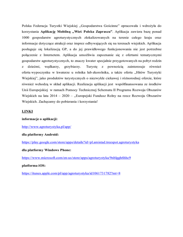 Polska Federacja Turystki Wiejskiej „Gospodarstwa Gościnne” opracowała i wdrożyła do korzystania Aplikację Mobilną „Wieś Polska Zaprasza”. Aplikacja zawiera bazę ponad 1000 gospodarstw agroturystycznych zlokalizowanych na terenie całego kraju oraz informacje dotyczące atrakcji oraz imprez odbywających się na terenach wiejskich. Aplikacja posługuje się lokalizacją GP, a do jej prawidłowego funkcjonowania nie jest potrzebne połączenie z Internetem. Aplikacja umożliwia zapoznanie się z ofertami tematycznymi gospodarstw agroturystycznych, to znaczy kwater specjalnie przygotowanych na pobyt rodzin z dziećmi, wędkarzy, grzybiarzy. Turystę z pewnością zainteresuje również oferta wypoczynku w kwaterze u rolnika lub ekorolnika, a także oferta „Hitów Turystyki Wiejskiej”, jako produktów turystycznych o niezwykle ciekawej i różnorodnej ofercie, które również wchodzą w skład aplikacji. Realizacja aplikacji jest współfinansowana ze środków Unii Europejskiej w ramach Pomocy Technicznej Schematu II Programu Rozwoju Obszarów Wiejskich na lata 2014 – 2020 – „Europejski Fundusz Rolny na rzecz Rozwoju Obszarów Wiejskich. Zachęcamy do pobierania i korzystania! LINKI informacje o aplikacji: http://www.agroturystyka.pl/app/ dla platformy Android: https://play.google.com/store/apps/details?id=pl.amistad.treespot.agroturystyka dla platformy Windows Phone: https://www.microsoft.com/en-us/store/apps/agroturystyka/9nblggh6hhc9 platforma iOS: https://itunes.apple.com/pl/app/agroturystyka/id1061731782?mt=8