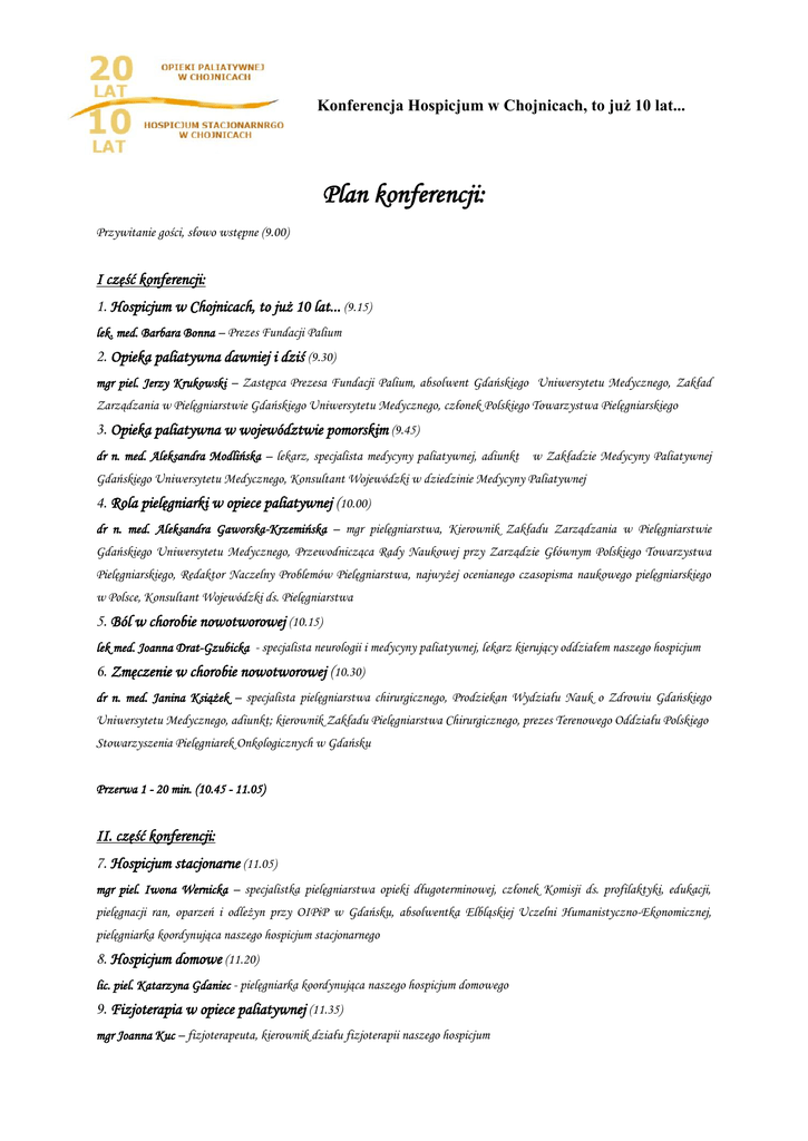 Konferencja Hospicjum w Chojnicach, to już 10 lat... Plan konferencji: Przywitanie gości, słowo wstępne (9.00) I część konferencji: 1. Hospicjum w Chojnicach, to już 10 lat... (9.15) lek. med. Barbara Bonna – Prezes Fundacji Palium 2. Opieka paliatywna dawniej i dziś (9.30) mgr piel. Jerzy Krukowski – Zastępca Prezesa Fundacji Palium, absolwent Gdańskiego Uniwersytetu Medycznego, Zakład Zarządzania w Pielęgniarstwie Gdańskiego Uniwersytetu Medycznego, członek Polskiego Towarzystwa Pielęgniarskiego 3. Opieka paliatywna w województwie pomorskim (9.45) dr n. med. Aleksandra Modlińska – lekarz, specjalista medycyny paliatywnej, adiunkt w Zakładzie Medycyny Paliatywnej Gdańskiego Uniwersytetu Medycznego, Konsultant Wojewódzki w dziedzinie Medycyny Paliatywnej 4. Rola pielęgniarki w opiece paliatywnej (10.00) dr n. med. Aleksandra Gaworska-Krzemińska – mgr pielęgniarstwa, Kierownik Zakładu Zarządzania w Pielęgniarstwie Gdańskiego Uniwersytetu Medycznego, Przewodnicząca Rady Naukowej przy Zarządzie Głównym Polskiego Towarzystwa Pielęgniarskiego, Redaktor Naczelny Problemów Pielęgniarstwa, najwyżej ocenianego czasopisma naukowego pielęgniarskiego w Polsce, Konsultant Wojewódzki ds. Pielęgniarstwa 5. Ból w chorobie nowotworowej (10.15) lek med. Joanna Drat-Gzubicka - specjalista neurologii i medycyny paliatywnej, lekarz kierujący oddziałem naszego hospicjum 6. Zmęczenie w chorobie nowotworowej (10.30) dr n. med. Janina Książek – specjalista pielęgniarstwa chirurgicznego, Prodziekan Wydziału Nauk o Zdrowiu Gdańskiego Uniwersytetu Medycznego, adiunkt; kierownik Zakładu Pielęgniarstwa Chirurgicznego, prezes Terenowego Oddziału Polskiego Stowarzyszenia Pielęgniarek Onkologicznych w Gdańsku Przerwa 1 - 20 min. (10.45 - 11.05) II. część konferencji: 7. Hospicjum stacjonarne (11.05) mgr piel. Iwona Wernicka – specjalistka pielęgniarstwa opieki długoterminowej, członek Komisji ds. profilaktyki, edukacji, pielęgnacji ran, oparzeń i odleżyn przy OIPiP w Gdańsku, absolwentka Elbląskiej Uczelni Humanistyczno-Ekonomicznej, pielęgniarka koordynująca naszego hospicjum stacjonarnego 8. Hospicjum domowe (11.20) lic. piel. Katarzyna Gdaniec - pielęgniarka koordynująca naszego hospicjum domowego 9. Fizjoterapia w opiece paliatywnej (11.35) mgr Joanna Kuc – fizjoterapeuta, kierownik działu fizjoterapii naszego hospicjum 10. Zapobieganie chorobom nowotworowym (11.50) dr n. med. Kazimiera Hebel – mgr pielęgniarstwa, Adiunkt w Instytucie Nauk o Zdrowiu Akademii Pomorskiej w Słupsku, członek Zarządu Oddziału Polskiego Towarzystwa Pielęgniarskiego w Gdańsku 11. Komunikacja w opiece paliatywnej (12.05) mgr Ewa Wodzikowska – pielęgniarka, zastępca Dyrektora ds. pielęgniarstwa w Szpitalu Specjalistycznym im. J. K. Łukowicza w Chojnicach, mgr edukacji zdrowotnej i promocji zdrowia, specjalista pielęgniarstwa zachowawczego, absolwentka Akademii Humanistycznej w Pułtusku, Akademii Medycznej w Gdańsku oraz Uniwersytetu Gdańskiego, wiceprezes Stowarzyszenia Menedżerów Pielęgniarstwa Przerwa 2 - 40 min. (12.20 - 13.00) III. cześć konferencji: 12. Duchowe aspekty opieki paliatywnej (13.00) ks. mgr Stanisław Stolc – kapelan naszego hospicjum 13. Terapia zajęciowa w opiece paliatywnej (13.15) Kamila Krukowska – terapeuta zajęciowy naszego hospicjum 14. Psychologiczne aspekty opieki paliatywnej (13.30) mgr Agata Obuchowska – psycholog naszego hospicjum 15. Wolontariat w opiece paliatywnej (13.45) mgr Anna Janowicz – Prezes Fundacji Lubię Pomagać 16. Pomoc społeczna dla pacjentów nieuleczalnie chorych (14.00) mgr Elżbieta Szczepańska – Dyrektor MOPS w Chojnicach Po konferencji zapraszamy na zwiedzanie naszego hospicjum (Chojnice, ul. Strzelecka 89)