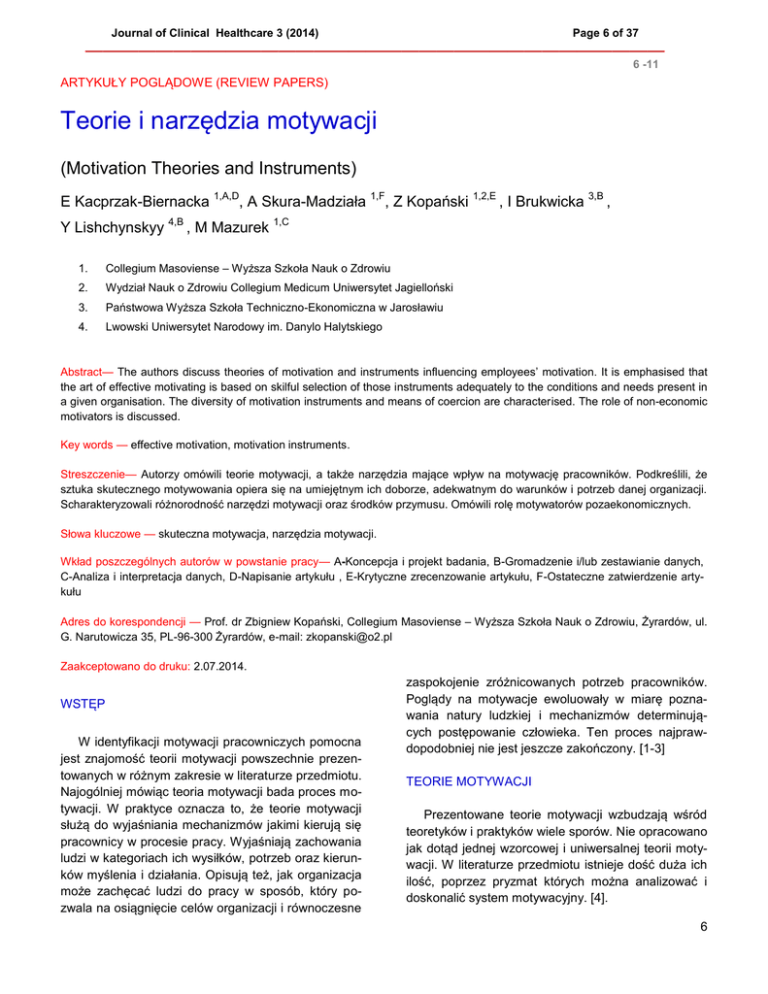 Journal of Clinical Healthcare 3 (2014) Page 6 of 37 ————————————————————————————————— 6 -11 ARTYKUŁY POGLĄDOWE (REVIEW PAPERS) Teorie i narzędzia motywacji (Motivation Theories and Instruments) E Kacprzak-Biernacka 1,A,D, A Skura-Madziała 1,F, Z Kopański 1,2,E , I Brukwicka 3,B , Y Lishchynskyy 4,B , M Mazurek 1,C 1. Collegium Masoviense – Wyższa Szkoła Nauk o Zdrowiu 2. Wydział Nauk o Zdrowiu Collegium Medicum Uniwersytet Jagielloński 3. Państwowa Wyższa Szkoła Techniczno-Ekonomiczna w Jarosławiu 4. Lwowski Uniwersytet Narodowy im. Danylo Halytskiego Abstract— The authors discuss theories of motivation and instruments influencing employees’ motivation. It is emphasised that the art of effective motivating is based on skilful selection of those instruments adequately to the conditions and needs present in a given organisation. The diversity of motivation instruments and means of coercion are characterised. The role of non-economic motivators is discussed. Key words — effective motivation, motivation instruments. Streszczenie— Autorzy omówili teorie motywacji, a także narzędzia mające wpływ na motywację pracowników. Podkreślili, że sztuka skutecznego motywowania opiera się na umiejętnym ich doborze, adekwatnym do warunków i potrzeb danej organizacji. Scharakteryzowali różnorodność narzędzi motywacji oraz środków przymusu. Omówili rolę motywatorów pozaekonomicznych. Słowa kluczowe — skuteczna motywacja, narzędzia motywacji. Wkład poszczególnych autorów w powstanie pracy— A-Koncepcja i projekt badania, B-Gromadzenie i/lub zestawianie danych, C-Analiza i interpretacja danych, D-Napisanie artykułu , E-Krytyczne zrecenzowanie artykułu, F-Ostateczne zatwierdzenie artykułu Adres do korespondencji — Prof. dr Zbigniew Kopański, Collegium Masoviense – Wyższa Szkoła Nauk o Zdrowiu, Żyrardów, ul. G. Narutowicza 35, PL-96-300 Żyrardów, e-mail: [email protected] Zaakceptowano do druku: 2.07.2014. WSTĘP W identyfikacji motywacji pracowniczych pomocna jest znajomość teorii motywacji powszechnie prezentowanych w różnym zakresie w literaturze przedmiotu. Najogólniej mówiąc teoria motywacji bada proces motywacji. W praktyce oznacza to, że teorie motywacji służą do wyjaśniania mechanizmów jakimi kierują się pracownicy w procesie pracy. Wyjaśniają zachowania ludzi w kategoriach ich wysiłków, potrzeb oraz kierunków myślenia i działania. Opisują też, jak organizacja może zachęcać ludzi do pracy w sposób, który pozwala na osiągnięcie celów organizacji i równoczesne zaspokojenie zróżnicowanych potrzeb pracowników. Poglądy na motywacje ewoluowały w miarę poznawania natury ludzkiej i mechanizmów determinujących postępowanie człowieka. Ten proces najprawdopodobniej nie jest jeszcze zakończony. [1-3] TEORIE MOTYWACJI Prezentowane teorie motywacji wzbudzają wśród teoretyków i praktyków wiele sporów. Nie opracowano jak dotąd jednej wzorcowej i uniwersalnej teorii motywacji. W literaturze przedmiotu istnieje dość duża ich ilość, poprzez pryzmat których można analizować i doskonalić system motywacyjny. [4]. 6 Journal of Clinical Healthcare 3 (2014) Page 7 of 37 ————————————————————————————————— Do najbardziej znanych należy teoria potrzeb A. Maslowa, który postawił hipotezę, że człowiek w swoim działaniu dąży do zaspokojenia zespołu potrzeb tworzących logiczną hierarchię (w kolejności od potrzeb podstawowych do złożonych): potrzeby fizjologiczne, potrzeby bezpieczeństwa, potrzeby społeczne (przynależności), potrzeby szacunku, potrzeby samorealizacji. Rycina 1. Piramida potrzeb Maslowa [5] Zasadnicza teza tej teorii jest taka, że, aby było możliwe zaspokojenie potrzeb wyższego rzędu, muszą być zaspokojone potrzeby niższego rzędu. Układ strukturalny występowania określonych potrzeb związany jest z osobowością człowieka. Rozwój osobowości zwiększa motywację do zaspokajania potrzeb ze szczytu piramidy [6]. Modyfikacji teorii potrzeb A. Maslowa dokonał C. P. Alderfer. Jego teoria ERG ujmuje potrzeby w trzech grupach hierarchicznych: potrzeby egzystencji (Existence), przynależności do grupy (Relatedness) i rozwoju osobowego (Growth). C.P. Alderfer wskazuje ponadto, że zachowanie człowieka może być zdeterminowane jednocześnie przez różne potrzeby. Kwestionuje on zasadę rosnącego znaczenia kolejnej wyższej kategorii potrzeb po zaspokojeniu potrzeby kategorii niższej. Autor uważa, że na skutek braku zaspokojenia potrzeb zaliczanych do kategorii wyż- szej pojawiać się może frustracja i człowiek powraca do zaspokojenia potrzeb kategorii niższej [7,8]. Teoria osiągnięć D. McClellanda także identyfikuje trzy grupy potrzeb, które autor uznał za najważniejsze. Są to potrzeby osiągnięć, przynależności i władzy. Potrzeba osiągnięć definiowana jest jako potrzeba mierzenia sukcesu w odniesieniu do osobistego standardu doskonałości. Potrzeba przynależności (afiliacji) oznacza pragnienie kontaktów z ludźmi i akceptacji z ich strony. Potrzebę władzy zdefiniowano jako chęć wpływania na innych i kontroli swojego otoczenia. Poziom tych potrzeb jest u ludzi zróżnicowany. Niektórzy mają większą potrzebę osiągnięć, inni przynależności, a jeszcze inni władzy. Dominacja jednej potrzeby nie oznacza eliminacji pozostałych [3,9]. Inna z kategorii teorii potrzeb, dwuczynnikowa teoria Herzberga wyróżnia dwa rodzaje czynników wpływających na zadowolenie i niezadowolenie pracowników. Po pierwsze: są to czynniki motywacyjne, ukierunkowane na zaspokojenie potrzeb wyższego rzędu, takich jak: uznanie, treść pracy, osiągnięcia, awanse, rozwój, które wiążą się z motywacją wewnętrzną. Elementy te przyczyniają się do zwiększenia satysfakcji związanej z wykonywaniem pracy, co z kol