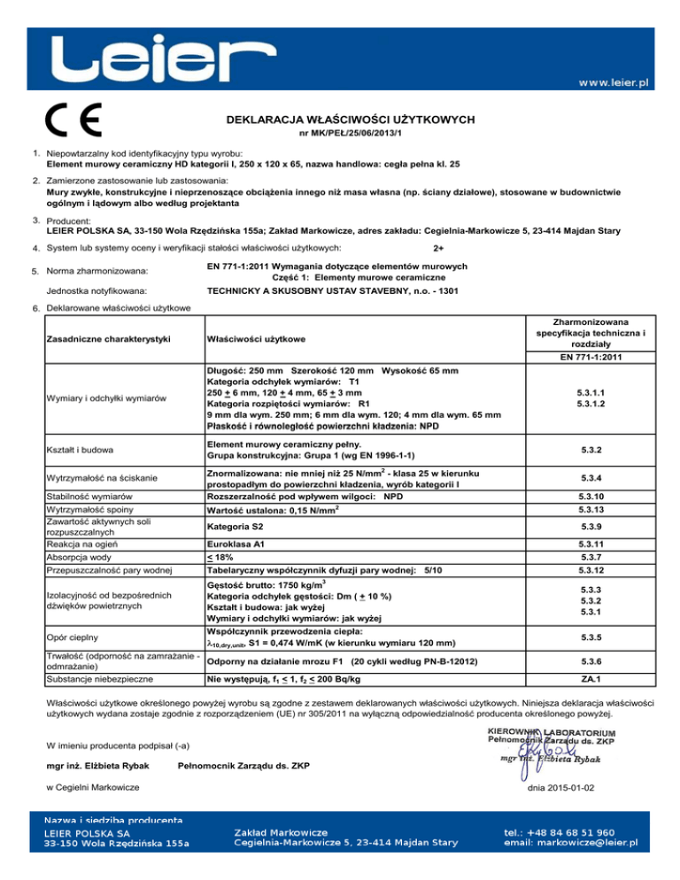 DEKLARACJA WŁAŚCIWOŚCI UŻYTKOWYCH nr MK/PEŁ/25/06/2013/1 1. Niepowtarzalny kod identyfikacyjny typu wyrobu: Element murowy ceramiczny HD kategorii I, 250 x 120 x 65, nazwa handlowa: cegła pełna kl. 25 2. Zamierzone zastosowanie lub zastosowania: Mury zwykłe, konstrukcyjne i nieprzenoszące obciążenia innego niż masa własna (np. ściany działowe), stosowane w budownictwie ogólnym i lądowym albo według projektanta 3. Producent: LEIER POLSKA SA, 33-150 Wola Rzędzińska 155a; Zakład Markowicze, adres zakładu: Cegielnia-Markowicze 5, 23-414 Majdan Stary 4. System lub systemy oceny i weryfikacji stałości właściwości użytkowych: 2+ EN 771-1:2011 Wymagania dotyczące elementów murowych Część 1: Elementy murowe ceramiczne 5. Norma zharmonizowana: Jednostka notyfikowana: TECHNICKY A SKUSOBNY USTAV STAVEBNY, n.o. - 1301 6. Deklarowane właściwości użytkowe Zasadniczne charakterystyki Właściwości użytkowe Wymiary i odchyłki wymiarów Długość: 250 mm Szerokość 120 mm Wysokość 65 mm Kategoria odchyłek wymiarów: T1 250 + 6 mm, 120 + 4 mm, 65 + 3 mm Kategoria rozpiętości wymiarów: R1 9 mm dla wym. 250 mm; 6 mm dla wym. 120; 4 mm dla wym. 65 mm Płaskość i równoległość powierzchni kładzenia: NPD Kształt i budowa Element murowy ceramiczny pełny. Grupa konstrukcyjna: Grupa 1 (wg EN 1996-1-1) Zharmonizowana specyfikacja techniczna i rozdziały EN 771-1:2011 Wytrzymałość na ściskanie Stabilność wymiarów Wytrzymałość spoiny Zawartość aktywnych soli rozpuszczalnych Reakcja na ogień 5.3.1.1 5.3.1.2 5.3.2 Znormalizowana: nie mniej niż 25 N/mm2 - klasa 25 w kierunku prostopadłym do powierzchni kładzenia, wyrób kategorii I Rozszerzalność pod wpływem wilgoci: NPD 5.3.10 Wartość ustalona: 0,15 N/mm2 5.3.13 Kategoria S2 5.3.9 Euroklasa A1 5.3.11 5.3.4 Absorpcja wody < 18% 5.3.7 Przepuszczalność pary wodnej Tabelaryczny współczynnik dyfuzji pary wodnej: 5/10 5.3.12 Izolacyjność od bezpośrednich dźwięków powietrznych Gęstość brutto: 1750 kg/m3 Kategoria odchyłek gęstości: Dm ( + 10 %) Kształt i budowa: jak wyżej Wymiary i odchyłki wymiarów: jak wyżej 5.3.3 5.3.2 5.3.1 Opór cieplny Współczynnik przewodzenia ciepła: λ10,dry,unit, S1 = 0,474 W/mK (w kierunku wymiaru 120 mm) 5.3.5 Trwałość (odporność na zamrażanie Odporny na działanie mrozu F1 (20 cykli według PN-B-12012) odmrażanie) Nie występują, f1 < 1, f2 < 200 Bq/kg Substancje niebezpieczne 5.3.6 ZA.1 Właściwości użytkowe określonego powyżej wyrobu są zgodne z zestawem deklarowanych właściwości użytkowych. Niniejsza deklaracja właściwości użytkowych wydana zostaje zgodnie z rozporządzeniem (UE) nr 305/2011 na wyłączną odpowiedzialność producenta określonego powyżej. W imieniu producenta podpisał (-a) mgr inż. Elżbieta Rybak w Cegielni Markowicze Pełnomocnik Zarządu ds. ZKP dnia 2015-01-02