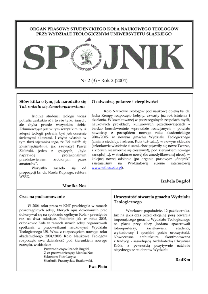 ORGAN PRASOWY STUDENCKIEGO KOŁA NAUKOWEGO TEOLOGÓW PRZY WYDZIALE TEOLOGICZNYM UNIWERSYTETU ŚLĄSKIEGO Nr 2 (3) ▪ Rok 2 (2004) Słów kilka o tym, jak narodziło się Tak rodziło się Zmartwychwstanie Istotnie studenci teologii wciąż potrafią zaskakiwać i to nie tylko innych, ale chyba przede wszystkim siebie. Zdumiewające jest w tym wszystkim to, iż adepci teologii potrafią być jednocześnie świetnymi aktorami. I chyba właśnie w tym tkwi tajemnica tego, że Tak rodziło się Zmartwychwstanie, jak zauważył Paweł Zieliński, jeden z grających, „było naprawdę profesjonalnym przedstawieniem zrobionym przez amatorów”. Wszystko zaczęło się od propozycji ks. dr. Józefa Kupnego, rektora WŚSD. O odwadze, pokorze i cierpliwości Koło Naukowe Teologów pod naukową opieką ks. dr. Jacka Kempy rozpoczęło kolejny, czwarty już rok istnienia i działania. W kształtowanej w poszczególnych zespołach myśli, naukowych projektach, kulturowych przedsięwzięciach – bardzo konsekwentnie wprawdzie rozwijanych – powiało nowością: z początkiem nowego roku akademickiego 2004/2005, w nowym gmachu Wydziału Teologicznego (zmiana siedziby, i adresu, Koła tuż-tuż...), w nowym składzie (członkowie właściwie ci sami, choć pojawiły się nowe Twarze, z których niezmiernie się cieszymy!), pod kierunkiem nowego zarządu[…], w strukturze nowej (bo zmodyfikowanej nieco), w kolejnej nowej odsłonie (po organie prasowym „Spójnik” zaistnieliśmy na Wydziałowej stronie internetowej www.wtl.us.edu.pl). Izabela Bugdoł Monika Nos Czas na podsumowanie W 2004 roku praca w KNT przebiegała w ramach poszczególnych sekcji, których opis dokonanych prac dokonywał się na spotkaniu ogólnym Koła – przeciętnie raz na dwa miesiące. Podobnie jak w roku 2003, członkowie Koła w ramach swoich sekcji organizowali spotkania z pracownikami naukowymi Wydziału Teologicznego UŚ. Wraz z rozpoczęciem nowego roku akademickiego 2004/2005 Koło Naukowe Teologów rozpoczęło swą działalność pod kierunkiem nowego zarządu, w składzie: Przewodnicząca: Izabela Bugdoł Z-ca przewodniczącej: Monika Nos Sekretarz: Piotr Larysz Skarbnik: Przemysław Bratkowski. Ewa Pluta Uroczystość otwarcia gmachu Wydziału Teologicznego Wtorkowe popołudnie, 12 października. Już na jakiś czas przed oficjalną porą otwarcia imponującego gmachu Wydziału Teologicznego na placu przy ulicy Jordana spacerowali fotoreporterzy, zaciekawieni studenci, wykładowcy i specjalni goście uroczystości. Nowoczesna architektura skonfrontowana z tradycją - sąsiadującą Archikatedrą Chrystusa Króla, z pewnością pozytywnie natchnie niejednego ze studentów Wydziału. RadKm SPIS TREŚCI ORGAN PRASOWY STUDENCKIEGO KOŁA NAUKOWEGO TEOLOGÓW przy Wydziale Teologicznym Uniwersytetu Śląskiego Nr 2 (3) ▪ Rok 2 (2004) W Waszych rękach kolejny plon naszej studenckiej pracy. Znając teorię Roberta Escarpita, mamy świadomość, iż, tak jak wszelki rodzaj piśmiennictwa, będzie to „dzieło podatne na zdradę”. Każdy bowiem zinterpretuje naszą pracę wedle własnego klucza. Podobnie jak Koło Naukowe Teologów wypełnia kolaż studenckich zainteresowań, przejawiających się w podziale na sekcje, tak i „Spójnik” złożony jest ze swoistej mozaiki tematycznej. Dlatego Czytelnik znajdzie w nim przegląd pracy Koła w postaci sprawozdań z różnorakich spotkań, mniej lub bardziej oficjalnych, zapozna się z relacjami z wydarzeń, którymi swego czasu żył Wydział Teologiczny. Nade wszystko jednak „Spójnik” to swoista nisza, którą chcemy wypełnić naszymi artykułami, przemyśleniami związanymi z planami czy dokonaniami Koła. Jeśli uda nam się Was, Czytelników, zapoznać z tym, na czym opiera się praca w Kole i pokazać, że faktycznie stagnacja i bezruch są formami śmierci, odczujemy, że nasza praca, nasz trud nie został zmarnowany czy wręcz zlekceważony. Wszak człowiek, który zakopał talent, wprawdzie go ocalił, ale nic ponadto… Ewa Pluta ADRES REDAKCJI Koło Naukowe Teologów Wydział Teologiczny UŚ ul. Wita Stwosza 17a 40-042 Katowice www.wtl.us.edu.pl Zespół redakcyjny Przemysław Bratkowski, Izabela Bugdoł, Ewa Pluta Z ŻYCIA KOŁA TEOLOGÓW Czas na podsumowanie……….………...….. 3 Ewa Pluta O odwadze, pokorze i cierpliwości ……………………………………………….... 4 Izabela Bugdoł Sekcji Historyczno-Filozoficzna ………….... 6 Sekcja Teologii Biblijnej …………………..… 7 Sekcja Teologii Praktycznej ………………... 8 Sekcja Teologii Systematycznej ...………….. 9 Sekcja Kulturalna ………………………..… 10 RECENZJE Historia żywa ………………………..…….. 12 Przemysław Bratkowski SZKICE Uwięziony Prymas …………….………….. 13 Sekcja Historyczna Współczesnego kapłana wizerunek …………………………………………….…. 15 Sekcja Teologii Praktycznej Wokół Pasji……………………………...….. 16 Sekcja Historyczna WYDARZENIA KULTURALNE Zjazd Gnieźnieński ……………..…………. 18 Dorota Fojt Europa da się lubić …………………..……. 19 Dominik Kuta Słów kilka o tym, jak narodziło się Tak rodziło się Zmartwychwstanie …………….… 20 Monika Nos Grudniowe Wspomnienie ……………....... 23 Dorota Fojt Redakcja zastrzega sobie prawo skracania, adiustowania oraz zmiany tytułów tekstów. Materiałów nie zamówionych nie Uroczystość otwarcia gmachu Wydziału zwracamy. Teologicznego ………………………….…... 24 Ksero: Amadeo, Katowice. RadKm Czas na podsumowanie W 2004 roku praca w KNT przebiegała w ramach poszczególnych sekcji, których opis dokonanych prac dokonywał się na spotkaniu ogólnym Koła – przeciętnie raz na dwa miesiące. Podobnie jak w roku 2003, członkowie Koła w ramach swoich sekcji organizowali spotkania z pracownikami naukowymi Wydziału Teologicznego UŚ. Dnia 14 st