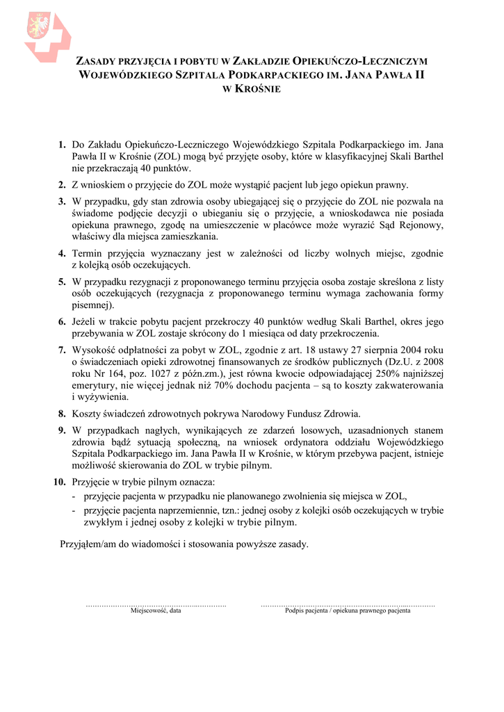 ZASADY PRZYJĘCIA I POBYTU W ZAKŁADZIE OPIEKUŃCZO-LECZNICZYM WOJEWÓDZKIEGO SZPITALA PODKARPACKIEGO IM . JANA PAWŁA II W K ROŚNIE 1. Do Zakładu Opiekuńczo-Leczniczego Wojewódzkiego Szpitala Podkarpackiego im. Jana Pawła II w Krośnie (ZOL) mogą być przyjęte osoby, które w klasyfikacyjnej Skali Barthel nie przekraczają 40 punktów. 2. Z wnioskiem o przyjęcie do ZOL może wystąpić pacjent lub jego opiekun prawny. 3. W przypadku, gdy stan zdrowia osoby ubiegającej się o przyjęcie do ZOL nie pozwala na świadome podjęcie decyzji o ubieganiu się o przyjęcie, a wnioskodawca nie posiada opiekuna prawnego, zgodę na umieszczenie w placówce może wyrazić Sąd Rejonowy, właściwy dla miejsca zamieszkania. 4. Termin przyjęcia wyznaczany jest w zależności od liczby wolnych miejsc, zgodnie z kolejką osób oczekujących. 5. W przypadku rezygnacji z proponowanego terminu przyjęcia osoba zostaje skreślona z listy osób oczekujących (rezygnacja z proponowanego terminu wymaga zachowania formy pisemnej). 6. Jeżeli w trakcie pobytu pacjent przekroczy 40 punktów według Skali Barthel, okres jego przebywania w ZOL zostaje skrócony do 1 miesiąca od daty przekroczenia. 7. Wysokość odpłatności za pobyt w ZOL, zgodnie z art. 18 ustawy 27 sierpnia 2004 roku o świadczeniach opieki zdrowotnej finansowanych ze środków publicznych (Dz.U. z 2008 roku Nr 164, poz. 1027 z późn.zm.), jest równa kwocie odpowiadającej 250% najniższej emerytury, nie więcej jednak niż 70% dochodu pacjenta – są to koszty zakwaterowania i wyżywienia. 8. Koszty świadczeń zdrowotnych pokrywa Narodowy Fundusz Zdrowia. 9. W przypadkach nagłych, wynikających ze zdarzeń losowych, uzasadnionych stanem zdrowia bądź sytuacją społeczną, na wniosek ordynatora oddziału Wojewódzkiego Szpitala Podkarpackiego im. Jana Pawła II w Krośnie, w którym przebywa pacjent, istnieje możliwość skierowania do ZOL w trybie pilnym. 10. Przyjęcie w trybie pilnym oznacza: - przyjęcie pacjenta w przypadku nie planowanego zwolnienia się miejsca w ZOL, - przyjęcie pacjenta naprzemiennie, tzn.: jednej osoby z kolejki osób oczekujących w trybie zwykłym i jednej osoby z kolejki w trybie pilnym. Przyjąłem/am do wiadomości i stosowania powyższe zasady. …………………………………………..…………. Miejscowość, data ………………………………………………………..…………. Podpis pacjenta / opiekuna prawnego pacjenta