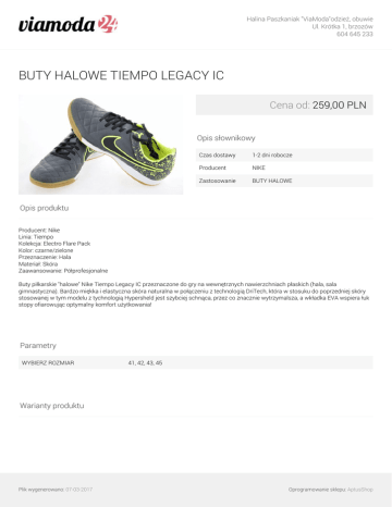 Halina Paszkaniak "ViaModa"odzież, obuwie Ul. Krótka 1, brzozów 604 645 233 BUTY HALOWE TIEMPO LEGACY IC Cena od: 259,00 PLN Opis słownikowy Czas dostawy 1-2 dni robocze Producent NIKE Zastosowanie BUTY HALOWE Opis produktu Producent: Nike Linia: Tiempo Kolekcja: Electro Flare Pack Kolor: czarne/zielone Przeznaczenie: Hala Materiał: Skóra Zaawansowanie: Półprofesjonalne Buty piłkarskie "halowe" Nike Tiempo Legacy IC przeznaczone do gry na wewnętrznych nawierzchniach płaskich (hala, sala gimnastyczna). Bardzo miękka i elastyczna skóra naturalna w połączeniu z technologią DriTech, która w stosuku do poprzedniej skóry stosowanej w tym modelu z tychnologią Hypersheld jest szybciej schnąca, przez co znacznie wytrzymalsza, a wkładka EVA wspiera łuk stopy ofiarowując optymalny komfort użytkowania! Parametry WYBIERZ ROZMIAR 41, 42, 43, 45 Warianty produktu Plik wygenerowano: 07-03-2017 Oprogramowanie sklepu: AptusShop Halina Paszkaniak "ViaModa"odzież, obuwie Ul. Krótka 1, brzozów 604 645 233 HALÓWKI NIKE TIEMPO 259,00 PLN 631522-007 rozmiary 41,42,43,45 Galeria Plik wygenerowano: 07-03-2017 Powered by TCPDF (www.tcpdf.org) Oprogramowanie sklepu: AptusShop