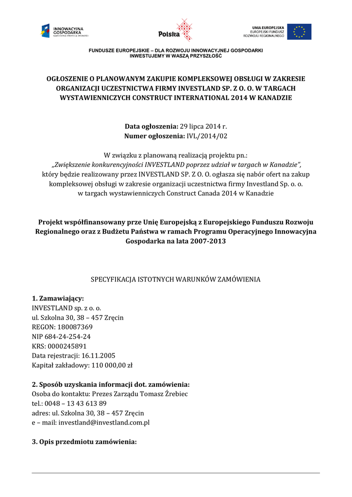 FUNDUSZE EUROPEJSKIE – DLA ROZWOJU INNOWACYJNEJ GOSPODARKI INWESTUJEMY W WASZĄ PRZYSZŁOŚĆ OGŁOSZENIE O PLANOWANYM ZAKUPIE KOMPLEKSOWEJ OBSŁUGI W ZAKRESIE ORGANIZACJI UCZESTNICTWA FIRMY INVESTLAND SP. Z O. O. W TARGACH WYSTAWIENNICZYCH CONSTRUCT INTERNATIONAL 2014 W KANADZIE Data ogłoszenia: 29 lipca 2014 r. Numer ogłoszenia: IVL/2014/02 W związku z planowaną realizacją projektu pn.: „Zwiększenie konkurencyjności INVESTLAND poprzez udział w targach w Kanadzie”, który będzie realizowany przez INVESTLAND SP. Z O. O. ogłasza się nabór ofert na zakup kompleksowej obsługi w zakresie organizacji uczestnictwa firmy Investland Sp. o. o. w targach wystawienniczych Construct Canada 2014 w Kanadzie Projekt współfinansowany prze Unię Europejską z Europejskiego Funduszu Rozwoju Regionalnego oraz z Budżetu Państwa w ramach Programu Operacyjnego Innowacyjna Gospodarka na lata 2007-2013 SPECYFIKACJA ISTOTNYCH WARUNKÓW ZAMÓWIENIA 1. Zamawiający: INVESTLAND sp. z o. o. ul. Szkolna 30, 38 – 457 Zręcin REGON: 180087369 NIP 684-24-254-24 KRS: 0000245891 Data rejestracji: 16.11.2005 Kapitał zakładowy: 110 000,00 zł 2. Sposób uzyskania informacji dot. zamówienia: Osoba do kontaktu: Prezes Zarządu Tomasz Źrebiec tel.: 0048 – 13 43 613 89 adres: ul. Szkolna 30, 38 – 457 Zręcin e – mail: [email protected] 3. Opis przedmiotu zamówienia: FUNDUSZE EUROPEJSKIE – DLA ROZWOJU INNOWACYJNEJ GOSPODARKI INWESTUJEMY W WASZĄ PRZYSZŁOŚĆ Przedmiotem zamówienia jest kompleksowa usługa w zakresie realizacji udziału firmy Investland w targach w ramach projektu „Zwiększenie konkurencyjności INVESTLAND poprzez udział w targach w Kanadzie”, w szczególności: 3.1. 3.2. 3.3. 3.4. 3.5. 3.6. 3.7. 3.8. 3.9. 3.10. 3.11. 3.12. 3.13. 3.14. 3.15. 3.16. 3.17. 3.18. 3.19. Organizacja przelotu (bilety lotnicze dla trzech przedstawicieli Zamawiającego uczestniczących w targach) Organizacja noclegu dla trzech przedstawicieli Zamawiającego uczestniczących w targach, w okresie jeden dzień przed rozpoczęciem Wynajem powierzchni wystawienniczej Wynajem zabudowy powierzchni wystawienniczej Obsługa techniczna w obrębie powierzchni wystawienniczej Wpis do katalogu targowego, pokrycie opłat rejestracyjnych Transport i spedycja eksponatów wraz z ubezpieczeniem i odprawą celną Organizacja pokazów, prezentacji produktów Organizacja udziału w spotkaniach bilateralnych i wyjazdach studyjnych Organizacja udziału zamawiającego w szkoleniach Tłumaczenie symultaniczne lub konsekutywne Produkcja i emisja reklamy w mediach targowych Przygotowanie i wydruk katalogów i broszur promocyjnych oraz tłumaczenia tych materiałów Przygotowanie materiałów reklamowych Przygotowanie/ publikacja reklam i informacji prasowych Produkcja i emisja kampanii reklamowej Usługi doradcze i prawne związane z uzyskaniem wprowadzenia towarów na rynek kanadyjski Przygotowanie i tłumaczenie dokumentacji technicznej Promocja programu 4. Kryteria oceny ofert: 4.1 Cena – 100% 5. Miejsce i termin składania ofert: 5.1. Adres siedziby: ul. Szkolna 30, 38 – 457 Zręcin 5.2. Termin: do 11.08.2014 r. 5.3. Oferty w formie pisemnej należy składać osobiście lub drogą pocztową na adres siedziby spółki „INVESTLAND Sp. z o.o. Oferta powinna zostać umieszczona w zamkniętej kopercie, na której będą znajdować się dane adresowe Oferenta (pieczęć FUNDUSZE EUROPEJSKIE – DLA ROZWOJU INNOWACYJNEJ GOSPODARKI INWESTUJEMY W WASZĄ PRZYSZŁOŚĆ firmowa w prawym górnym rogu koperty), Zamawiającego oraz adnotacja: „Konkurs ofert na zakup kompleksowej obsługi w zakresie organizacji uczestnictwa firmy Investland Sp. z o. o. w targach wystawienniczych CONSTRUCT CANADA 2014 w Kanadzie do projektu pn. „Zwiększenie konkurencyjności INVESTLAND poprzez udział w targach w Kanadzie”. Nie otwierać przed dniem 11.08.2014 r., godz. 12.00.” 6. Pozostałe informacje: 6.1. Oferty muszą zawierać: - nazwę i adres Oferenta - datę sporządzenia oferty, - opis nawiązujący do przedmiotu oferty i kryteriów wyszczególnionych w zapytaniu ofertowym - ceny za realizację poszczególnych działań wymienionych w punkcie 3 niniejszego Zapytania Ofertowego oraz wartość całkowitą oferty - warunki i terminy płatności - termin ważności oferty - oświadczenie dotyczące posiadania wiedzy i doświadczenia umożliwiającego realizację zamówienia - podpis osoby lub osób uprawnionych do reprezentowania Oferenta wraz z pieczątką imienną lub służbową i firmową. Z wybranym w postępowaniu Oferentem zostanie podpisana umowa wykonawstwa. 6.2. Nie dopuszcza się składania ofert cząstkowych 6.3. Nie dopuszcza się składania ofert warunkowych i wariantowych 6.4. Wszelkie koszty związane z udziałem Oferenta w niniejszym postępowaniu ponosi Oferent. 6.5. Wybór dostawców nastąpi w oparciu o najbardziej korzystne ekonomicznie oferty w oparciu o punkt 4. niniejszego ogłoszenia – Kryteria oceny ofert, z zachowaniem zasad jawności, przejrzystości i uczciwej konkurencji. 6.6. Zamawiający zastrzega sobie prawo do rezygnacji z części zamówienia, o czym poinformuje Wykonawcę, z którym podpisze umowę, niezwłocznie po wystąpieniu okoliczności powodujących taka decyzję. 6.7. Ewentualne zmiany w harmonogramie realizacji zamówienia niezależne od Zamawiającego, a podyktowane na przykład zmianami wprowadzonymi przez organizatora imprezy wystawienniczej muszą być respektowane przed Wykonawcę. Wykonawca zostanie pisemnie poinformowany o ww. zmianach niezwłocznie po ich pojawieniu się. FUNDUSZE EUROPEJSKIE – DLA ROZWOJU INNOWACYJNEJ GOSPODARKI INWESTUJEMY W WASZĄ PRZYSZŁOŚĆ Załączniki: 1) Szczegółowa specyfikacja i opis zakresu zamówienia 2) Proponowany wzór składanej Oferty Z poważaniem ZARZĄD INVESTLAND SP. Z O. O.