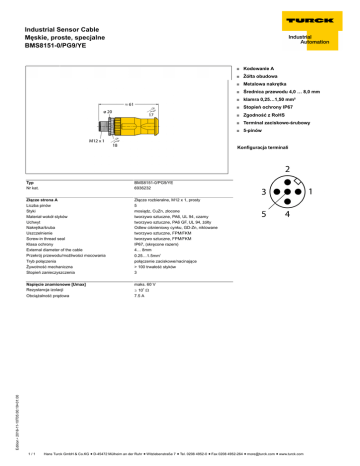 Industrial Sensor Cable Męskie, proste, specjalne BMS8151-0/PG9/YE ■ Kodowanie A ■ Żółta obudowa ■ Metalowa nakrętka ■ Średnica przewodu 4,0 … 8,0 mm ■ klamra 0,25…1,50 mm² ■ Stopień ochrony IP67 ■ Zgodność z RoHS ■ Terminal zaciskowo-śrubowy ■ 5-pinów Konfiguracja terminali Typ Nr kat. BMS8151-0/PG9/YE 6936232 Złącze strona A Liczba pinów Styki Materiał wokół styków Uchwyt Nakrętka/śruba Uszczelnienie Screw-in thread seal Klasa ochrony External diameter of the cable Przekrój przewodu/możliwości mocowania Złącze rozbieralne, M12 x 1, prosty 5 mosiądz, CuZn, złocone tworzywo sztuczne, PA6, UL 94, czarny tworzywo sztuczne, PA6 GF, UL 94, żółty Odlew ciśnieniowy cynku, GD-Zn, niklowane tworzywo sztuczne, FPM/FKM tworzywo sztuczne, FPM/FKM IP67, (skręcone razem) 4… 8mm Tryb połączenia Żywotność mechaniczna Stopień zanieczyszczenia Napięcie znamionowe [Umax] Rezystancja izolacji 2 maks. 60 V ï 10 ò 7.5 A 8 Edition • 2016-11-10T05:00:19+01:00 Obciążalność prądowa 0.25…1.5mm połączenie zaciskowe/nacinające > 100 trwałość styków 3 1/1 Hans Turck GmbH & Co.KG ñ D-45472 Mülheim an der Ruhr ñ Witzlebenstraße 7 ñ Tel. 0208 4952-0 ñ Fax 0208 4952-264 ñ [email protected] ñ www.turck.com