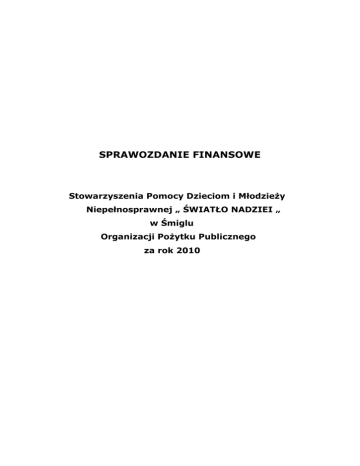 SPRAWOZDANIE FINANSOWE Stowarzyszenia Pomocy Dzieciom i Młodzieży Niepełnosprawnej „ ŚWIATŁO NADZIEI „ w Śmiglu Organizacji Pożytku Publicznego za rok 2010 Sprawozdanie składa się z: I. Wprowadzenia II. Bilansu III. Rachunku wyników IV. Informacji dodatkowej Wprowadzenie do sprawozdania finansowego za 2010 rok 1. Nazwa, siedziba i adres organizacji: Stowarzyszenie Pomocy Dzieciom i Młodzieży Niepełnosprawnej „Światło Nadziei” ul. Kościuszki 20, 64-030 Śmigiel 2. Podstawowy przedmiot działalności wg PKD: 8899Z Działalność pozostałych organizacji członkowskich, gdzie indziej niesklasyfikowana 3. Wskazanie właściwego sądu prowadzącego rejestr lub innego organu prowadzącego rejestr, data wpisu, numer w ewidencji oraz statystyczny numer identyfikacyjny w systemie REGON, NIP: Sąd: Sąd Rejonowy Poznań- Nowe Miasto i Wilda IX Wydział Gospodarczy KRS Data wpisu: 06.03.2002 r Nr KRS: 0000095767 REGON: 411482386 Nr NIP: 698-16-92-293 Wpis do Krajowego Rejestru Sądowego 30 grudnia 2008 roku jako organizacja pożytku publicznego 4. Dane dotyczące członków zarządu (imię i nazwisko oraz funkcja): Prezes - Małgorzata Adamczak Zastępca Prezesa - Elżbieta Kaźmierczak Sekretarz - Barbara Kuderska Skarbnik - Magdalena Perekietka Członkowie zarządu: Wojciech Ciesielski Monika Hertmanowska Eugeniusz Kurasiński Komisja Rewizyjna: Teresa Borowska Anna Dziwak Justyna Ziegler 5. Określenie celów statutowych organizacji: Celem stowarzyszenia jest: opieka nad dziećmi chorymi i niepełnosprawnymi oraz nad ich rodzinami, rozwijanie wszechstronnej pomocy dzieciom i młodzieży niepełnosprawnej w ich rozwoju, samorealizacji i adaptacji życiowej, upowszechnianie problematyki przystosowania dzieci i młodzieży niepełnosprawnej do życia społecznego, popularyzowanie stosownych form rehabilitacji i rewalidacji dzieci i młodzieży niepełnosprawnej, wspieranie inicjatyw zmierzających do minimalizowania niepełnosprawności dzieci i młodzieży, upowszechnianie społecznego wspomagania opieki nad dziećmi i młodzieżą niepełnosprawną, upowszechnianie idei integracji rozwojowej, zawodowej i kulturowej dzieci i młodzieży niepełnosprawnej ze środowiskiem społecznym osób pełnosprawnych przełamywanie stereotypów obyczajowych dotyczących roli dzieci i młodzieży niepełnosprawnej w środowisku społecznym. 6. Wskazanie okresu trwania działalności organizacji, jeśli jest on ograniczony w statucie: Stowarzyszenie zostaje powołane na czas nieokreślony. 7. Wskazanie okresu objętego sprawozdaniem finansowym: Roczne sprawozdanie finansowe za okres od 01.01.2010 do 31.12.2010 - rok obrotowy pokrywa się z kalendarzowym. 8. Wskazanie, że sprawozdanie finansowe zawiera dane łącznie, jeżeli w skład organizacji wchodzą wewnętrzne jednostki organizacyjne sporządzające samodzielnie sprawozdania finansowe: Roczne sprawozdanie finansowe obejmuje dane Stowarzyszenia „ Światło Nadziei” oraz jednej wchodzącej w jego skład jednostki organizacyjnej, która nie sporządza samodzielnie sprawozdania finansowego. Stowarzyszenie prowadzi Warsztaty Terapii Zajęciowej dla 30 absolwentów kształcenia specjalnego 9. Wskazanie czy sprawozdani finansowe zostało sporządzone przy założeniu kontynuowania działalności przez organizację w dającej się przewidzieć przyszłości oraz czy nie istnieją okoliczności wskazujące na powyższe zagrożenia dla kontynuowania przez nią działalności: Roczne sprawozdanie sporządzono przy założeniu kontynuowania działalności przez organizację, co najmniej 12 miesięcy i dłużej. Nie są nam znane okoliczności, które wskazywałyby na istnienie poważnych zagrożeń dla kontynuowania przez organizację działalności. 10. Omówienie przyjętych zasad (polityki) rachunkowości, w tym metod wyceny aktywów i pasywów (także amortyzacji), pomiaru wyniku finansowego oraz sposobu sporządzania sprawozdania finansowego w zakresie, w jakim ustawa pozostawiła jednostce prawo wyboru: Księgi rachunkowe prowadzone są we własnym zakresie. Ewidencję księgową prowadzono metodą komputerową za pomocą programu REWIZOR (Windows). Sprawozdanie finansowe zostało przygotowane zgodnie z przepisami ustawy z dnia 29 września 1994 r o rachunkowości (tekst jednolity Dz.U. nr 76 z 2002 r., poz. 694 z późniejszymi zmianami) oraz rozporządzenia Ministra Finansów z dnia 15 listopada 2001 roku w sprawie szczegółowych zasad rachunkowości dla niektórych jednostek nie będących spółkami handlowymi, nie prowadzącymi działalności gospodarczej (Dz.U. nr 137 z 2001 r., poz. 1539) Przyjęte zasady (politykę) rachunkowości stosuje się w sposób ciągły, dokonując w kolejnych latach obrotowych jednakowego grupowania operacji gospodarczych, jednakowej wyceny aktywów i pasywów ( w tym także dokonywania odpisów amortyzacyjnych i umorzeniowych), ustala się wynik finansowy i sporządza sprawozdanie finansowe tak, aby za kolejne lata informacje z nich wynikające były porównywalne. Podstawowe zasady wyceny aktywów i pasywów Zasady wyceny aktywów i pasywów w ciągu roku obrotowego 1) Środki trwałe – wg cen nabycia lub kosztu wytworzenia. 2) Wartości niematerialne i prawne - wg cen nabycia lub kosztu wytworzenia. 3) Należności i zobowiązania – wg wartości nominalnej. Należności i zobowiązania w walucie polskiej wykazywane są według wartości podlegającej zapłacie. Wyrażone w walutach obcych operacje gospodarcze ujmuje się w księgach rachunkowych na dzień ich przeprowadzenia po kursie: · kupna lub sprzedaży walut stosowanych przez bank, z którego usług korzysta Stowarzyszenie – w przypadku operacji sprzedaży lub kupna walut oraz operacji zapłaty należności lub zobowiązań · średnim ustalonym dla danej waluty przez Narodowy Bank Polski na ten dzień – w przypadku pozostałych operacji 4) Środki pieniężne - wg wartości nominalnej. 5) Rozliczenia międzyokresowe czynne - wg k