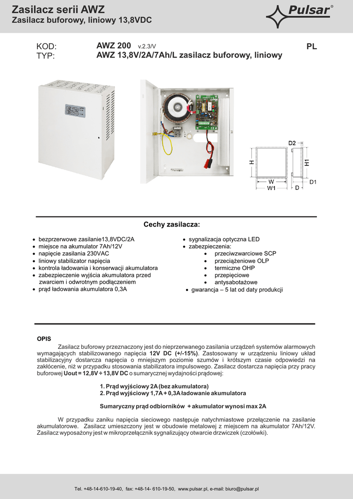 Zasilacz serii AWZ Zasilacz buforowy, liniowy 13,8VDC KOD: TYP: AWZ 200 v.2.3/V AWZ 13,8V/2A/7Ah/L zasilacz buforowy, liniowy PL Cechy zasilacza: bezprzerwowe zasilanie13,8VDC/2A miejsce na akumulator 7Ah/12V napięcie zasilania 230VAC liniowy stabilizator napięcia kontrola ładowania i konserwacji akumulatora zabezpieczenie wyjścia akumulatora przed zwarciem i odwrotnym podłączeniem · prąd ładowania akumulatora 0,3A · · · · · · · sygnalizacja optyczna LED · zabezpieczenia: · przeciwzwarciowe SCP · przeciążeniowe OLP · termiczne OHP · przepięciowe · antysabotażowe · gwarancja – 5 lat od daty produkcji OPIS Zasilacz buforowy przeznaczony jest do nieprzerwanego zasilania urządzeń systemów alarmowych wymagających stabilizowanego napięcia 12V DC (+/-15%). Zastosowany w urządzeniu liniowy układ stabilizacyjny dostarcza napięcia o mniejszym poziomie szumów i krótszym czasie odpowiedzi na zakłócenie, niż w przypadku stosowania stabilizatora impulsowego. Zasilacz dostarcza napięcia przy pracy buforowej Uout = 12,8V ÷ 13,8V DC o sumarycznej wydajności prądowej: 1. Prąd wyjściowy 2A (bez akumulatora) 2. Prąd wyjściowy 1,7A + 0,3A ładowanie akumulatora Sumaryczny prąd odbiorników + akumulator wynosi max 2A W przypadku zaniku napięcia sieciowego następuje natychmiastowe przełączenie na zasilanie akumulatorowe. Zasilacz umieszczony jest w obudowie metalowej z miejscem na akumulator 7Ah/12V. Zasilacz wyposażony jest w mikroprzełącznik sygnalizujący otwarcie drzwiczek (czołówki). Tel. +48-14-610-19-40, fax: +48-14- 610-19-50, www.pulsar.pl, e-mail: [email protected] Zasilacz serii AWZ Zasilacz buforowy, liniowy 13,8VDC DANE TECHNICZNE Typ zasilacza: Zasilanie: Pobór prądu: Moc zasilacza: Napięcie wyjściowe: Prąd wyjściowy: Zakres regulacji napięcia wyjściowego: Napięcie tętnienia: Prąd ładowania akumulatora: Zabezpieczenie przed zwarciem SCP: Zabezpieczenie przed przeciążeniem OLP: Zabezpieczenie w obwodzie akumulatora SCP i odwrotna polaryzacja podłączenia: Wyjście techniczne: - TAMPER; wyjście sygnalizujące otwarcie obudowy zasilacza Warunki pracy: Obudowa: Wymiary: Waga netto/brutto: Miejsce na akumulator: Zamykanie: Uwagi: A (EPS - External Power Source) 230V AC 50Hz (-10%/+10%) 0,28A 28W 12,8V ÷ 13,8V DC – praca buforowa 2A (bez akumulatora) 1,7A + 0,3A ładowanie akumulatora 12V÷14,5V DC 20mV p-p max. 1,4A 0,3A/24h 200% ÷ 250% mocy zasilacza - ograniczenie prądu i/lub uszkodzenie bezpiecznika topikowego w obwodzie akumulatora (wymaga wymiany wkładki topikowej) 110% ÷ 150% (@25ºC) mocy zasilacza - ograniczenie prądu poprzez bezpiecznik powracalny PTC, ponowne uruchomienie ręczne (awaria wymaga odłączenie obwodu wyjściowego DC) F4A- ograniczenie prądu, bezpiecznik topikowy FBAT (awaria wymaga wymiany wkładki topikowej) - mikrowyłącznik , styki NC (obudowa zamknięta), 0,5A@50V DC (max.) II klasa środowiskowa, -10 oC ÷ 40 oC Blacha stalowa DC01 0,8mm, kolor RAL9003 205 x 235 x 88 [mm] (WxHxD) 2,5 / 2,6kg 7Ah/12V Wkręt walcowy (z czoła) Obudowa posiada dystans od podłoża montażowego w celu prowadzenia okablowania. Chłodzenie konwekcyjne. Tel. +48-14-610-19-40, fax: +48-14- 610-19-50, www.pulsar.pl, e-mail: [email protected]