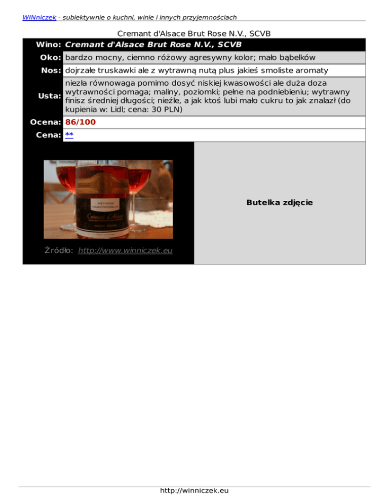 WINniczek - subiektywnie o kuchni, winie i innych przyjemnościach Cremant d'Alsace Brut Rose N.V., SCVB Wino: Cremant d'Alsace Brut Rose N.V., SCVB Oko: bardzo mocny, ciemno różowy agresywny kolor; mało bąbelków Nos: dojrzałe truskawki ale z wytrawną nutą plus jakieś smoliste aromaty niezła równowaga pomimo dosyć niskiej kwasowości ale duża doza wytrawności pomaga; maliny, poziomki; pełne na podniebieniu; wytrawny Usta: finisz średniej długości; nieźle, a jak ktoś lubi mało cukru to jak znalazł (do kupienia w: Lidl; cena: 30 PLN) Ocena: 86/100 Cena: ** Butelka zdjęcie Źródło: http://www.winniczek.eu http://winniczek.eu