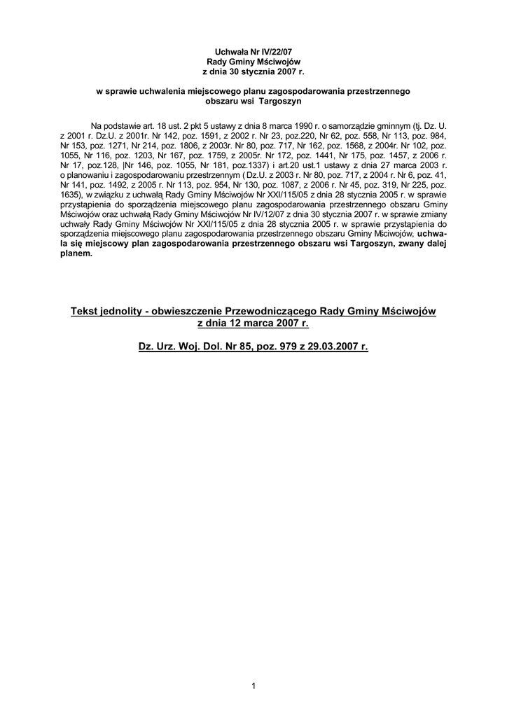 Uchwała Nr IV/22/07 Rady Gminy Mściwojów z dnia 30 stycznia 2007 r. w sprawie uchwalenia miejscowego planu zagospodarowania przestrzennego obszaru wsi Targoszyn Na podstawie art. 18 ust. 2 pkt 5 ustawy z dnia 8 marca 1990 r. o samorządzie gminnym (tj. Dz. U. z 2001 r. Dz.U. z 2001r. Nr 142, poz. 1591, z 2002 r. Nr 23, poz.220, Nr 62, poz. 558, Nr 113, poz. 984, Nr 153, poz. 1271, Nr 214, poz. 1806, z 2003r. Nr 80, poz. 717, Nr 162, poz. 1568, z 2004r. Nr 102, poz. 1055, Nr 116, poz. 1203, Nr 167, poz. 1759, z 2005r. Nr 172, poz. 1441, Nr 175, poz. 1457, z 2006 r. Nr 17, poz.128, |Nr 146, poz. 1055, Nr 181, poz.1337) i art.20 ust.1 ustawy z dnia 27 marca 2003 r. o planowaniu i zagospodarowaniu przestrzennym ( Dz.U. z 2003 r. Nr 80, poz. 717, z 2004 r. Nr 6, poz. 41, Nr 141, poz. 1492, z 2005 r. Nr 113, poz. 954, Nr 130, poz. 1087, z 2006 r. Nr 45, poz. 319, Nr 225, poz. 1635), w związku z uchwałą Rady Gminy Mściwojów Nr XXI/115/05 z dnia 28 stycznia 2005 r. w sprawie przystąpienia do sporządzenia miejscowego planu zagospodarowania przestrzennego obszaru Gminy Mściwojów oraz uchwałą Rady Gminy Mściwojów Nr IV/12/07 z dnia 30 stycznia 2007 r. w sprawie zmiany uchwały Rady Gminy Mściwojów Nr XXI/115/05 z dnia 28 stycznia 2005 r. w sprawie przystąpienia do sporządzenia miejscowego planu zagospodarowania przestrzennego obszaru Gminy Mściwojów, uchwala się miejscowy plan zagospodarowania przestrzennego obszaru wsi Targoszyn, zwany dalej planem. Tekst jednolity - obwieszczenie Przewodniczącego Rady Gminy Mściwojów z dnia 12 marca 2007 r. Dz. Urz. Woj. Dol. Nr 85, poz. 979 z 29.03.2007 r. 1