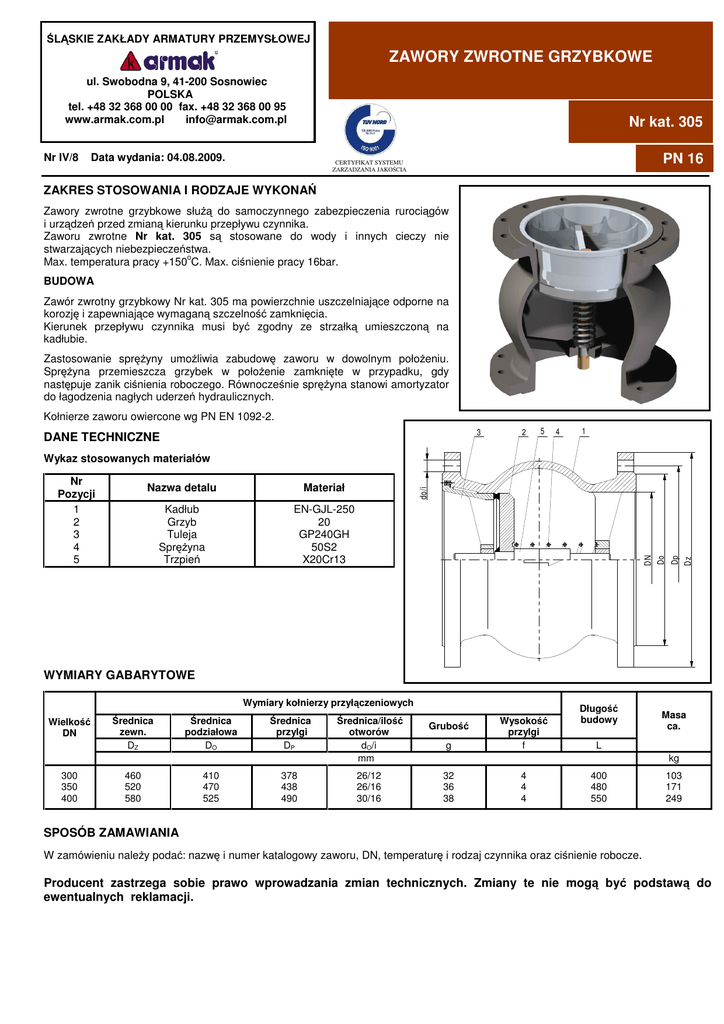 L SKIE ZAKŁADY ARMATURY PRZEMYSŁOWEJ ZAWORY ZWROTNE GRZYBKOWE ul. Swobodna 9, 41-200 Sosnowiec POLSKA tel. +48 32 368 00 00 fax. +48 32 368 00 95 www.armak.com.pl [email protected] Nr IV/8 Nr kat. 305 Data wydania: 04.08.2009. PN 16 CERTYFIKAT SYSTEMU ZARZ DZANIA JAKO CI ZAKRES STOSOWANIA I RODZAJE WYKONA Zawory zwrotne grzybkowe słu do samoczynnego zabezpieczenia ruroci gów i urz dze przed zmian kierunku przepływu czynnika. Zaworu zwrotne Nr kat. 305 s stosowane do wody i innych cieczy nie stwarzaj cych niebezpiecze stwa. o Max. temperatura pracy +150 C. Max. ci nienie pracy 16bar. BUDOWA Zawór zwrotny grzybkowy Nr kat. 305 ma powierzchnie uszczelniaj ce odporne na korozj i zapewniaj ce wymagan szczelno zamkni cia. Kierunek przepływu czynnika musi by zgodny ze strzałk umieszczon na kadłubie. Zastosowanie spr yny umo liwia zabudow zaworu w dowolnym poło eniu. Spr yna przemieszcza grzybek w poło enie zamkni te w przypadku, gdy nast puje zanik ci nienia roboczego. Równocze nie spr yna stanowi amortyzator do łagodzenia nagłych uderze hydraulicznych. Kołnierze zaworu owiercone wg PN EN 1092-2. 3 DANE TECHNICZNE 2 5 4 1 Materiał Kadłub Grzyb Tuleja Spr yna Trzpie EN-GJL-250 20 GP240GH 50S2 X20Cr13 Dp Dz Nazwa detalu DN Do Nr Pozycji 1 2 3 4 5 do/i Wykaz stosowanych materiałów WYMIARY GABARYTOWE Wymiary kołnierzy przył czeniowych Wielko DN 300 350 400 rednica zewn. DZ 460 520 580 rednica podziałowa DO 410 470 525 rednica przylgi DP 378 438 490 rednica/ilo otworów dO/i mm 26/12 26/16 30/16 Grubo g Wysoko przylgi f Długo budowy Masa ca. L kg 32 36 38 4 4 4 400 480 550 103 171 249 SPOSÓB ZAMAWIANIA W zamówieniu nale y poda : nazw i numer katalogowy zaworu, DN, temperatur i rodzaj czynnika oraz ci nienie robocze. Producent zastrzega sobie prawo wprowadzania zmian technicznych. Zmiany te nie mog ewentualnych reklamacji. by podstaw do