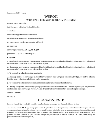 Sygnatura akt I C 744/15 WYROK W IMIENIU RZECZYPOSPOLITEJ POLSKIEJ Dnia 26 lutego 2016 roku Sąd Okręgowy w Koninie Wydział I Cywilny w składzie: Przewodniczący: SSO Mariola Klimczak Protokolant: p.o. sekr. sąd. Jarosław Wróblewski po rozpoznaniu w dniu 19-02-2016 r. w Koninie na rozprawie sprawy z powództwa A. B. (1), M. B. (1) przeciwko (...) S.A. z siedzibą w Ł. o zapłatę 1. Zasądza od pozwanego na rzecz powoda M. B. (2) kwotę 25.000 (dwadzieścia pięć tysięcy) złotych, z odsetkami ustawowymi od dnia 26.03.2009 roku do dnia zapłaty. 2. Zasądza od pozwanego na rzecz powódki A. B. (2) kwotę 25.000 (dwadzieścia pięć tysięcy) złotych, z odsetkami ustawowymi od dnia 26.03.2009 roku do dnia zapłaty. 3. W pozostałym zakresie powództwo oddala. 4. Nakazuje pobrać od pozwanego na rzecz Skarbu Państwa (Sąd Okręgowy w Koninie) kwotę 2.500 złotych tytułem kosztów sądowych, od uwzględnionej części roszczenia. 5. W pozostałym zakresie nieuiszczonymi kosztami sądowymi obciąża Skarb Państwa. 6. Koszty zastępstwa procesowego pomiędzy stronami stosunkowo rozdziela i wobec tego zasądza od powodów solidarnie na rzecz pozwanego kwotę 1.766,80 złotych tytułem zwrotu kosztów zastępstwa procesowego. Mariola Klimczak I C 744/15 UZASADNIENIE Powodowie A. B. (1) i M. B. (1) wnieśli o zasądzenie od pozwanego (...) S.A. z siedzibą w Ł. i tak: - na rzecz powoda M. B. (1) kwoty 30.000,00 zł. ( tytułem zadośćuczynienia), z odsetkami ustawowymi od dnia 7.03.2009 roku do dnia zapłaty, kwoty 30.000,00 zł (tytułem odszkodowania za znaczne pogorszenie sytuacji życiowej powoda), z odsetkami ustawowymi od dnia 7.03.2009 roku do dnia zapłaty oraz zasądzenie od pozwanego na rzecz powoda kosztów procesu, w tym kosztów zastępstwa procesowego w kwocie 7.200,00 zł i opłaty skarbowej od pełnomocnictwa w kwocie 17,00 zł, - na rzecz powódki A. B. (1) kwoty 30.000,00 zł. ( tytułem zadośćuczynienia), z odsetkami ustawowymi od dnia 7.03.2009 roku do dnia zapłaty, kwoty 30.000,00 zł (tytułem odszkodowania za znaczne pogorszenie sytuacji życiowej powódki), z odsetkami ustawowymi od dnia 7.03.2009 roku do dnia zapłat oraz zasądzenie od pozwanego na rzecz powoda kosztów procesu, w tym kosztów zastępstwa procesowego w kwocie 7.200,00 zł i opłaty skarbowej od pełnomocnictwa w kwocie 17,00 zł. W uzasadnieniu żądania powodowie podali, że powyżej opisanego zadośćuczynienia dochodzą na podstawie art. 446 § 4 k.c. w związku z krzywdami jakich doznali w następstwie śmieci córki M. B. (3), zaś odszkodowania na podstawie art. 446 § 3 k.c. za znaczne pogorszenie ich sytuacji życiowej w następstwie śmierci córki M. B. (3), która zginęła na skutek wypadku z dnia 22.08.2008 roku. Dalej wyjaśnili, że w dniu 22.08.2008 roku w miejscowości S. miał miejsce wypadek drogowy w następstwie, którego śmierć poniosła ich córka M. B. (3). Sprawca tego wypadku w dniu zdarzenia korzystał u pozwanego z ochrony ubezpieczeniowej od odpowiedzialności cywilnej posiadaczy pojazdów mechanicznych, na podstawie zawartej umowy ubezpieczenia. Pełnomocnik powodów w dniu 29.01.2009 roku dokonał zgłoszenia szkody pozwanemu, które ponowił pismem z dnia 4.06.2009 roku. W toku postępowania likwidacji szkody powodom wypłacono kwoty po 35.000,00 zł. tytułem odszkodowania. W ocenie powodów kwoty te nie zaspokajają zgłoszonych pozwanemu roszczeń. Pozwany (...) S.A. z siedzibą w Ł., w odpowiedzi na pozew, wniósł o oddalenie powództwa i zasądzenie od powodów na jego rzecz kosztów postępowania, w tym kosztów zastępstwa procesowego według norm przepisanych i zwrotu opłaty skarbowej od pełnomocnictwa w kwocie 17,00 zł. W uzasadnieniu stanowiska podał, że w postępowaniu likwidacji szkody wypłacono powodom odszkodowanie odpowiadające zakresowi szkód, jaki ponieśli na skutek śmierci córki. Pozwany zakwestionował również zasadność zasądzenia kosztów zastępstwa procesowego w kwocie wskazanej przez pełnomocnika powodów. Pismem z dnia 11.06.2015 roku powodowie rozszerzyli żądanie pozwu o kwoty po 60.000,00 zł. na rzecz każdego z nich, dochodzonych tytułem zadośćuczynienia, podając, że po tej modyfikacji żądania obecnie wnoszą o zasądzenie od pozwanego na rzecz: - powoda M. B. (1) kwoty 90.000,00 zł. ( tytułem zadośćuczynienia), z odsetkami ustawowymi od kwoty 30.000,00 zł od dnia 7.03.2009 roku do dnia zapłaty oraz od dalszej kwoty 60.000,00 zł. od dnia rozszerzenia powództwa do dnia zapłaty i kwoty 30.000,00 zł z odsetkami ustawowymi od dnia 7.03.2009 roku do dnia zapłaty (tytułem odszkodowania za znaczne pogorszenie sytuacji życiowej powoda); - na rzecz powódki A. B. (1) kwoty 90.000,00 zł. ( tytułem zadośćuczynienia), z odsetkami ustawowymi od kwoty 30.000,00 zł od dnia 7.03.2009 roku do dnia zapłaty oraz od dalszej kwoty 60.000,00 zł. od dnia rozszerzenia powództwa do dnia zapłaty i kwoty 30.000,00 zł z odsetkami ustawowymi od dnia 7.03.2009 roku do dnia zapłaty (tytułem odszkodowania za znaczne pogorszenie sytuacji życiowej powódki), a nadto zasądzenie od pozwanego na rzecz każdego z powodów kosztów procesu, w tym kosztów zastępstwa procesowego w kwocie 7.200,00 zł i opłaty skarbowej od pełnomocnictw w kwocie po 17,00 zł. W odpowiedzi na rozszerzone żądanie pozwany wniósł o oddalenie powództwa i podtrzymał żądanie zakresie kosztów procesu. Sąd ustalił następujący stan faktyczny: W dniu 22.08.2008 roku w miejscowości S. miał miejsce wypadek drogowy w następstwie, którego córka powodów M. B. (3) doznała obrażeń ciała skutkujących jej śmiercią. Sprawca zdarzenia, doprowadzając do zderzenia z pojazdem, którym kierowała M. B. (3) (w drodze do pracy) w chwili wypadku korzystał u pozwanego z ochrony od odpowiedzialności cywilnej posiadaczy pojazdów mechanicznych, na podstawie umowy ubezpieczenia. M. B. (3) w dniu śmierci miała 22 lata. Była j