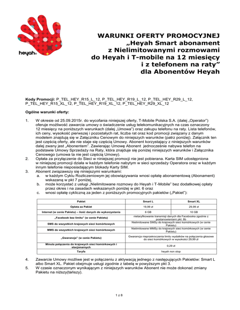 WARUNKI OFERTY PROMOCYJNEJ „Heyah Smart abonament z Nielimitowanymi rozmowami do Heyah i T-mobile na 12 miesięcy i z telefonem na raty” dla Abonentów Heyah Kody Promocji: P_TEL_HEY_R15_L_12, P_TEL_HEY_R19_L_12, P_TEL_HEY_R29_L_12, P_TEL_HEY_R15_XL_12, P_TEL_HEY_R19_XL_12, P_TEL_HEY_R29_XL_12 Ogólne warunki oferty: 1. 2. 3. W okresie od 25.09.2015r. do wycofania niniejszej oferty, T-Mobile Polska S.A. (dalej „Operator”) oferuje możliwość zawarcia umowy o świadczenie usług telekomunikacyjnych na czas oznaczony 12 miesięcy na poniższych warunkach (dalej „Umowa”) oraz zakupu telefonu na raty. Lista telefonów, ich ceny, wysokość pierwszej i pozostałych rat, liczba rat oraz kod promocji związany z danym modelem znajdują się w Załączniku Cenowym do niniejszych warunków (patrz poniżej). Załącznik ten jest częścią oferty, ale nie staje się częścią Umowy. Abonent korzystający z niniejszych warunków dalej zwany jest „Abonentem”. Zawierając Umowę Abonent jednocześnie nabywa telefon na podstawie Umowy Sprzedaży na Raty, która znajduje się poniżej niniejszych warunków i Załącznika Cenowego (umowa ta nie jest częścią Umowy). Opłata za przyłączenie do Sieci w niniejszej promocji nie jest pobierana. Karta SIM udostępniona w niniejszej promocji działa w każdym telefonie nabytym w sieci sprzedaży Operatora oraz w każdym innym telefonie nieposiadającym blokady Karty SIM. Abonent związawszy się niniejszymi warunkami: a. w każdym Cyklu Rozliczeniowym jej obowiązywania wnosi opłatę abonamentową (Abonament) wskazaną w pkt 7 poniżej, b. może korzystać z usługi „Nielimitowane rozmowy do Heyah i T-Mobile” bez dodatkowej opłaty przez okres i na zasadach wskazanych poniżej w pkt. 6 oraz c. wnosi opłatę cykliczną za jeden z poniższych promocyjnych pakietów („Pakiet”): Pakiet Smart L Smart XL Opłata za Pakiet 19,99 zł 29,99 zł Internet (w cenie Pakietu) – ilość danych do wykorzystania 6 GB 10 GB nietaryfikowanie transmisji danych dla Facebooka zgodnie z postanowieniami pkt. 8b Nielimitowane SMSy do krajowych sieci komórkowych (w cenie Pakietu) Nielimitowane MMSy do krajowych sieci komórkowych (w cenie Pakietu) „Facebook bez limitu” (w cenie Pakietu) SMS do wszystkich krajowych sieci komórkowych MMS do wszystkich krajowych sieci komórkowych 4. 5. „Gwarancja” (w cenie Pakietu) Gwarancja nieprzekroczenia limitu wydatków na połączenia głosowe do sieci komórkowych w wysokości 29,99 zł Minuta połączenia do krajowych sieci komórkowych i stacjonarnych 0,29 zł Taryfa heyah non stop Zawarcie Umowy możliwe jest w połączeniu z aktywacją jednego z następujących Pakietów: Smart L albo Smart XL. Pakiet obejmuje usługi zgodnie z tabelą w powyższym pkt 3. W czasie oznaczonym wynikającym z niniejszych warunków Abonent nie może dokonać zmiany Pakietu na niższy(tańszy). 1z8 6. 7. Świadczenie usługi „Nielimitowane rozmowy do Heyah i T-Mobile” („Usługa”) odbywa się na następujących zasadach: a. Abonent w dowolnym momencie czasu oznaczonego wynikającego z niniejszych warunków może bezpłatnie aktywować Usługę poprzez wysłanie Ekspresowego kodu *140*796#. b. Aktywacja Usługi zostanie dokonana nie później niż w ciągu 48 godzin od momentu złożenia dyspozycji aktywacji i zostanie potwierdzona wiadomością SMS wysłaną na Numer Telefonu. c. W ramach Usługi Abonent może wykonywać bezpłatnie nielimitowane krajowe połączenia głosowe na numery komórkowe Heyah i T-Mobile. Usługa nie dotyczy połączeń z Numerami Premium, Numerami bezpłatnymi, połączeń typu faksy i dane, przeniesienia połączenia, połączeń międzynarodowych i roamingowych, oraz wideo rozmowy. d. Abonent nie ponosi opłaty za Usługę przez pierwszy niepełny Cykl Rozliczeniowy, w którym doszło do jej aktywacji oraz przez kolejne pełne 12 Cykli Rozliczeniowych. W trakcie wskazanego okresu (bez opłaty za Usługę) Abonent może wielokrotnie dezaktywować Usługę, a następnie przed jego końcem ją ponownie aktywować. Dla uniknięcia wątpliwości precyzuje się, że wskazane działania Abonenta nie mają wpływu na koniec okresu zdefiniowanego w zdaniu pierwszym lit. d powyżej. e. Po zakończeniu okresu bezpłatnego wskazanego w lit. d powyżej, Usługa zostanie automatycznie przedłużona z naliczeniem opłaty za Usługę w kwocie 9,99 zł za Cykl Rozliczeniowy. Wskazana opłata rozliczana jest proporcjonalnie do liczby dni obowiązywania Usługi w Cyklu Rozliczeniowym. W przypadku ponownego aktywowania Usługi po wskazanym okresie bezpłatnym będzie naliczana opłata aktywacyjna na zasadach powyżej wskazanych. f. W dowolnym momencie Abonent może dezaktywować Usługę poprzez wysłanie bezpłatnego Ekspresowego kodu *100*796*2#. g. Status aktywnej Usługi Abonent może sprawdzić poprzez wysłanie bezpłatnego Ekspresowego kodu *100*796*1#. h. Operator może udostępnić inne sposoby aktywowania, dezaktywowania lub sprawdzenia statusu Oferty niż wskazane w niniejszych Warunkach. Informacje na ten temat dostępne są u Konsultanta w Biurze Obsługi Abonenta oraz na www.heyah.pl. i. W przypadku, gdy Abonent korzysta z usługi „Gwarancja” (w pakiecie Smart L lub Smart XL) każda aktywacja lub dezaktywacja Usługi spowoduje wyzerowanie salda wydatków zliczanych w ramach usługi „Gwarancja”. Oznacza to w szczególności, że taki Abonent w Cyklu Rozliczeniowym, w którym nastąpi aktywacja lub dezaktywacja Usługi, może ponieść wyższy koszt połączeń do krajowych sieci komórkowych niż 29,99 zł. Ponadto opłata za Usługę nie jest uwzględniana w usłudze „Gwarancja”. j. W przypadku, gdy Abonent korzysta z promocji „30 minut do wszystkich sieci” lub „120 minut do Heyah i T-Mobile” aktywacja Usługi powoduje ich dezaktywację. Włączenie jednej z wymienionych w poprzednim zdaniu promocji powoduje dezaktywację Usługi. k. Dezaktywacja Usługi zostanie dokonana 