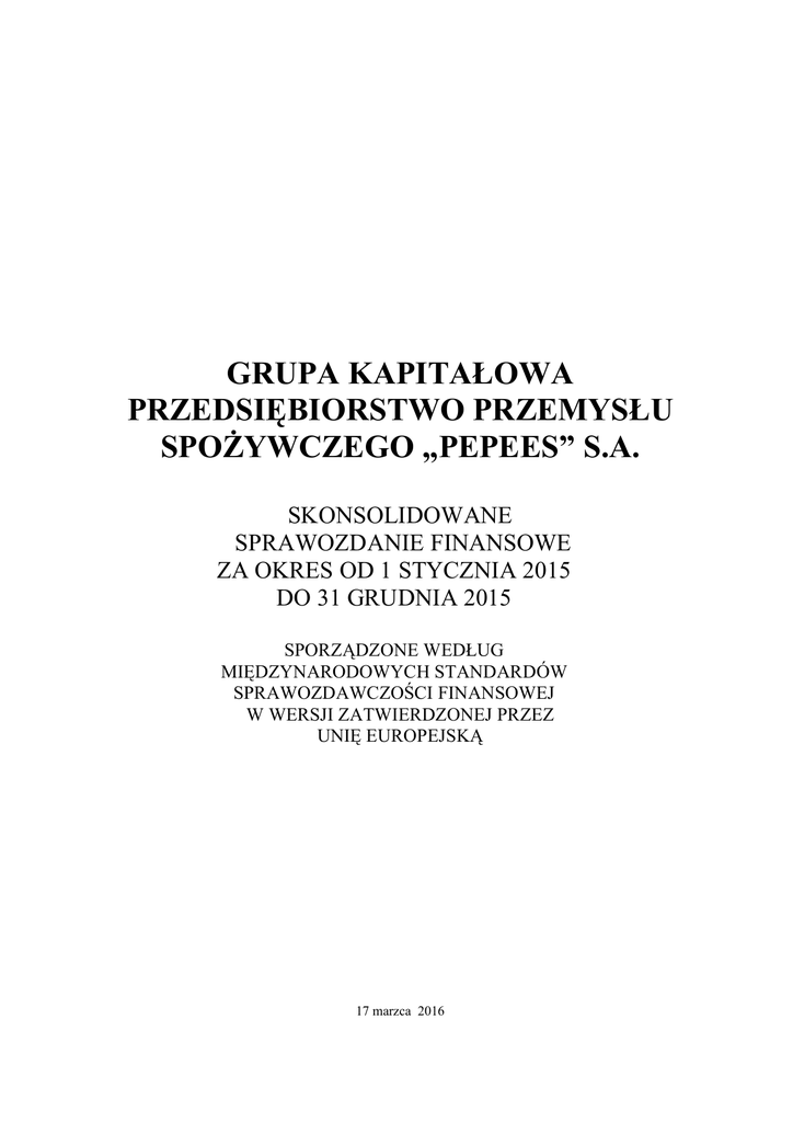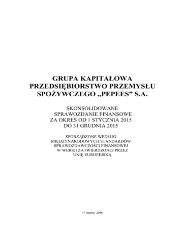 GRUPA KAPITAŁOWA PRZEDSIĘBIORSTWO PRZEMYSŁU SPOŻYWCZEGO „PEPEES” S.A. SKONSOLIDOWANE SPRAWOZDANIE FINANSOWE ZA OKRES OD 1 STYCZNIA 2015 DO 31 GRUDNIA 2015 SPORZĄDZONE WEDŁUG MIĘDZYNARODOWYCH STANDARDÓW SPRAWOZDAWCZOŚCI FINANSOWEJ W WERSJI ZATWIERDZONEJ PRZEZ UNIĘ EUROPEJSKĄ 17 marzca 2016 INDEKS DO SKONSOLIDOWANEGO SPRAWOZDANIA FINANSOWEGO SKONSOLIDOWANE SPRAWOZDANIE Z SYTUACJI FINANSOWEJ................ 5 SKONSOLIDOWANE SPRAWOZDANIE Z CAŁKOWITYCH DOCHODÓW ........ 6 SKONSOLIDOWANE SPRAWOZDANIE ZE ZMIAN W KAPITALE WŁASNYM.. 7 SKONSOLIDOWANE SPRAWOZDANIE Z PRZEPŁYWÓW PIENIĘŻNYCH............ 8 WYBRANE DANE FINANSOWE W PRZELICZENIU NA EUR ............................. 9 INFORMACJA DODATKOWA DO SKONSOLIDOWANEGO SPRAWOZDANIA FINANSOWEGO……………………………….. .................................................... 10 1. Informacje ogólne dotyczące jednostki dominującej.................................. 10 2. Informacje dotyczące okresów sprawozdawczych ..................................... 10 3. Struktura Grupy Kapitałowej ......................................................................... 11 3.1 Struktura grupy kapitałowej na dzień 31 grudnia 2015 r. .................................................................. 11 3.2 Zmiany w Grupie Kapitałowej ......................................................................................................... 11 4. Istotne zasady rachunkowości..................................................................... 12 4.1 Podstawa sporządzenia skonsolidowanego sprawozdania finansowego............................................. 12 4.2 Zmiany zasad rachunkowości .......................................................................................................... 12 4.3 Korekty błędów poprzednich okresów ............................................................................................. 12 4.4 Oświadczenie o zgodności .............................................................................................................. 12 4.5 Zasady konsolidacji ......................................................................................................................... 12 4.6 Przeliczanie pozycji wyrażonych w walucie obcej ........................................................................... 12 4.7 Rzeczowe aktywa trwałe................................................................................................................. 13 4.8 Wartości niematerialne .................................................................................................................... 13 4.9 Wartość firmy ................................................................................................................................. 14 4.10 Prawo wieczystego użytkowania gruntów ...................................................................................... 14 4.11 Nieruchomości inwestycyjne ........................................................................................................ 15 4.12 Inwestycje ..................................................................................................................................... 15 4.13 Zapasy .......................................................................................................................................... 15 4.14 Aktywa biologiczne....................................................................................................................... 16 4.15 Należności krótko- i długoterminowe............................................................................................. 16 4.16 Transakcje w walucie obcej ........................................................................................................... 16 4.17 Środki pieniężne i ekwiwalenty środków pieniężnych .................................................................... 16 4.18 Rozliczenia międzyokresowe ......................................................................................................... 16 4.19 Kapitały własne............................................................................................................................. 16 4.20 Kredyty bankowe i pożyczki.......................................................................................................... 17 4.21 Koszty finansowania zewnętrznego................................................................................................ 17 4.22 Odroczony podatek dochodowy ..................................................................................................... 17 4.23 Świadczenia pracownicze .............................................................................................................. 18 4.24 Zobowiązania z tytułu dostaw i usług............................................................................................. 18 4.25 Rezerwy........................................................................................................................................ 18 4.26 Rozliczenia międzyokresowe bierne............................................................................................... 18 4.27 Utrata wartości aktywów ............................................................................................................... 19 4.28 Leasing ........................................................................................................................................ 19 4.29 Uznawanie przychodów................................................................................................................. 19 4.30 Pozostałe przychody operacyjne .................................................................................................... 20 4.31 Dotacje państwowe........................................................................................................................ 20 4.32 Koszty operacyjne .............