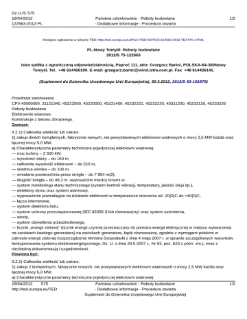 Dz.U./S S75 18/04/2012 122563-2012-PL Państwa członkowskie - Roboty budowlane - Dodatkowe informacje - Procedura otwarta 1/2 Niniejsze ogłoszenie w witrynie TED: http://ted.europa.eu/udl?uri=TED:NOTICE:122563-2012:TEXT:PL:HTML PL-Nowy Tomyśl: Roboty budowlane 2012/S 75-122563 Istra spółka z ograniczoną odpowiedzialnością, Paproć 111, attn: Grzegorz Bartol, POLSKA-64-300Nowy Tomyśl. Tel. +48 614426100. E-mail: [email protected]. Fax +48 614426141. (Suplement do Dziennika Urzędowego Unii Europejskiej, 30.3.2012, 2012/S 63-101879) Przedmiot zamówienia: CPV:45000000, 31121340, 45223500, 45220000, 45231400, 45232221, 45232220, 45311200, 45233120, 45233226 Roboty budowlane. Elektrownie wiatrowe. Konstrukcje z betonu zbrojonego. Zamiast: II.2.1) Całkowita wielkość lub zakres: 1) zakup dwóch kompletnych, fabrycznie nowych, nie powystawowych elektrowni wiatrowych o mocy 2,5 MW każda oraz łącznej mocy 5,0 MW. a) Charakterystyczne parametry techniczne pojedynczej elektrowni wiatrowej: — moc turbiny – 2 500 kW, — wysokość wieży – do 160 m, — całkowita wysokość elektrowni – do 210 m, — średnica wirnika – do 100 m, — omiatana powierzchnia przez śmigła – do 7 854 m(2), — długość śmigła – do 48,3 m. wyposażone miedzy innymi w: — system monitoringu stanu technicznego (system kontroli wibracji, temperatury, jakości oleju itp.), — detektory dymu oraz system alarmowy, — wyposażenie pozwalające na działanie elektrowni w temperaturze otoczenia od -20(0)C do +40(0)C, — łącza internetowe, — system detektora lodu, — system ochrony przeciwpiorunowej (IEC 62305-3 lub równoważny) oraz system uziemienia, — windę, — system oświetlenia przeszkodowego, — licznik „energii zielonej” (licznik energii czynnej przeznaczony do pomiaru energii elektrycznej w miejscu wytworzenia na zaciskach każdego generatora) na zaciskach generatora, bądź równoważny, zgodnie z wymogami polskimi w zakresie energii zielonej (rozporządzenie Ministra Gospodarki z dnia 4 maja 2007 r. w sprawie szczegółowych warunków funkcjonowania systemu elektroenergetycznego, Dz. U. z dnia 29.5.2007 r., Nr 93, poz. 623 z późn. zm.), wraz z niezbędną dokumentacją i uzgodnieniami. Powinno być: II.2.1) Całkowita wielkość lub zakres: 1) zakup 2 kompletnych, fabrycznie nowych, nie powystawowych elektrowni wiatrowych o mocy 2,5 MW każda oraz łącznej mocy 5,0 MW. a) Charakterystyczne parametry techniczne pojedynczej elektrowni wiatrowej: 18/04/2012 S75 http://ted.europa.eu/TED Państwa członkowskie - Roboty budowlane - Dodatkowe informacje - Procedura otwarta Suplement do Dziennika Urzędowego Unii Europejskiej 1/2 Dz.U./S S75 18/04/2012 122563-2012-PL Państwa członkowskie - Roboty budowlane - Dodatkowe informacje - Procedura otwarta 2/2 — moc turbiny – 2 500 kW, — wysokość wieży – do 160 m, — całkowita wysokość elektrowni – do 210 m, — średnica wirnika – do 101 m, — omiatana powierzchnia przez śmigła – do 7 854 m(2), wyposażone miedzy innymi w: — system monitoringu stanu technicznego (system kontroli wibracji, temperatury, jakości oleju itp.), — detektory dymu oraz system alarmowy, — wyposażenie pozwalające na działanie elektrowni w temperaturze otoczenia od -20(0)C do +40(0)C, — łącza internetowe, — system detektora lodu, — system ochrony przeciwpiorunowej (IEC 62305-3 lub równoważny) oraz system uziemienia, — windę, — system oświetlenia przeszkodowego, — licznik „energii zielonej” (licznik energii czynnej przeznaczony do pomiaru energii elektrycznej w miejscu wytworzenia na zaciskach każdego generatora) na zaciskach generatora, bądź równoważny, zgodnie z wymogami polskimi w zakresie energii zielonej (rozporządzenie Ministra Gospodarki z dnia 4.5.2007 r. w sprawie szczegółowych warunków funkcjonowania systemu elektroenergetycznego, Dz. U. z dnia 29.5.2007 r., nr 93, poz. 623 z późn. zm.), wraz z niezbędną dokumentacją i uzgodnieniami. Inne dodatkowe informacje Zmiany zostały wprowadzone do odpowiedniej dokumentacji przetargowej. 18/04/2012 S75 http://ted.europa.eu/TED Państwa członkowskie - Roboty budowlane - Dodatkowe informacje - Procedura otwarta Suplement do Dziennika Urzędowego Unii Europejskiej 2/2