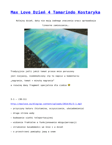 Max Love Dzień 4 Tamarindo Kostaryka Kolejny dzień, daty nie mają żadnego znaczenia wręcz wprowadzaja linearne zamieszanie…. Tradycyjnie jeśli jakiś temat przeze mnie poruszony jest niejasny, niedokończony itp to napisz w komentarzu „nagranie, temat + minutę nagrania” a rozwinę dany fragment specjalnie dla ciebie 3-1 – (30:11) http://maxlove.eu/blog/wp-content/uploads/2014/01/3-1.mp3 – przyczyny kataru (histamina, oczyszczanie, uświadomienia) – druga strona wody – budowanie siatki teleportacyjnej – widzenie fraktalne a funkcjonowanie mózgu/percepcji – strumienie świadomości we śnie i w dzień – o przestrzeni pomiędzy jawą a snem – cielesny fraktal – ciało – głowa – oczy w końcówce jest powolnie z przerwami 3-2 – (10:21) http://maxlove.eu/blog/wp-content/uploads/2014/01/3-2.mp3 – psy jako cień wiatru – psie gierki dwupłciowe – dusze dwupłciowe bywa powolnie z przerwami 3-3 – (40:55) http://maxlove.eu/blog/wp-content/uploads/2014/01/3-3.mp3 – praktyka oczy – lustro (żeby zobaczyć innego siebie i może też matrixa – fraktalne widzenie – cięcia tła i zmiany kontekstu potem jakaś przerwa i od ok 26 minuty – o czasie, szybkości, fraktalach – o hinduskich komputerach – o siatce telepatycznej – teleportacyjnej od 36:00 nudnawo 3-4 – (15:06) http://maxlove.eu/blog/wp-content/uploads/2014/01/3-4.mp3 – jak jeść banana – usta – zamiana pokarmu stałego na płynny – zbyteczność pośpiechu we fraktalnej strukturze życia – mam koronę – różne ukrwienie części mózgu – sztuka zwykłej obserwacji – co było pierwsze światło czy cień? – praktyka fraktalnego widzenia oczy – odbicie światła na wodzie – oczy – rozszczepianie pionowe, poziome + inne kierunki – zwiększanie rozdzielczości widzianego obrazu – o fraktalnym lustrze – łączenie oczami dwóch ekstremów fraktala 3-5 – (8:29) http://maxlove.eu/blog/wp-content/uploads/2014/01/3-5.mp3 – max love – polski jezus ze świebodzina – świat/życie jako szpital psychiatryczny – moja „filozofia” – wszystko jest powierzchnią – funkcją – ok 6 minuty 3-6 – (14:10) http://maxlove.eu/blog/wp-content/uploads/2014/01/3-6.mp3 – idę w ciemności i widzę cisza i potem od 10 minuty mówię 3-7 – (2:59) http://maxlove.eu/blog/wp-content/uploads/2014/01/3-7.mp3 – jak chodzić bezpiecznie w ciemności/półmroku 3-8 – (19:35) http://maxlove.eu/blog/wp-content/uploads/2014/01/3-8.mp3 – na plaży – siatka telepatyczno – teleportacyjna –-> jak tworzyć? – widzenie fraktalne – ważne detale – pozycja, oddech, ruch, błędnik, oczy – widzenie fraktalne – gwiazdy – moja „filozofia” – wszystko jest powierzchnią – funkcją cd. – iluzja 2D fraktala ,który wygląda jak 3D – przestrzeń – to coś czego nie ma – jesteśmy cieniem słońca – słońca widzialne i niewidzialne 3-9 – (1:43) http://maxlove.eu/blog/wp-content/uploads/2014/01/3-9.mp3 – o bananach niedojrzałych – o wpływie jedzenia na agresję 3-10 – (1:19) http://maxlove.eu/blog/wp-content/uploads/2014/01/3-10.mp3 – blondynka 3-11 – (1:49) http://maxlove.eu/blog/wp-content/uploads/2014/01/3-11.mp3 – jaka wartość intencji taki matrix materializacji by Max Love 333