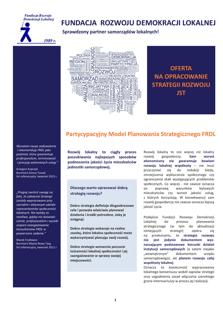 „Wyrażam swoje zadowolenie i rekomenduję FRDL jako podmiot, który gwarantuje profesjonalizm, terminowość i precyzję wykonanych usług.” Burmistrz Gminy Toszek, Grzegorz Kupczyk „Strategia Rozwoju Gminy Toszek na lata 2013-2020” Kwiecień 2013 r. FUNDACJA ROZWOJU DEMOKRACJI LOKALNEJ Sprawdzony partner samorządów lokalnych! „Pragnę zwrócić uwagę na fakt, że szerokim i aktywnym udziale byłoby to możliwe, gdyby nie zaangażowania konsultantów FRDL założenia Strategii zostały wypracowane przy reprezentantów społeczności lokalnych. Nie doświadczenie, profesjonalizm i wysoki stopień w powierzone zadanie.” Burmistrz Miasta Nowy Targ, Marek „Strategia Rozwoju Miasta Nowy Targ na Kwiecień 2011 r. Fryźlewicz lata 2010-2020” „Wyrażam swoje zadowolenie i gwarantuje profesjonalizm, rekomenduję FRDL jako podmiot, który terminowość i precyzję wykonanych usług.” OFERTA NA OPRACOWANIE Kupczyk STRATEGII ROZWOJU 2013-2020” JST Burmistrz Gminy Toszek, Grzegorz „Strategia Rozwoju Gminy Toszek na lata Kwiecień 2013 r. „Pragnę zwrócić uwagę na fakt, że szerokim i aktywnym udziale byłoby to możliwe, gdyby nie zaangażowania konsultantów FRDL założenia Strategii zostały wypracowane przy reprezentantów społeczności lokalnych. Nie doświadczenie, profesjonalizm i wysoki stopień w powierzone zadanie.” Burmistrz Miasta Nowy Targ, Marek Fryźlewicz „Strategia Rozwoju Miasta Nowy Targ na lata 2010-2020” Kwiecień 2011 r. Partycypacyjny Model Planowania Strategicznego FRDL Wyrażam swoje zadowolenie i rekomenduję FRDL jako podmiot, który gwarantuje profesjonalizm, terminowość i precyzję wykonanych usług.” Grzegorz Kupczyk Burmistrz Gminy Toszek list referencyjny, kwiecień 2013 r. „Pragnę zwrócić uwagę na fakt, że założenia Strategii zostały wypracowane przy szerokim i aktywnym udziale reprezentantów społeczności lokalnych. Nie byłoby to możliwe, gdyby nie doświadczenie, profesjonalizm i wysoki stopień zaangażowania konsultantów FRDL w powierzone zadanie.” Marek Fryźlewicz Burmistrz Miasta Nowy Targ list referencyjny, kwiecień 2011 r. Rozwój lokalny to ciągły proces poszukiwania najlepszych sposobów podnoszenia jakości życia mieszkańców jednostki samorządowej. Dlaczego warto opracować dobrą strategię rozwoju? Dobra strategia definiuje długookresowe cele i pozwala właściwie planować działania i środki potrzebne, żeby je osiągnąć. Dobra strategia wskazuje na realne zasoby, które lokalna społeczność może wykorzystywać planując swój rozwój. Dobra strategia wzmacnia poczucie tożsamości lokalnej społeczności i jej zaangażowanie w sprawy swojej miejscowości. 1 Rozwój lokalny to coś więcej niż lokalny rozwój gospodarczy. Sam wzrost ekonomiczny nie gwarantuje bowiem rozwoju lokalnej wspólnoty – nie musi przyczyniać się do redukcji biedy, zmniejszenia wykluczenia społecznego czy ograniczenia skali występujących problemów społecznych. Co więcej - nie zawsze oznacza on poprawę warunków bytowych mieszkańców czy wzrost jakości usług, z których korzystają. W konsekwencji sam rozwój gospodarczy nie zawsze oznacza lepszą jakość życia. Podejście Fundacji Rozwoju Demokracji Lokalnej do procesu planowania strategicznego (w tym do aktualizacji istniejących strategii) opiera się na przekonaniu, że strategia rozwoju nie jest jedynie dokumentem wyznaczającym podstawowe kierunki działań instytucji samorządowych (a zatem niejako „wewnętrznym” dokumentem urzędu samorządowego), ale planem rozwoju całej wspólnoty lokalnej. Oznacza to konieczność wypracowania lokalnego konsensusu wokół zapisów strategii oraz uzgodnienia zasad włączania szerokiego grona interesariuszy w proces jej realizacji. Misją Fundacji jest wspieranie samorządności obywatelskiej rozumianej jako podstawowa forma demokracji NAGRODY : 2008 r. - Nagroda Ministra Rozwoju Regionalnego w konkursie Najlepsza Inwestycja w Człowieka 2004 r. - Nagroda Honorowa Forum Ekonomicznego w Krynicy 2000 r. - Nagroda Główna Prezesa Rady Ministrów w Konkursie Pro Publico Bono 1995 r. - UN Habitat Scroll of Honour W ciągu 25 lat funkcjonowania : Przeszkoliliśmy 1 300 000 osób. Zrealizowaliśmy ponad 800 projektów. Zainicjowaliśmy funkcjonowanie ponad 70 samorządowych forów branżowych. Kim jesteśmy? Nasze doświadczenie Fundacja Rozwoju Demokracji Lokalnej (FRDL) jest największą pozarządową organizacją szkoleniowo-doradczą, wspierającą rozwój samorządności w Polsce. Fundacja została założona 18 września 1989 roku. Grupę założycielską stanowili parlamentarzyści - aktywni przedstawiciele ówczesnej opozycji demokratycznej: prof. Walerian Pańko, Andrzej Celiński, Aleksander Paszyński, Jerzy Stępień i prof. Jerzy Regulski, który od początku jest prezesem Fundacji. FRDL obejmuje swoimi działaniami terytorium całego kraju. W skład sieci wchodzi 12 Regionalnych Ośrodków oraz 6 Filii. Fundacja realizuje swoją misję działając na rzecz budowy więzi lokalnych i rozwoju kapitału społecznego wspólnot lokalnych. Biuro Krajowe FRDL Plac Inwalidów 10 01-552 Warszawa tel. + 48 22 322 84 40 fax: + 48 22 322 84 41 e-mail: [email protected] www.frdl.org.pl Wspieramy rozwój instytucji publicznych – samorządowych i rządowych. Badamy jakość usług publicznych i prowadzimy projekty na rzecz podnoszenia poziomu oraz efektywności tych usług. 2 FRDL ma doświadczenie w działalności szkoleniowej i doradczej: • dla przedstawicieli samorządu terytorialnego (podstawowa działalność Fundacji): kadry kierowniczej, radnych, urzędników, pracowników zakładów budżetowych podległych samorządom • dla pracowników i kadry zarządzającej małych i średnich przedsiębiorstw oraz osób rozpoczynających działalność gospodarczą. FRDL prowadzi dwa Punkty Konsultacyjne Polskiej Agencji Rozwoju Przedsiębiorczości • dla przedstawicieli organizacji pozarządowy
