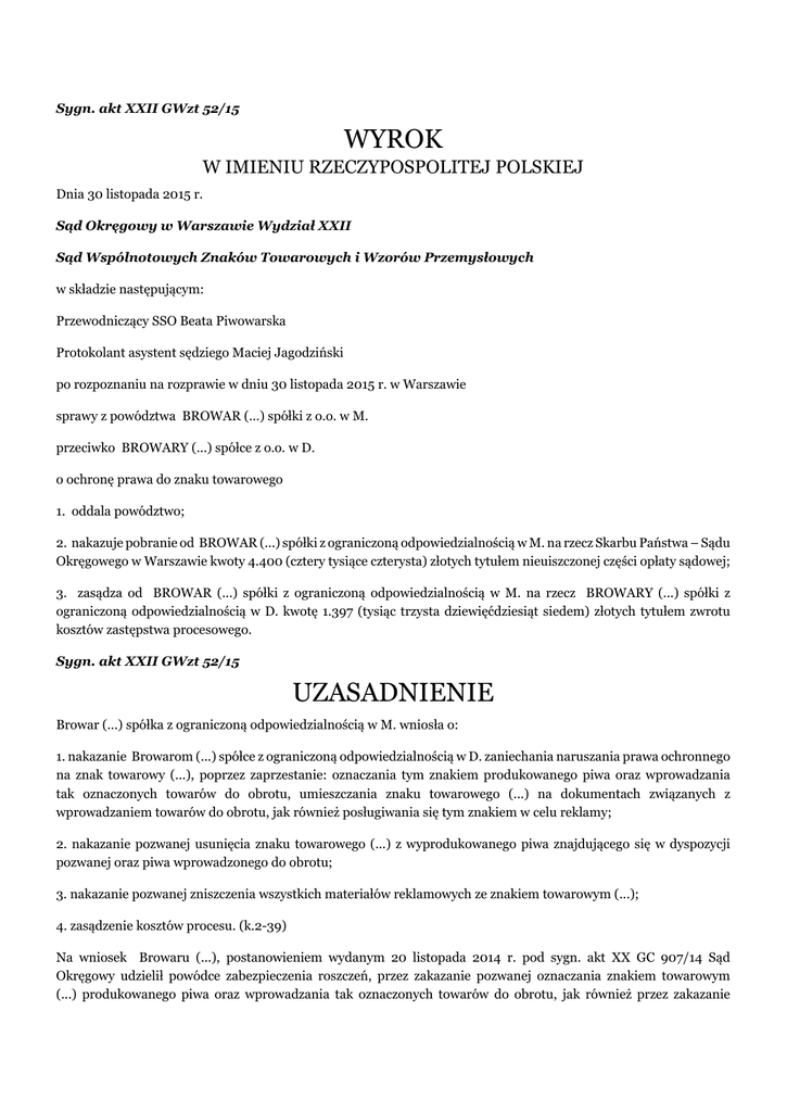 Sygn. akt XXII GWzt 52/15 WYROK W IMIENIU RZECZYPOSPOLITEJ POLSKIEJ Dnia 30 listopada 2015 r. Sąd Okręgowy w Warszawie Wydział XXII Sąd Wspólnotowych Znaków Towarowych i Wzorów Przemysłowych w składzie następującym: Przewodniczący SSO Beata Piwowarska Protokolant asystent sędziego Maciej Jagodziński po rozpoznaniu na rozprawie w dniu 30 listopada 2015 r. w Warszawie sprawy z powództwa BROWAR (...) spółki z o.o. w M. przeciwko BROWARY (...) spółce z o.o. w D. o ochronę prawa do znaku towarowego 1. oddala powództwo; 2. nakazuje pobranie od BROWAR (...) spółki z ograniczoną odpowiedzialnością w M. na rzecz Skarbu Państwa – Sądu Okręgowego w Warszawie kwoty 4.400 (cztery tysiące czterysta) złotych tytułem nieuiszczonej części opłaty sądowej; 3. zasądza od BROWAR (...) spółki z ograniczoną odpowiedzialnością w M. na rzecz BROWARY (...) spółki z ograniczoną odpowiedzialnością w D. kwotę 1.397 (tysiąc trzysta dziewięćdziesiąt siedem) złotych tytułem zwrotu kosztów zastępstwa procesowego. Sygn. akt XXII GWzt 52/15 UZASADNIENIE Browar (...) spółka z ograniczoną odpowiedzialnością w M. wniosła o: 1. nakazanie Browarom (...) spółce z ograniczoną odpowiedzialnością w D. zaniechania naruszania prawa ochronnego na znak towarowy (...), poprzez zaprzestanie: oznaczania tym znakiem produkowanego piwa oraz wprowadzania tak oznaczonych towarów do obrotu, umieszczania znaku towarowego (...) na dokumentach związanych z wprowadzaniem towarów do obrotu, jak również posługiwania się tym znakiem w celu reklamy; 2. nakazanie pozwanej usunięcia znaku towarowego (...) z wyprodukowanego piwa znajdującego się w dyspozycji pozwanej oraz piwa wprowadzonego do obrotu; 3. nakazanie pozwanej zniszczenia wszystkich materiałów reklamowych ze znakiem towarowym (...); 4. zasądzenie kosztów procesu. (k.2-39) Na wniosek Browaru (...), postanowieniem wydanym 20 listopada 2014 r. pod sygn. akt XX GC 907/14 Sąd Okręgowy udzielił powódce zabezpieczenia roszczeń, przez zakazanie pozwanej oznaczania znakiem towarowym (...) produkowanego piwa oraz wprowadzania tak oznaczonych towarów do obrotu, jak również przez zakazanie posługiwania się znakiem towarowym (...) w celu reklamy. (k.134, uzasadnienie k.139-143) Na skutek zażalenia obowiązanej, postanowieniem z 16 lipca 2015 r. wydanym w sprawie sygn. akt VI ACz 899/15 Sąd Apelacyjny w Warszawie, zmieniając zaskarżone orzeczenie, oddalił wniosek o udzielenie zabezpieczenia. (k.187-192) Browary (...) spółka z ograniczoną odpowiedzialnością w D. Nowym zażądała oddalenia powództwa i zwrotu kosztów postępowania. (k.55-131) Bezsporne w sprawie jest, że: Browar (...) spółka z ograniczoną odpowiedzialnością w M. prowadzi działalność gospodarczą w zakresie produkcji i sprzedaży hurtowej napojów alkoholowych i bezalkoholowych. (tak też odpis z KRS k.15-18) Powódce służy prawo ochronne na słowny znak towarowy (...) zarejestrowany w Urzędzie Patentowym Rzeczypospolitej Polskiej pod numerem (...) z pierwszeństwem od 26 lipca 2011 r. dla towarów w klasie 32 (piwo) klasyfikacji nicejskiej. (tak też: świadectwo ochronne k.21-22, wydruk z bazy uprp.pl k.23) W latach 2006-2011 powódka produkowała i wprowadzała do obrotu piwa pod nazwami handlowymi: (...), (...), (...) i (...) , które zyskały uznanie w branży piwowarskiej. (tak też: dyplomy k.24-28 , wydruki ze stron internetowych k.29-31) Browary (...) spółka z o.o. w D. prowadzi działalność gospodarczą, której głównym przedmiotem jest produkcja napojów. (tak też odpis z KRS k.19-20) W 2014 r. pozwana wprowadziła na rynek piwo w opakowaniach z etykietą . (tak też: fotografie k.32, 37, paragon k.33, wydruk ze strony internetowej k. 34 ) W oznaczeniu opakowania elementem wyróżniającym jest słowo (...) które wskazuje na produkcję napoju w browarze w B. („ Browar (...) w B.”), podobnie jak (...) w C.. Słowo (...), podobnie jak graficzne przedstawienie smoka ma charakter opisowy, nie jest używane przez pozwaną w funkcji znaku towarowego – dla wskazania oznaczenia pochodzenia towaru od określonego przedsiębiorcy. (ocena normatywna – brak dowodu przeciwnego) Pozwanej służy prawo ochronne na – tożsamy z używaną etykietą - słowno-graficzny znak towarowy zarejestrowany w Urzędzie Patentowym Rzeczypospolitej Polskiej pod numerem (...) z pierwszeństwem od 31 lipca 2014 r. dla towarów w klasie 32. klasyfikacji nicejskiej (piwo, piwo bezalkoholowe) oraz dla usług w klasie 35. (sprzedaż hurtowa i detaliczna piwa, piwa bezalkoholowego, usług w zakresie marketingu i reklamy, promocja sprzedaży, organizowanie targów, wystaw i festynów w celach handlowych i reklamowych). (tak też świadectwo ochronne k.219-220) Pozwana nie należy do autoryzowanych dystrybutorów ani nie jest powiązana gospodarczo z Browarem (...). Nigdy nie uzyskała zgody na używanie znaku towarowego (...). (tak też korespondencja k.35-36) Prawo wyłącznego używania słownego krajowego znaku towarowego (...) nie było sporne. Jakkolwiek pozwana kwestionowała jego ważność w postępowaniu przed Urzędem Patentowym RP, to skończyło się ono wydaniem ostatecznej decyzji o oddaleniu wniosku. Nie ma także wątpliwości co do późniejszego udzielenia pozwanej ochrony na słowno-graficzny znak towarowy R- (...), dla towarów identycznych z tymi dla których chroniony jest znak powódki (piwo). Spółka Browary (...) nie przeczyła używaniu kwestionowanego oznaczenia, sporne pomiędzy stronami było natomiast istnienie podstaw uzasadniających zakwalifikowanie działania pozwanej jako naruszenia prawa ochronnego na znak towarowy (...) i czynu nieuczciwej konkurencji. Sąd zważył: I. Odnośnie do naruszenia prawa do znaku towarowego: Podstawową funkcją znaku towarowego jest gwarantowanie konsumentowi lub końcowemu odbiorcy możliwości określenia pochodzenia towaru lub usługi nim oznaczonych, odróżnienia