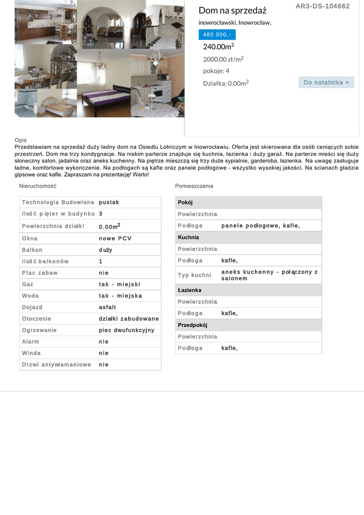 Dom na sprzedaż AR3-DS-104662 inowrocławski, Inowrocław, 480 000,- 240.00m2 2000.00 zł/m2 pokoje: 4 Działka: 0.00m2 Do notatnika + Opis Przedstawiam na sprzedaż duży ładny dom na Osiedlu Lotniczym w Inowrocławiu. Oferta jest skierowana dla osób ceniących sobie przestrzeń. Dom ma trzy kondygnacje. Na niskim parterze znajduje się kuchnia, łazienka i duży garaż. Na parterze mieści się duży słoneczny salon, jadalnia oraz aneks kuchenny. Na piętrze mieszczą się trzy duże sypialnie, garderoba, łazienka. Na uwagę zasługuje ładne, komfortowe wykonczenie. Na podłogach są kafle oraz panele podłogowe - wszystko wysokiej jakości. Na scianach gładzie gipsowe oraz kafle. Zapraszam na prezentację! Warto! Nieruchomość Pomieszczenia Technologia Budowlana pustak Pokój I l oś ć p ię t e r w b u d y n k u 3 Powierzchnia P o w i e r z c h n i a d z i ał k i 0 . 0 0 m2 P o dł o g a Okna nowe PCV Kuchnia Balkon d uży Powierzchnia I l oś ć b a l k o n ó w 1 P o dł o g a kafle, Plac zabaw nie Typ kuchni a n e k s k u c h e n n y - p oł ąc z o n y z salonem Gaz tak - miejski Woda tak - miejska Dojazd asfalt Otoczenie d z i ał k i z a b u d o w a n e Ogrzewanie piec dwufunkcyjny Alarm nie Winda nie D r z w i a n t y wł a m a n i o w e nie p a n e l e p o dł o g o w e , k a f l e , Łazienka Powierzchnia P o dł o g a kafle, Przedpokój Powierzchnia P o dł o g a kafle,