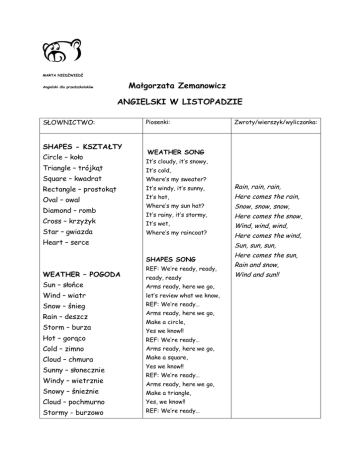 MARTA NIEDŹWIEDŹ Małgorzata Zemanowicz Angielski dla przedszkolaków ANGIELSKI W LISTOPADZIE SŁOWNICTWO: SHAPES - KSZTAŁTY Circle – koło Triangle – trójkąt Piosenki: Zwroty/wierszyk/wyliczanka: WEATHER SONG It’s cloudy, it’s snowy, It’s cold, Square – kwadrat Where’s my sweater? Rectangle – prostokąt It’s windy, it’s sunny, Rain, rain, rain, Oval – owal It’s hot, Here comes the rain, Where’s my sun hat? Snow, snow, snow, It’s rainy, it’s stormy, Here comes the snow, It’s wet, Wind, wind, wind, Where’s my raincoat? Here comes the wind, Diamond – romb Cross – krzyżyk Star – gwiazda Heart – serce Sun, sun, sun, SHAPES SONG WEATHER – POGODA REF: We’re ready, ready, ready, ready Sun – słońce Arms ready, here we go, Wind – wiatr let’s review what we know, Snow – śnieg REF: We’re ready… Rain – deszcz Storm – burza Arms ready, here we go, Make a circle, Yes we know!! Hot – gorąco REF: We’re ready… Cold – zimno Arms ready, here we go, Cloud – chmura Make a square, Sunny – słonecznie Windy – wietrznie Yes we know!! REF: We’re ready… Arms ready, here we go, Snowy – śnieżnie Make a triangle, Cloud – pochmurno Yes, we know!! Stormy - burzowo REF: We’re ready… Here comes the sun, Rain and snow, Wind and sun!!
