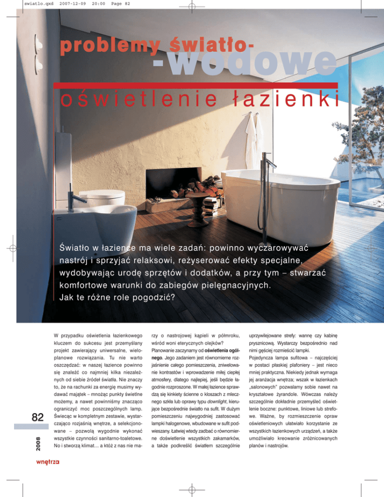 swiatlo.qxd 2007-12-09 20:00 Page 82 problemy œ wiat³o- -w w odowe oœwietlenie ³azienki Œwiat³o w ³azience ma wiele zadañ: powinno wyczarowywaæ nastrój i sprzyjaæ relaksowi, re¿yserowaæ efekty specjalne, wydobywaj¹c urodê sprzêtów i dodatków, a przy tym – stwarzaæ komfortowe warunki do zabiegów pielêgnacyjnych. Jak te ró¿ne role pogodziæ? 2008 82 W przypadku oœwietlenia ³azienkowego kluczem do sukcesu jest przemyœlany projekt zawieraj¹cy uniwersalne, wieloplanowe rozwi¹zania. Tu nie warto oszczêdzaæ: w naszej ³azience powinno siê znaleŸæ co najmniej kilka niezale¿nych od siebie Ÿróde³ œwiat³a. Nie znaczy to, ¿e na rachunki za energiê musimy wydawaæ maj¹tek – mno¿¹c punkty œwietlne mo¿emy, a nawet powinniœmy znacz¹co ograniczyæ moc poszczególnych lamp. Œwiec¹c w kompletnym zestawie, wystarczaj¹co rozjaœni¹ wnêtrze, a selekcjonowane – pozwol¹ wygodnie wykonaæ wszystkie czynnoœci sanitarno-toaletowe. No i stworz¹ klimat… a któ¿ z nas nie ma- rzy o nastrojowej k¹pieli w pó³mroku, wœród woni eterycznych olejków? Planowanie zaczynamy od oœwietlenia ogólnego. Jego zadaniem jest równomierne rozjaœnienie ca³ego pomieszczenia, zniwelowanie kontrastów i wprowadzenie mi³ej ciep³ej atmosfery, dlatego najlepiej, jeœli bêdzie ³agodnie rozproszone. W ma³ej ³azience sprawdz¹ siê kinkiety œcienne o kloszach z mlecznego szk³a lub oprawy typu downlight, kieruj¹ce bezpoœrednie œwiat³o na sufit. W du¿ym pomieszczeniu najwygodniej zastosowaæ lampki halogenowe, wbudowane w sufit podwieszany. £atwiej wtedy zadbaæ o równomierne doœwietlenie wszystkich zakamarków, a tak¿e podkreœliæ œwiat³em szczególnie uprzywilejowane strefy: wannê czy kabinê prysznicow¹. Wystarczy bezpoœrednio nad nimi gêœciej rozmieœciæ lampki. Pojedyncza lampa sufitowa – najczêœciej w postaci p³askiej plafoniery – jest nieco mniej praktyczna. Niekiedy jednak wymaga jej aran¿acja wnêtrza; wszak w ³azienkach „salonowych” pozwalamy sobie nawet na kryszta³owe ¿yrandole. Wówczas nale¿y szczególnie dok³adnie przemyœleæ oœwietlenie boczne: punktowe, liniowe lub strefowe. Wa¿ne, by rozmieszczenie opraw oœwietleniowych u³atwia³o korzystanie ze wszystkich ³azienkowych urz¹dzeñ, a tak¿e umo¿liwia³o kreowanie zró¿nicowanych planów i nastrojów. swiatlo.qxd 2007-12-09 20:00 Page 83 O 1 Gdzie znajdziemy lepsze miejsce dla gigantycznej bia³ej kropli ze szk³a, ni¿ w ³azience? Lampa Goccia w³oskiej firmy Rotaliana mo¿e staæ siê dowcipn¹ metafor¹ wody w du¿ym salonie k¹pielowym. Ale uwaga – ¿eby efekt spe³ni³ oczekiwania, pomieszczenie musi byæ naprawdê wysokie; rozmiar samej kropli to, w zale¿noœci od wariantu, 45 lub 63 cm. (20 lub 23 W – w przypadku energooszczêdnych œwietlówek kompaktowych) O 2 Ÿród³o œwiat³a ukryte. Listwy œwietlne to ostatnio bardzo modny ³azienkowy motyw; takie oœwietlenie nie razi, poniewa¿ fot. Milantex Pasuj¹ ¿arówki o mocy, odpowiednio, 100 lub 150 W same œwietlówki s¹ niewidoczne. Wnêtrze rozjaœnione jest przyjemnym w odbiorze, rozproszonym œwiat³em poœrednim, odbitym od s¹siaduj¹cych z lampami powierzchni. Montuj¹c liniowe oprawy w suficie podwieszanym lub wzd³u¿ pionowych krawêdzi œcian, mo¿na zapewniæ w ³azience doskona³e oœwietlenie ogólne. Innym sposobem wykorzystania listew œwietlnych jest umieszczenie ich w miejscach, które chcemy zaakcentowaæ: w stopniu podestu, wokó³ wanny lub – jak tu – w pobli¿u umywalki. Œwietlówki ukryte za ekranem w ³agodny, naturalny i dyskretny sposób rozjaœniaj¹ ca³¹ strefê pielêgnacyjn¹ 2 fot. Hansgrohe OD OGÓ£U DO SZCZEGÓ£U S¹ w ³azience miejsca, które wymagaj¹ szczególnego potraktowania. To okolice umywalki, sanitariatów, kabiny natryskowej i wanny. Strefa umywalki czêsto bywa te¿ stref¹ makija¿u, dlatego jej oœwietlenie powinno byæ precyzyjne, ale naturalne i niera¿¹ce. Efekt ten pozwol¹ uzyskaæ kinkiety po bokach lustra (umieszczanego z regu³y nad umywalk¹) o mlecznych oprawach, z ¿arówkami o mocy nie wiêkszej ni¿ po 60 W ka¿da. Poniewa¿ im wiêcej punktów œwietlnych, tym lepiej (rozpraszaj¹ cienie, oœwietlaj¹c równomierniej), dobrym rozwi¹zaniem bêdzie kilka s³abszych ¿arówek umieszczonych na obwodzie lustra. Doskona- fot. Sanitec Ko³o 1 swiatlo.qxd 2007-12-09 20:01 Page 84 fot. Milantex 4 5 fot. Artemix fot. Artemix 3 2008 84 ³¹ iluminacjê zapewniaj¹ lustra z fabrycznie wmontowanymi oprawami, ukrytymi pod tafl¹. Trzeba te¿ zadbaæ o oœwietlenie wnêtrza umywalki, dlatego boczne lampki powinien uzupe³niaæ górny kinkiet skierowany w dó³. Oœwietlenie kilkupunktowe, pochodz¹ce np. z sufitu podwieszanego, powinno towarzyszyæ misce WC i bidetowi. Tu wa¿ne, by œwiat³o dociera³o do baterii bidetowej, uchwytu na rêcznik i papier toaletowy, a tak¿e pozwala³o dok³adnie umyæ sanitariaty. W okolicy wanny i natrysku œwiat³o powinno byæ równomiernie rozproszone – takie zapewni¹ nam liniowe œwietlówki ukryte za gzymsami, uskokami œcian czy sufitu, a tak¿e pogrupowane halogenki sufitowe. Jeœli przy wannie planujemy dodatkow¹ lampkê, jej oprawa nie mo¿e byæ oznaczona symbolem ni¿szym ni¿ IP 44 (okreœla on stopieñ ochrony przy u¿ytkowaniu w pomieszczeniach wilgotnych). Lampka nie powinna byæ te¿ umieszczona zbyt nisko – doskona³y bêdzie reflektorek z przegubem daj¹cym mo¿liwoœæ regulacji snopu œwiat³a. Wreszcie ostatnia, choæ niepoœlednia funkcja oœwietlenia: budowanie nastroju i akcentowanie dekoracyjnych szczegó³ów. Bezkonkurencyjne s¹ tu wi¹zki œwiat³a halogenowego umieszczone „w podniebieniu” wnêkowych pó³ek – oœwietlaj¹ umieszczone na nich ozdobne drobiazgi, a w ca³ym wnêtrzu Q wzmacniaj¹ efekt trójwymiarowej g³êbi. O 3 Doskona³y sposób na oœwietlenie strefy nad toaletk¹ czy umywalk¹ to lustro z wbudowanym oœwietleniem. Producenci dobieraj¹ lamp