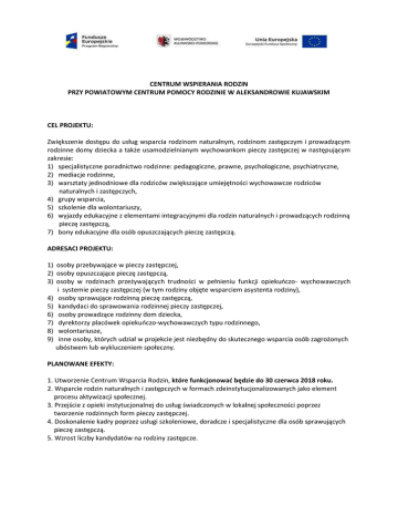 CENTRUM WSPIERANIA RODZIN PRZY POWIATOWYM CENTRUM POMOCY RODZINIE W ALEKSANDROWIE KUJAWSKIM CEL PROJEKTU: Zwiększenie dostępu do usług wsparcia rodzinom naturalnym, rodzinom zastępczym i prowadzącym rodzinne domy dziecka a także usamodzielnianym wychowankom pieczy zastępczej w następującym zakresie: 1) specjalistyczne poradnictwo rodzinne: pedagogiczne, prawne, psychologiczne, psychiatryczne, 2) mediacje rodzinne, 3) warsztaty jednodniowe dla rodziców zwiększające umiejętności wychowawcze rodziców naturalnych i zastępczych, 4) grupy wsparcia, 5) szkolenie dla wolontariuszy, 6) wyjazdy edukacyjne z elementami integracyjnymi dla rodzin naturalnych i prowadzących rodzinną pieczę zastępczą, 7) bony edukacyjne dla osób opuszczających pieczę zastępczą. ADRESACI PROJEKTU: 1) osoby przebywające w pieczy zastępczej, 2) osoby opuszczające pieczę zastępczą, 3) osoby w rodzinach przeżywających trudności w pełnieniu funkcji opiekuńczo- wychowawczych i systemie pieczy zastępczej (w tym rodziny objęte wsparciem asystenta rodziny), 4) osoby sprawujące rodzinną pieczę zastępczą, 5) kandydaci do sprawowania rodzinnej pieczy zastępczej, 6) osoby prowadzące rodzinny dom dziecka, 7) dyrektorzy placówek opiekuńczo-wychowawczych typu rodzinnego, 8) wolontariusze, 9) inne osoby, których udział w projekcie jest niezbędny do skutecznego wsparcia osób zagrożonych ubóstwem lub wykluczeniem społeczny. PLANOWANE EFEKTY: 1. Utworzenie Centrum Wsparcia Rodzin, które funkcjonować będzie do 30 czerwca 2018 roku. 2. Wsparcie rodzin naturalnych i zastępczych w formach zdeinstytucjonalizowanych jako element procesu aktywizacji społecznej. 3. Przejście z opieki instytucjonalnej do usług świadczonych w lokalnej społeczności poprzez tworzenie rodzinnych form pieczy zastępczej. 4. Doskonalenie kadry poprzez usługi szkoleniowe, doradcze i specjalistyczne dla osób sprawujących pieczę zastępczą. 5. Wzrost liczby kandydatów na rodziny zastępcze. SIEDZIBA CENTRUM: CENTRUM WSPIERANIA RODZINY PRZY POWIATOWYM CENTRUM POMOCY RODZINIE W ALEKSANDROWIE KUJAWSKIM UL. SIKORSKIEGO 3 87-700 ALEKSANDRÓW KUJAWSKI TELEFON: 514 542 555 Centrum będzie funkcjonowało od poniedziałku do piątku w godzinach 7.30 – 15.30, które mogą ulec zmianie w zależności od potrzeb. Informacja o zmianie godzin funkcjonowania Centrum będzie każdorazowo umieszczana na stronie. CZAS TRWANIA PROJEKTU: Powiatowe Centrum Pomocy Rodzinie w Aleksandrowie Kujawskim Projekt realizuje od 23 września 2016 roku do 30 czerwca 2018 roku. WARTOŚĆ PROKEKTU: Projekt partnerski realizowany jest w ramach Regionalnego Programu Operacyjnego Województwa Kujawsko- Pomorskiego na lata 2014-2020, Osi Priorytetowej 9 Solidarne społeczeństwo, Działania 9.3 Rozwój usług zdrowotnych i społecznych, Poddziałania 9.3.2 Rozwój usług społecznych. Wartość Projektu 11 482 020,00zł. Dofinansowanie z Europejskiego Funduszu Społecznego wynosi 9 759 717,00zł CENTRUM WSPIERANIA RODZIN PRZY POWIATOWYM CENTRUM POMOCY RODZINIE W ALEKSANDROWIE KUJAWSKIM CEL PROJEKTU: Zwiększenie dostępu do usług wsparcia rodzinom naturalnym, rodzinom zastępczym i prowadzącym rodzinne domy dziecka a także usamodzielnianym wychowankom pieczy zastępczej w następującym zakresie: 1) specjalistyczne poradnictwo rodzinne: pedagogiczne, prawne, psychologiczne, psychiatryczne, 2) mediacje rodzinne, 3) warsztaty jednodniowe dla rodziców zwiększające umiejętności wychowawcze rodziców naturalnych i zastępczych, 4) grupy wsparcia, 5) szkolenie dla wolontariuszy, 6) wyjazdy edukacyjne z elementami integracyjnymi dla rodzin naturalnych i prowadzących rodzinną pieczę zastępczą, 7) bony edukacyjne dla osób opuszczających pieczę zastępczą. ADRESACI PROJEKTU: 1) osoby przebywające w pieczy zastępczej, 2) osoby opuszczające pieczę zastępczą, 3) osoby w rodzinach przeżywających trudności w pełnieniu funkcji opiekuńczo- wychowawczych i systemie pieczy zastępczej (w tym rodziny objęte wsparciem asystenta rodziny), 4) osoby sprawujące rodzinną pieczę zastępczą, 5) kandydaci do sprawowania rodzinnej pieczy zastępczej, 6) osoby prowadzące rodzinny dom dziecka, 7) dyrektorzy placówek opiekuńczo-wychowawczych typu rodzinnego, 8) wolontariusze, 9) inne osoby, których udział w projekcie jest niezbędny do skutecznego wsparcia osób zagrożonych ubóstwem lub wykluczeniem społeczny. PLANOWANE EFEKTY: 1. Utworzenie Centrum Wsparcia Rodzin, które funkcjonować będzie do 30 czerwca 2018 roku. 2. Wsparcie rodzin naturalnych i zastępczych w formach zdeinstytucjonalizowanych jako element procesu aktywizacji społecznej. 3. Przejście z opieki instytucjonalnej do usług świadczonych w lokalnej społeczności poprzez tworzenie rodzinnych form pieczy zastępczej. 4. Doskonalenie kadry poprzez usługi szkoleniowe, doradcze i specjalistyczne dla osób sprawujących pieczę zastępczą. 5. Wzrost liczby kandydatów na rodziny zastępcze. SIEDZIBA CENTRUM: CENTRUM WSPIERANIA RODZINY PRZY POWIATOWYM CENTRUM POMOCY RODZINIE W ALEKSANDROWIE KUJAWSKIM UL. SIKORSKIEGO 3 87-700 ALEKSANDRÓW KUJAWSKI TELEFON: 514 542 555 Centrum będzie funkcjonowało od poniedziałku do piątku w godzinach 7.30 – 15.30, które mogą ulec zmianie w zależności od potrzeb. Informacja o zmianie godzin funkcjonowania Centrum będzie każdorazowo umieszczana na stronie. CZAS TRWANIA PROJEKTU: Powiatowe Centrum Pomocy Rodzinie w Aleksandrowie Kujawskim Projekt realizuje od 23 września 2016 roku do 30 czerwca 2018 roku. WARTOŚĆ PROKEKTU: Projekt partnerski realizowany jest w ramach Regionalnego Programu Operacyjnego Województwa Kujawsko- Pomorskiego na lata 2014-2020, Osi Priorytetowej 9 Solidarne społeczeństwo, Działania 9.3 Rozwój usług zdrowotnych i społecznych, Poddziałania 9.3.2 Rozwój usług społecznych. Wartość Projektu 11 482 020,00zł. Dofinansowanie z Europejskiego Funduszu Społecznego wynosi 9 759 717,00zł
