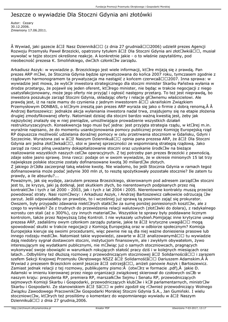 Fundacja Promocji Przemysłu Okrętowego i Gospodarki Morskiej Jeszcze o wywiadzie Dla Stoczni Gdynia ani złotówki Autor: Cezary 30.12.2006. Zmieniony 17.06.2011.  Wywiad, jaki gazecie „Nasz Dziennik― (z dnia 27 grudnia’2006) udzielił prezes Agencji Rozwoju Przemysłu Paweł Brzezicki, opatrzony tytułem „Dla Stoczni Gdynia ani złotÃłwki―, musiał wywołać w tejże stoczni określone reakcje. A konkretnie jakie - o to właśnie zapytaliśmy, pod nieobecność prezesa K. Smolińskiego, dwÃłch członkÃłw zarządu. Arkadiusz Aszyk: w wywiadzie p. Brzezickiego jest wiele informacji, ktÃłre mijają się z prawdą. Pan prezes ARP mÃłwi, że Stocznia Gdynia będzie sprywatyzowana do końca 2007 roku, tymczasem zgodnie z rządowym harmonogramem ta prywatyzacja ma nastąpić z końcem czerwca’2007. Inna sprawa: w wywiadzie jest mowa, że wybÃłr inwestora strategicznego dla stoczni minister Skarbu Państwa wyłania w drodze przetargu, że pojawił się jeden oferent, ktÃłrego minister, nie będąc w trakcie negocjacji z niego usatysfakcjonowany, może jego oferty nie przyjąć i ogłosić następny przetarg. To też jest nieprawdą, bo inwestora poszukuje zarząd Stoczni Gdynia, składając oferty i relacje głÃłwnemu właścicielowi. Ale prawdą jest, iż na razie mamy do czynienia z jednym inwestorem – ukraińskim Związkiem Przemysłowym DONBAS, o ktÃłrym zresztą pan prezes ARP wyraża się jako o firmie z dobrą renomą.  Andrzej Bartoszewicz: jednakże akcja wyłaniania inwestora nadal trwa, znajdujemy się na etapie złożenia drugiej zmodyfikowanej oferty. Natomiast dzisiaj dla stoczni bardzo ważną kwestią jest, żeby jak najszybciej znalazły się w niej pieniądze, umożliwiające prowadzenie wszystkich działań restrukturyzacyjnych. Konsekwencja tego musi być jedna: jest przyjęta strategia rządu, w ktÃłrej m.in. wyraźnie napisano, że do momentu usankcjonowania pomocy publicznej przez Komisję Europejską rząd RP dopuszcza możliwość udzielania doraźnej pomocy w celu przetrwania stoczniom w Gdańsku, Gdyni i Szczecinie. Wyrażona zaś w „Naszym Dzienniku― opinia pana prezesa ARP, że „Dla Stoczni Gdynia ani jedna złotÃłwka―, stoi w jawnej sprzeczności ze wspomnianą strategią rządową. Jako zarząd za rzecz pilną uważamy dokapitalizowanie stoczni oraz uzyskanie środkÃłw na bieżące realizowanie wszystkich naszych celÃłw operacyjnych. Z tej potrzeby pan prezes Brzezicki z pewnością. zdaje sobie jasno sprawę. Inna rzecz: podaje on w swoim wywiadzie, że w okresie minionych 15 lat trzy największe polskie stocznie zostały dofinansowane kwotą 30 miliardÃłw złotych. Z jakiego źrÃłdła zaczerpnął taką właśnie kwotę. Nie wiadomo, bo jeśli Stocznia Gdynia w ramach tegoż dofinansowania może podać jedynie 300 mln zł, to resztę spożytkowały pozostałe stocznie? Ile zatem tu prawdy, a ile absurdu?... Poważnym, jak się wydaje, zarzutem prezesa Brzezickiego, skierowanym pod adresem zarządÃłw stoczni jest to, że kryzys, jaki ją dotknął, jest skutkiem złych, bo nierentownych podpisanych przez nią kontraktÃłw i tych z lat 2000 - 2003, jak i tych z lat 2004 i 2005. Nierentowne kontrakty muszą przecież powodować straty. Nasi rozmÃłwcy: i Arkadiusz Aszyk, i Andrzej Bartoszewicz całkowicie odrzucają Ãłw zarzut. Jeśli odpowiadałby on prawdzie, to i wcześniej już sprawą tą powinien zająć się prokurator. Owszem, były przypadki zdawania niektÃłrych statkÃłw za sumę poniżej poniesionych kosztÃłw, ale z czego to wynikało? Że z trudnych do przewidzenia relacji walutowych (złotÃłwki do dolara), z radykalnego wzrostu cen stali (aż o 300%), czy innych materiałÃłw. Wszystkie te sprawy były poddawane licznym kontrolom, także przez Najwyższą Izbę Kontroli. I nie wykazały uchybień.Pomijając inne krytyczne uwagi prezesa ARP, zadaliśmy owym członkom zarządu pytanie, jakie te „krytyczne uwagi― mogą spowodować skutki w trakcie negocjacji z Komisją Europejską oraz w odbiorze społecznym? Komisja Europejska kieruje się swoimi procedurami, więc pewnie nie są dla niej ważne doniesienia prasowe lub innego rodzaju mediÃłw. Natomiast takie wypowiedzi, zawarte w „analizowanym― tu wywiadzie dają niedobry sygnał dostawcom stoczni, instytucjom finansowym, ale i zwykłym obywatelom, żywo interesującym się wydatkami publicznymi, nie mÃłwiąc już o samych stoczniowcach, pragnących wykonywać swoje obowiązki w warunkach rokujących stałość pracy dziś i w kolejnych miesiącach oraz latach...Odbyliśmy też dłuższą rozmowę z przewodniczącym stoczniowej „Solidarności― i zarazem szefem Sekcji Krajowej Przemysłu Okrętowego NSZZ „Solidarność― Dariuszem Adamskim.  Wywiad z prezesem Brzezickim ocenił jeszcze „ostrzej―, aniżeli panowie Aszyk i Bartoszewicz. Zamiast jednak relacji z tej rozmowy, publikujemy pismo: (otwÃłrz w formacie .pdf), jakie D. Adamski w imieniu kierowanej przez niego organizacji związkowej skierował do czołowych osÃłb w naszym kraju: prezydenta RP, premiera RP, marszałkÃłw Sejmu i Senatu RP, przewodniczących sejmowych Komisji Skarbu i Gospodarki, przewodniczących klubÃłw i kÃłł parlamentarnych, ministrÃłw Skarbu i Gospodarki. Ze stanowiskiem „S― w pełni zgodził się rÃłwnież przewodniczący Wolnego Związku Zawodowego PracownikÃłw Gospodarki Morskiej Stoczni Gdynia S.A., Jan Gumiński. I wielu stoczniowcÃłw, ktÃłrych też prosiliśmy o komentarz do wspomnianego wywiadu w „Naszym Dzienniku― z dnia 27 grudnia,2006. http://archiwum.oficynamorska.pl Kreator PDF Utworzono 7-03-2017, 13:17 Fundacja Promocji Przemysłu Okrętowego i Gospodarki Morskiej Henryk Spigarski Zdjęcia: T. Lademann, H. Spigarski, C. Spigarski http://archiwum.oficynamorska.pl Kreator PDF Utworzono 7-03-2017, 13:17