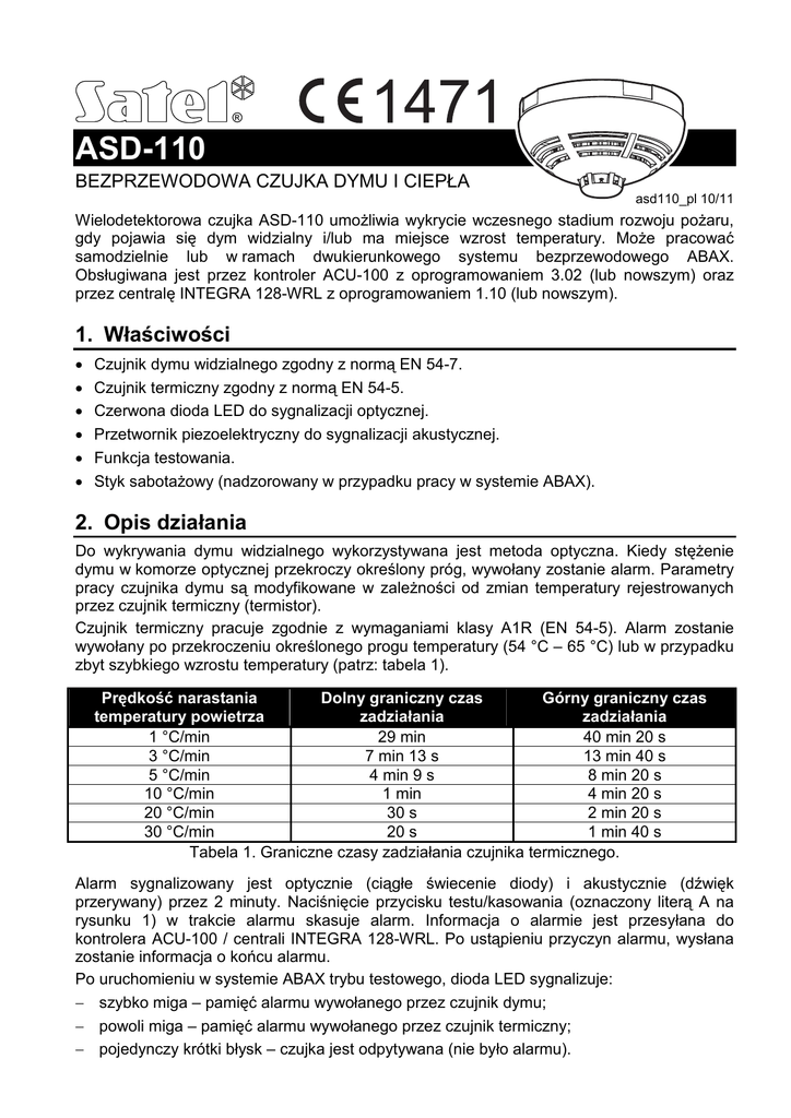 ® ASD-110 BEZPRZEWODOWA CZUJKA DYMU I CIEPŁA asd110_pl 10/11 Wielodetektorowa czujka ASD-110 umożliwia wykrycie wczesnego stadium rozwoju pożaru, gdy pojawia się dym widzialny i/lub ma miejsce wzrost temperatury. Może pracować samodzielnie lub w ramach dwukierunkowego systemu bezprzewodowego ABAX. Obsługiwana jest przez kontroler ACU-100 z oprogramowaniem 3.02 (lub nowszym) oraz przez centralę INTEGRA 128-WRL z oprogramowaniem 1.10 (lub nowszym). 1. Właściwości • • • • • • Czujnik dymu widzialnego zgodny z normą EN 54-7. Czujnik termiczny zgodny z normą EN 54-5. Czerwona dioda LED do sygnalizacji optycznej. Przetwornik piezoelektryczny do sygnalizacji akustycznej. Funkcja testowania. Styk sabotażowy (nadzorowany w przypadku pracy w systemie ABAX). 2. Opis działania Do wykrywania dymu widzialnego wykorzystywana jest metoda optyczna. Kiedy stężenie dymu w komorze optycznej przekroczy określony próg, wywołany zostanie alarm. Parametry pracy czujnika dymu są modyfikowane w zależności od zmian temperatury rejestrowanych przez czujnik termiczny (termistor). Czujnik termiczny pracuje zgodnie z wymaganiami klasy A1R (EN 54-5). Alarm zostanie wywołany po przekroczeniu określonego progu temperatury (54 °C – 65 °C) lub w przypadku zbyt szybkiego wzrostu temperatury (patrz: tabela 1). Prędkość narastania Dolny graniczny czas Górny graniczny czas temperatury powietrza zadziałania zadziałania 1 °C/min 29 min 40 min 20 s 3 °C/min 7 min 13 s 13 min 40 s 5 °C/min 4 min 9 s 8 min 20 s 10 °C/min 1 min 4 min 20 s 20 °C/min 30 s 2 min 20 s 30 °C/min 20 s 1 min 40 s Tabela 1. Graniczne czasy zadziałania czujnika termicznego. Alarm sygnalizowany jest optycznie (ciągłe świecenie diody) i akustycznie (dźwięk przerywany) przez 2 minuty. Naciśnięcie przycisku testu/kasowania (oznaczony literą A na rysunku 1) w trakcie alarmu skasuje alarm. Informacja o alarmie jest przesyłana do kontrolera ACU-100 / centrali INTEGRA 128-WRL. Po ustąpieniu przyczyn alarmu, wysłana zostanie informacja o końcu alarmu. Po uruchomieniu w systemie ABAX trybu testowego, dioda LED sygnalizuje: − szybko miga – pamięć alarmu wywołanego przez czujnik dymu; − powoli miga – pamięć alarmu wywołanego przez czujnik termiczny; − pojedynczy krótki błysk – czujka jest odpytywana (nie było alarmu). 2 ASD-110 SATEL Uwaga: Pamięć alarmu jest kasowana po zakończeniu trybu testowego. 3. Montaż Czujka przystosowana jest do pracy w pomieszczeniach zamkniętych. Powinna być instalowana na suficie, w odległości minimum 0,5 metra od ścian. Czujki nie należy instalować w miejscach, gdzie występuje duża koncentracja kurzu i pyłu oraz w miejscach powstawania i skraplania pary wodnej. Czujka nie powinna być montowana w pobliżu grzejników i kuchenek. Obudowy czujki nie można zamknąć bez włożonej baterii. W trakcie montażu i wymiany baterii należy zachować szczególną ostrożność. Producent nie ponosi odpowiedzialności za konsekwencje nieprawidłowego montażu baterii. Poniższy opis dotyczy montażu czujki, która ma pracować w systemie ABAX. Jeżeli czujka ma pracować samodzielnie, należy pominąć kroki 5-8. 1. Zdjąć plastikową osłonkę przeciwpyłową. 2. Przekręcić pokrywę w kierunku przeciwnym do ruchu wskazówek zegara (rys. 1) i ją zdjąć (rys. 2). 3. Wyjąć baterię i zdjąć z niej folię zabezpieczającą. 4. Zamontować baterię z powrotem. 5. Dodać czujkę do systemu bezprzewodowego (patrz: instrukcja kontrolera ACU-100, instrukcja instalatora centrali alarmowej INTEGRA 128-WRL lub central z serii VERSA). 6. Zamknąć obudowę i prowizorycznie umocować czujkę w miejscu przyszłego montażu. 7. Sprawdzić poziom sygnału odbieranego z czujki przez kontroler ACU-100 lub centralę INTEGRA 128-WRL. W razie potrzeby wybrać inne miejsce montażu, żeby zapewnić odpowiednią jakość komunikacji. 8. Otworzyć obudowę. 9. Przy pomocy kołków i wkrętów przymocować podstawę obudowy do sufitu. 10. Zamknąć obudowę czujki. 11. Nacisnąć i przytrzymać przycisk testu/kasowania (oznaczony literą A na rysunku 1), aby upewnić się, że czujka działa. Po paru sekundach powinien zostać wywołany alarm. 12. Jeżeli w obiekcie, w którym instalowana jest czujka, prowadzone są jeszcze jakiekolwiek prace grożące zabrudzeniem komory optycznej, na czujkę należy założyć tymczasowo plastikową osłonkę przeciwpyłową. 4. Czyszczenie komory optycznej Czujka kontroluje stan komory optycznej. Osadzanie się kurzu w jej wnętrzu może z czasem doprowadzić do zgłaszania fałszywych alarmów. O zabrudzeniu komory informuje dioda LED (2 błyski co 40 sekund). Należy wówczas: 1. Jeżeli czujka pracuje w systemie ABAX, włączyć tryb serwisowy w centrali. 2. Przekręcić pokrywę w kierunku przeciwnym do ruchu wskazówek zegara (rys. 1) i ją zdjąć (rys. 2). 3. Wyjąć baterię. 4. Odchylić zaczepy mocujące (rys. 3) i wyjąć płytkę elektroniki z komorą optyczną (rys. 4). 5. Zdjąć osłonę termistora (rys. 5). 6. Odchylić termistor i jego przewody (rys. 6). 7. Odchylić zaczep mocujący pokrywę komory optycznej (rys. 7) i ją zdjąć (rys. 8). SATEL ASD-110 3 8. Delikatnym pędzelkiem lub sprężonym powietrzem wyczyścić labirynt w pokrywie i podstawę komory optycznej, zwracając uwagę na zagłębienia, w których znajdują się diody. 9. Założyć pokrywę komory optycznej. 10. Ułożyć przewody termistora w odpowiednich rowkach. 11. Założyć osłonę termistora. 4 ASD-110 SATEL 12. Umocować płytkę elektroniki z komorą optyczną w zaczepach pokrywy. Płytka musi zostać umocowana tak, aby dioda LED trafiła na światłowód. 13. Zamontować baterię z powrotem. 14. Zamknąć obudowę czujki. 5. Wymiana baterii Bateria zasilająca czujkę (CR123A 3 V) zapewnia pracę przez okres około 2 lat. O słabej baterii (spadek napięcia do 2,6 V) informuje sygnalizacja dźwiękowa (krótki dźwięk co 40 sekund).