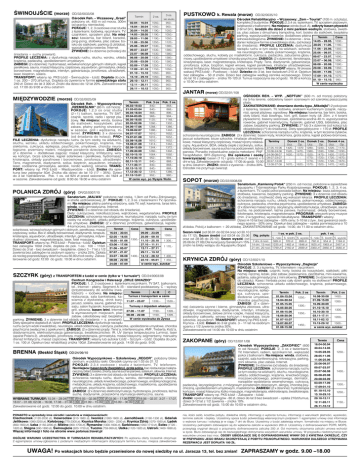 ŚWINOUJŚCIE (morze) OD/32/0033/08 Ośrodek Reh. – Wczasowy „Graal” położony ok. 450 m od morza, 300m od granicy niemieckiej. POKOJE: 1, 2, 3 osobowe oraz studia z łazienkami, lodówką, ręcznikami, TV, czajnikiem, sprzętem plaż. Na miejscu: kawiarnia, bar bilard, karaoke, ping-pong, stołówka, plac zabaw, boisko do siatkówki, parking (5 zł/doba), wypożyczalnia rowerów, Internet. ŻYWIENIE: 3 x dziennie (od kolacji do śniadania + suchy prowiant). PROFILE LECZENIA: z dysfunkcją narządu ruchu, słuchu, wzroku, układu krążenia, padaczką, upośledzeniem umysłowym. ZABIEGI: (2 x dziennie): hydromasaż, wirówka kończyn górnych i dolnych, kąpiel perełkowa, sauna, masaż klasyczny, częściowy, aquavibron, gimnastyka, okłady borowinowe, magnetoterapia, interdyn, galwanizacja, jonoforeza, ultradźwięki, laser, bioptron, solaris. TRANSPORT: własny np. PKS Łódź – Świnoujście – Łódź. Dopłata do pok. 1 os. 200 – 270 zł/turnus. Dopłata do żywienia w formie szwedzkiego stołu 240 zł. Dzieci do lat 3 300 zł. Zniżki dla dzieci do 12 lat 20%. Zakwaterowanie od. 17:00 do 9:00 w dniu ostatnim MIĘDZYWODZIE (morze) OD/32/0025/09 Ośrodek Reh. - Wypoczynkowy „RZEMIEŚLNIK” (80 m. od morza). POKOJE: 1,2,3 os oraz studia (2+1) balkon, łazienka, TV SAT, czajnik, ręcznik, radio i sprzęt plażowy. Na miejscu: winda, boiska do siatkówki, koszykówki, plac zabaw, płatny parking strzeżony w sezonie, grill i wędzarnia, Internet. ŻYWIENIE: 3 x dziennie (od śniadania do kolacji). PROFILE LECZENIA: dysfunkcje narządu ruchu (w tym osoby na wózkach), słuchu, wzroku, układu oddechowego, pokarmowego, krążenia, mastektomia, cukrzyca, epilepsja, psychiczne, umysłowe, choroby neurologiczne, przemiany materii, mózgowe porażenie dziecięce. ZABIEGI: (2 x dziennie + dodatkowe zajęcia): masaż klasyczny, limfatyczny, wirowy kończyn, bicze szkockie, kąpiel solankowa i perełkowa, hydromasaż, krioterapia, okłady parafinowe i borowinowe, jonoforeza, ultradźwięki, Tens, magnetronik, diadynamik, sollux, bioptron, aquavibron, inhalacje, laser, codzienna gimnastyka, aerobik, nordic walking, siłownia. TRANSPORT: własny np. PKS Łódź – Międzywodzie – Łódź. Zniżka dla opiekuna bez zabiegów 50zł. Zniżka dla dzieci do lat 10 (17 – 35%). Dzieci do 3 lat 10zł/dziennie. Pok. 1 os. od 924 zł przed sezonem, do 1624 zł w sezonie. Zakwaterowanie od godz. 8:00 do 16:00 w dniu ostatnim POLANICA ZDRÓJ 3 os. Termin 2 os. lub studio 02.04 – 16.04 1050,- 950, 16.04 – 30.04 1050,- 950, 30.04 – 14.05 1190,- 1050, 14.05 – 28.05 1190,- 1050, 28.05 – 11.06 1190,- 1050, 11.06 – 25.06 1250,- 1120, 25.06 – 09.07 1530,- 1380, 09.07 – 23.07 1530,- 1380, 23.07 – 06.08 1530,- 1380, 06.08 – 20.08 1530,- 1380, 20.08 – 03.09 1530,- 1380, 03.09 – 17.09 1250,- 1150, 17.09 – 01.10 1150,- 1050, 01.10 – 15.10 1050,- 950, 15.10 – 29.10 1050,- 950, 29.10 – 12.11 1050,- 950, 12.11 – 26.11 1050,- 950, 26.11 – 10.12 1050,- 950,- Termin Pok. 3 os Pok. 2 os. 06.03-19.03 840,- 868, 21.03-03.04 840,- 868, 05.04-18.04 868,- 896, 20.04-03.05 966,- 994, 05.05-18.05 1120,- 1148, 20.05-02.06 1260,- 1302, 04.06-17.06 1288,- 1386, 19.06-02.07 1386,- 1442, 04.07-17.07 1610,- 1652, 19.07-01.08 1610,- 1652, 03.08-16,08 1610,- 1652, 18.08-31.08 1414,- 1442, 02.09-15.09 1344,- 1372, 17.09-30.09 1260,- 1302, 02.10-15.10 1064,- 1092, 17.10-30.10 952,- 994, 02.11-15.11 840,- 868, 17.11-30.11 840,- 868, 02.12-15.12 840,- 868, 17.12-30.12 1316,- 1386, 31.12-13.01 952,- 980,W cenie wyc. po Wyspie Wolin (góry) OR/02/0007/10 Sanatorium „MALWA” położone nad rzeką, 1,3km od Parku Zdrojowego, w strefie uzdrowiskowej „B”. POKOJE: 1, 2, 3 os. z łazienkami i TV, ręcznikami. Na miejscu: płatny parking strzeżony, sala TV, sejf, kawiarnia, taras letni, winda, sala gimnastyczna, Internet. ŻYWIENIE: 3 x dziennie (od obiadu do śniadania). Diety: cukrzycowa, niskotłuszczowa, wątrobowa, wegetariańska. PROFILE LECZENIA: schorzenia neurologiczne, reumatyczne, narządu ruchu (w tym osoby na wózkach), układu pokarmowego, krążenia, cukrzyca, upośledzenie umysłowe. ZABIEGI: (2 x dziennie) jonoforeza, galwanizacja, kąpiele: 4-komorowa, borowinowa, Termin Cena Termin Cena solankowa, wirowa kończyn górnych i dolnych, perełkowa, masaż 09.09 – 23.09 częściowy, sollux, Bio-V, okłady borowinowe, diadynamik, terapuls, 16.04 – 30.04 1350,krioterapia, aquavibron, ultradźwięki, interdyn, gimnastyka, indywi- 02.05 – 16.05 25.09 – 09.10 1350,- 11.10 – 25.10 1 300,dualna i zbiorowa, magnetoterapia, laser, fotel masujący. 18.05 – 01.06 TRANSPORT: własny np. PKS Łódź – Polanica – Łódź. Opiekun 03.06 – 17.06 27.10 – 11.11 bez zabiegów 100zł zniżki, dopłata do pok. 1-os.: 100 – 110zł. 1 170,13.11 – 27.11 Dzieci do 3 lat – bez świadczeń – bezpłatnie, dzieci 3 – 7 lat z 1/2 21.06 – 05.07 29.11 – 13.12 żywienia bez zabiegów na osobnym spaniu – zniżka 25%, Opłata 07.07 – 21.07 za nocleg poprzedzający dzień turnusu 50,00 zł od osoby. Zakwa- 23.07 – 06.08 1400,- 14.12 – 28.12 1 400,terowanie od godz.12:00 do godz. 10.00 w dniu ostatnim. 08.08 – 22.08 22.10 – 05.01 1 450, 24.08 – 07.09 w cenie wyc. autokar SZCZYRK (góry) z TRANSPORTEM z Łodzi w cenie (tylko w 1 turnusie*) OD/24/0003/08 Centrum Kongresów i Rekreacji „ORLE GNIAZDO” POKOJE: 1, 2, 3 osobowe z łazienkami,recznikami, TV SAT, balkonami, tel., Internet – płatny. Segment A i B – standard podstawowy, C – wyższy (przystosowany do wózków inwaTermin A i B C lidzkich) + lodówka. Na miejscu: restauracja, sala bankietowa, ka- Turnus z transportem w cenie wiarnia z dyskoteką, drink bary, 11.07 – 25.07 1339,– 1539,– jacuzzi, solaria, sauna, gabinet ma Turnusy z dojazdem własnym sażu, salon fryzjerski, kosmetyczny, grill, siłownia, basen letni, Internet 27.06 – 11.07 1199,- 1399,w wyznaczonych miejscach, plac 1199,- 1399,zab