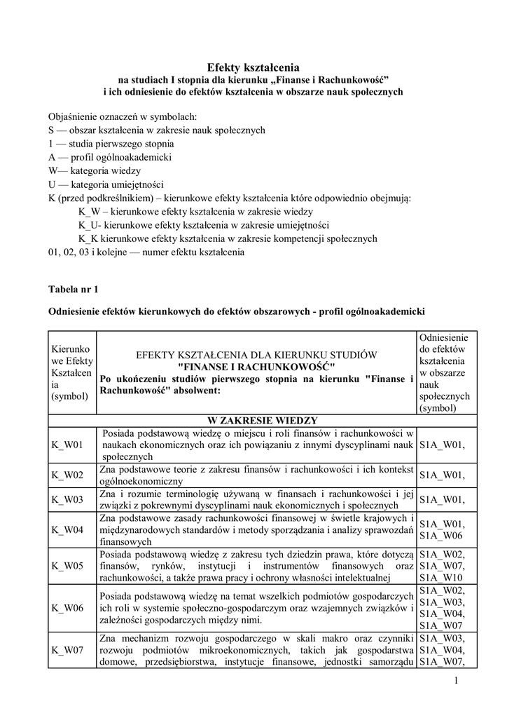 Efekty kształcenia na studiach I stopnia dla kierunku „Finanse i Rachunkowość” i ich odniesienie do efektów kształcenia w obszarze nauk społecznych Objaśnienie oznaczeń w symbolach: S — obszar kształcenia w zakresie nauk społecznych 1 — studia pierwszego stopnia A — profil ogólnoakademicki W— kategoria wiedzy U — kategoria umiejętności K (przed podkreślnikiem) – kierunkowe efekty kształcenia które odpowiednio obejmują: K_W – kierunkowe efekty kształcenia w zakresie wiedzy K_U- kierunkowe efekty kształcenia w zakresie umiejętności K_K kierunkowe efekty kształcenia w zakresie kompetencji społecznych 01, 02, 03 i kolejne — numer efektu kształcenia Tabela nr 1 Odniesienie efektów kierunkowych do efektów obszarowych - profil ogólnoakademicki Odniesienie Kierunko do efektów EFEKTY KSZTAŁCENIA DLA KIERUNKU STUDIÓW we Efekty kształcenia "FINANSE I RACHUNKOWOŚĆ" Kształcen w obszarze Po ukończeniu studiów pierwszego stopnia na kierunku "Finanse i ia nauk Rachunkowość" absolwent: (symbol) społecznych (symbol) W ZAKRESIE WIEDZY Posiada podstawową wiedzę o miejscu i roli finansów i rachunkowości w K_W01 naukach ekonomicznych oraz ich powiązaniu z innymi dyscyplinami nauk S1A_W01, społecznych Zna podstawowe teorie z zakresu finansów i rachunkowości i ich kontekst K_W02 S1A_W01, ogólnoekonomiczny Zna i rozumie terminologię używaną w finansach i rachunkowości i jej K_W03 S1A_W01, związki z pokrewnymi dyscyplinami nauk ekonomicznych i społecznych Zna podstawowe zasady rachunkowości finansowej w świetle krajowych i S1A_W01, K_W04 międzynarodowych standardów i metody sporządzania i analizy sprawozdań S1A_W06 finansowych Posiada podstawową wiedzę z zakresu tych dziedzin prawa, które dotyczą S1A_W02, K_W05 finansów, rynków, instytucji i instrumentów finansowych oraz S1A_W07, rachunkowości, a także prawa pracy i ochrony własności intelektualnej S1A_W10 S1A_W02, Posiada podstawową wiedzę na temat wszelkich podmiotów gospodarczych S1A_W03, K_W06 ich roli w systemie społeczno-gospodarczym oraz wzajemnych związków i S1A_W04, zależności gospodarczych między nimi. S1A_W07 Zna mechanizm rozwoju gospodarczego w skali makro oraz czynniki S1A_W03, K_W07 rozwoju podmiotów mikroekonomicznych, takich jak gospodarstwa S1A_W04, domowe, przedsiębiorstwa, instytucje finansowe, jednostki samorządu S1A_W07, 1 terytorialnego oraz ich wzajemne związki i uwarunkowania. K_W08 K_W09 K_W10 K_W11 K_W12 K_W13 K_U01 K_U02 K_U03 K_U04 K_U05 K_U06 K_U07 K_U08 K_U09 K_U10 K_U11 S1A_W08, S1A_W11 S1A_W04, Posiada wiedzę o rolach, w jakich występuje człowiek w procesach S1A_W05 społecznych i gospodarczych oraz o wzajemnych uwarunkowaniach takich S1A_W09, ról S1A_W011 Zna i rozumie warunki i procesy rozwojowe kapitału ludzkiego oraz S1A_W05, warunki prowadzące od osiągnięcia osobistego sukcesu zawodowego S1A_W09, Posiada wiedzę o roli instytucji i organizacji sektora publicznego oraz S1A_W02, pozarządowych instytucji pożytku publicznego dla życia i rozwoju ludzi S1A_W05 oraz społeczności Zna podstawy technologii informacyjnych oraz metody wykorzystywania programów i narzędzi do analizy danych i prezentacji wyników w zakresie S1A_W06 finansów i rachunkowości. Zna i rozumie znaczenie zasad etyki w biznesie i innych dziedzinach życia S1A_W07, społeczno-gospodarczego oraz zasady ochrony własności przemysłowej, S1A_W10 intelektualnej i praw autorskich Posiada podstawową wiedzę o formach, zasadach i warunkach prowadzenia S1A_W07, indywidualnej działalności gospodarczej oraz warunkach rozwoju S1A_W08, przedsiębiorczości S1A_W11 W ZAKRESIE UMIEJĘTNOŚCI S1A_U01, Potrafi interpretować zjawiska i procesy zachodzące w sferze finansowej S1A_U09, zarówno w skali makro-, jak i w skali mikroekonomicznej S1A_U10 S1A_U01, Potrafi wykorzystać wiedzę o sposobach pozyskiwania danych informacji i S1A_U02, dokonać ich analizy w oparciu o metody nauk finansowych w celach S1A_U03, zarządczych S1A_U09, S1A_U10 Potrafi dokonać prawidłowej analizy zjawisk i procesów finansowych S1A_U01, zachodzących na rynkach finansowych i w podmiotach gospodarczych oraz S1A_U02, w jednostkach samorządu terytorialnego w celach kontrolnych, S1A_U03, inwestycyjnych lub na potrzeby banków i instytucji finansowych S1A_U08 S1A_U04, Potrafi wykorzystać narzędzia i metody ilościowe do sporządzania prognoz S1A_U05, procesów gospodarczych i finansowych w celach zarządczych S1A_U06 Prawidłowo posługuje się normami prawa z zakresu finansów i rachunkowości, w tym Międzynarodowymi Standardami Rachunkowości S1A_U05 oraz przepisami kodeksów etyki zawodowej i zasadami współżycia społecznego Potrafi wykorzystać zdobytą wiedzę z zakresu finansów i rachunkowości do S1A_U06, rozwiązywania konkretnych problemów w praktyce życia gospodarczego S1A_U07 Posiada umiejętność formułowania wariantowych rozwiązań pojawiających S1A_U06, się problemów i rekomendowania rozwiązań optymalnych. S1A_U07 Zaproponuje właściwe instrumenty finansowe dla rozwiązania konkretnego S1A_U04, problemu finansowego i przewidzi skutki swoich działań S1A_U07 przeprowadzi analizę i ocenę własnych działań i wskaże ewentualne obszary S1A_U06 wymagające modyfikacji i doskonalenia Potrafi zrozumieć i przewidzieć skutki decyzji politycznych w sferze S1A-U08 finansów dla rozwoju życia społecznego i gospodarczego Potrafi napisać krótki tekst o sprawach z zakresu finansów i rachunkowości S1A_U09 2 K_U12 K_U13 K_K01 K_K02 K_K03 K_K04 K_K05 K_K06 K_K07 K_K08 K_K09 K_K10 K_K11 K_K12 w języku polskim i w języku angielskim zgodnie z regułami warsztatu naukowego Potrafi przygotować wystąpienie ustne wraz z prezentacją graficzną o sprawach zawodowych Potrafi porozumieć się w języku angielskim lub niemieckim w sprawach z zakresu finansów i rachunkowości. W ZAKRESIE KOMPETENCJI SPOŁECZNYCH kreatywnie rozwija swoje kompetencje, uwzględnia