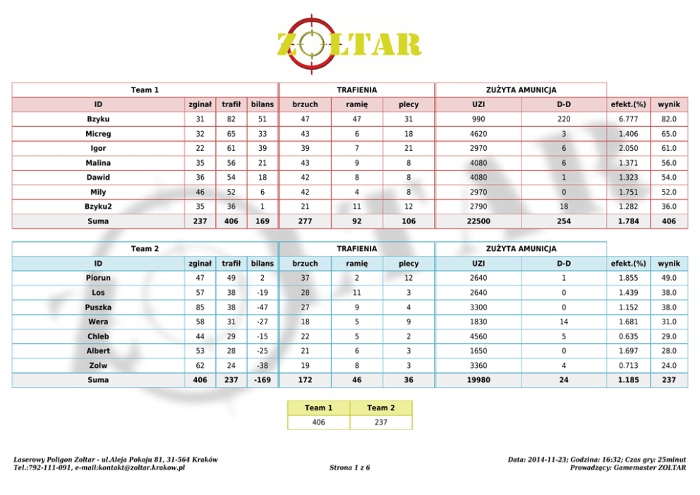 Team 1 TRAFIENIA ZUŻYTA AMUNICJA ID zginał trafił bilans brzuch ramię plecy UZI D-D efekt.(%) wynik Bzyku 31 82 51 47 47 31 990 220 6.777 82.0 Micreg 32 65 33 43 6 18 4620 3 1.406 65.0 Igor 22 61 39 39 7 21 2970 6 2.050 61.0 Malina 35 56 21 43 9 8 4080 6 1.371 56.0 Dawid 36 54 18 42 8 8 4080 1 1.323 54.0 Mily 46 52 6 42 4 8 2970 0 1.751 52.0 Bzyku2 35 36 1 21 11 12 2790 18 1.282 36.0 Suma 237 406 169 277 92 106 22500 254 1.784 406 Team 2 TRAFIENIA ZUŻYTA AMUNICJA ID zginał trafił bilans brzuch ramię plecy UZI D-D efekt.(%) wynik Piorun 47 49 2 37 2 12 2640 1 1.855 49.0 Los 57 38 -19 28 11 3 2640 0 1.439 38.0 Puszka 85 38 -47 27 9 4 3300 0 1.152 38.0 Wera 58 31 -27 18 5 9 1830 14 1.681 31.0 Chleb 44 29 -15 22 5 2 4560 5 0.635 29.0 Albert 53 28 -25 21 6 3 1650 0 1.697 28.0 Zolw 62 24 -38 19 8 3 3360 4 0.713 24.0 Suma 406 237 -169 172 46 36 19980 24 1.185 237 Laserowy Poligon Zoltar - ul.Aleja Pokoju 81, 31-564 Kraków Tel.:792-111-091, e-mail:[email protected] Team 1 Team 2 406 237 Strona 1 z 6 Data: 2014-11-23; Godzina: 16:32; Czas gry: 25minut Prowadzący: Gamemaster ZOLTAR Team 1 TRAFIENIA ZUŻYTA AMUNICJA ID zginał trafił bilans brzuch ramię plecy UZI D-D efekt.(%) wynik Bzyku 22 103 81 63 47 30 60 254 32.803 103.0 Malina 16 78 63 63 36 17 30 208 32.773 78.0 Igor 14 67 53 44 36 14 630 254 7.579 67.0 Micreg 15 44 29 37 2 7 3900 13 1.124 44.0 Bzyku2 26 38 12 24 16 3 3480 0 1.092 38.0 Dawid 16 36 20 30 9 7 1470 19 2.418 36.0 Mily 14 30 16 28 1 1 2700 10 1.107 30.0 Suma 123 396 274 289 147 79 12270 758 3.040 396 Team 2 TRAFIENIA ZUŻYTA AMUNICJA ID zginał trafił bilans brzuch ramię plecy UZI D-D efekt.(%) wynik Puszka 68 30 -38 24 5 6 120 135 11.765 30.0 Piorun 49 27 -22 22 4 3 2220 6 1.213 27.0 Albert 37 21 -16 13 7 3 2340 0 0.897 21.0 Wera 68 17 -51 13 2 3 3480 9 0.487 17.0 Chleb 22 16 -6 12 2 2 2310 70 0.672 16.0 Los 67 11 -56 8 2 2 2970 0 0.370 11.0 Zolw 85 0 -85 0 0 0 5010 0 0.000 0.0 Suma 396 122 -274 92 22 19 18450 220 0.653 122 Laserowy Poligon Zoltar - ul.Aleja Pokoju 81, 31-564 Kraków Tel.:792-111-091, e-mail:[email protected] Team 1 Team 2 396 122 Strona 2 z 6 Data: 2014-11-23; Godzina: 17:18; Czas gry: 25minut Prowadzący: Gamemaster ZOLTAR Drużyny Miejsce Laserowy Poligon Zoltar - ul.Aleja Pokoju 81, 31-564 Kraków Tel.:792-111-091, e-mail:[email protected] Nazwa Rozgrywki 1 2 Suma Team 1 406 396 802 Team 2 237 122 359 Strona 3 z 6 Data: 2014-11-23 Prowadzący: Gamemaster ZOLTAR Zestawienie wg wyniku Miejsce TRAFIENIA ZUŻYTA AMUNICJA ID zginał trafił bilans brzuch ramię plecy UZI D-D efekt.(%) wynik Bzyku 63.60 222.00 158.40 132.00 112.80 73.20 1260.00 568.80 12.139 222.00 Malina 61.20 160.80 99.60 127.20 54.00 30.00 4932.00 256.80 3.099 160.80 Igor 43.20 153.60 110.40 99.60 51.60 42.00 4320.00 312.00 3.316 153.60 4 Micreg 56.40 130.80 74.40 96.00 9.60 30.00 10224.00 19.20 1.277 130.80 5 Dawid 62.40 108.00 45.60 86.40 20.40 18.00 6660.00 24.00 1.616 108.00 6 Mily 72.00 98.40 26.40 84.00 6.00 10.80 6804.00 12.00 1.444 98.40 7 Piorun 115.20 91.20 -24.00 70.80 7.20 18.00 5832.00 8.40 1.562 91.20 8 Bzyku2 73.20 88.80 15.60 54.00 32.40 18.00 7524.00 21.60 1.177 88.80 9 Puszka 183.60 81.60 -102.00 61.20 16.80 12.00 4104.00 162.00 1.913 81.60 Albert 108.00 58.80 -49.20 40.80 15.60 7.20 4788.00 0.00 1.228 Los 148.80 58.80 -90.00 43.20 15.60 6.00 6732.00 0.00 0.873 11 Wera 151.20 57.60 -93.60 37.20 8.40 14.40 6372.00 27.60 0.900 57.60 12 Chleb 79.20 54.00 -25.20 40.80 8.40 4.80 8244.00 90.00 0.648 54.00 13 Zolw 176.40 28.80 -147.60 22.80 9.60 3.60 10044.00 4.80 0.287 28.80 10 Laserowy Poligon Zoltar - ul.Aleja Pokoju 81, 31-564 Kraków Tel.:792-111-091, e-mail:[email protected] Strona 4 z 6 58.80 Data: 2014-11-23 Prowadzący: Gamemaster ZOLTAR Zestawienie wg bilansu Miejsce TRAFIENIA ZUŻYTA AMUNICJA ID zginał trafił bilans brzuch ramię plecy UZI D-D efekt.(%) wynik Bzyku 63.60 222.00 158.40 132.00 112.80 73.20 1260.00 568.80 12.139 222.00 Igor 43.20 153.60 110.40 99.60 51.60 42.00 4320.00 312.00 3.316 153.60 Malina 61.20 160.80 99.60 127.20 54.00 30.00 4932.00 256.80 3.099 160.80 4 Micreg 56.40 130.80 74.40 96.00 9.60 30.00 10224.00 19.20 1.277 130.80 5 Dawid 62.40 108.00 45.60 86.40 20.40 18.00 6660.00 24.00 1.616 108.00 6 Mily 72.00 98.40 26.40 84.00 6.00 10.80 6804.00 12.00 1.444 98.40 7 Bzyku2 73.20 88.80 15.60 54.00 32.40 18.00 7524.00 21.60 1.177 88.80 8 Piorun 115.20 91.20 -24.00 70.80 7.20 18.00 5832.00 8.40 1.562 91.20 9 Chleb 79.20 54.00 -25.20 40.80 8.40 4.80 8244.00 90.00 0.648 54.00 10 Albert 108.00 58.80 -49.20 40.80 15.60 7.20 4788.00 0.00 1.228 58.80 11 Los 148.80 58.80 -90.00 43.20 15.60 6.00 6732.00 0.00 0.873 58.80 12 Wera 151.20 57.60 -93.60 37.20 8.40 14.40 6372.00 27.60 0.900 57.60 13 Puszka 183.60 81.60 -102.00 61.20 16.80 12.00 4104.00 162.00 1.913 81.60 14 Zolw 176.40 28.80 -147.60 22.80 9.60 3.60 10044.00 4.80 0.287 28.80 Laserowy Poligon Zoltar - ul.Aleja Pokoju 81, 31-564 Kraków Tel.:792-111-091, e-mail:[email protected] Strona 5 z 6 Data: 2014-11-23 Prowadzący: Gamemaster ZOLTAR Zestawienie wg efektywności Miejsce TRAFIENIA ZUŻYTA AMUNICJA ID zginał trafił bilans brzuch ramię plecy UZI D-D efekt.(%) wynik Bzyku 63.60 222.00 158.40 132.00 112.80 73.20 1260.00 568.80 12.139 222.00 Igor 43.20 153.60 110.40 99.60 51.60 42.00 4320.00 312.00 3.316 153.60 Malina 61.20 160.80 99.60 127.20 54.00 30.00 4932.00 256.80 3.099 160.80 4 Puszka 183.60 81.60 -102.00 61.20 16.80 12.00 4104.00 162.00 1.913 81.60 5 Dawid 62.40 108.00 45.60 86.40 20.40 18.00 6660.00 24.00 1.616 108.00 6 Piorun 115.20 91.20 -24.00 70.80 7.20 18.00 5832.00 8.40 1.562 91.20 7 Mily 72.00 98.40 26.40 84.00 6.00 10.80 6804.00 12.00 1.444 98.40 8 Micreg 56.40 130.80 74.40 96.00 9.60 30.00 10224.00 19.20 1.277 130.80 9 Albert 108.00 58.80 -49.20 40.80 15.60 7.20 4788.00 0.00 1.228 58.80 10 Bzyku2 73.20 88.80 15.60 54.00 32.40 18.00 7524.00 21.60 1.177 88.80 11 Wera 151.20 57.60 -93.60 37.20 8.40 14.40 6372.00 27.60 0.900 57.60 12 Los 148.80 58.80 -90.00 43.20 15.60 6.00 6