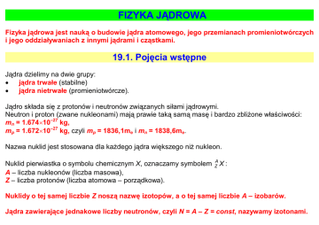 FIZYKA JĄDROWA Fizyka jądrowa jest nauką o budowie jądra atomowego, jego przemianach promieniotwórczych i jego oddziaływaniach z innymi jądrami i cząstkami. 19.1. Pojęcia wstępne Jądra dzielimy na dwie grupy: • jądra trwałe (stabilne) • jądra nietrwałe (promieniotwórcze). Jądro składa się z protonów i neutronów związanych siłami jądrowymi. Neutron i proton (zwane nukleonami) mają prawie taką samą masę i bardzo zbliżone właściwości: mn = 1.674×10–27 kg, mp = 1.672×10–27 kg, czyli mp = 1836,1me i mn = 1838,6me. Nazwa nuklid jest stosowana dla każdego jądra większego niż nukleon. Nuklid pierwiastka o symbolu chemicznym X, oznaczamy symbolem A – liczba nukleonów (liczba masowa), Z – liczba protonów (liczba atomowa – porządkowa). A Z X : Nuklidy o tej samej liczbie Z noszą nazwę izotopów, a o tej samej liczbie A – izobarów. Jądra zawierające jednakowe liczby neutronów, czyli N = A – Z = const, nazywamy izotonami. N N=Z 0 Z Rys. 19.1. Liczba neutronów N w miarę wzrostu liczby atomowej Z coraz bardziej przewyższa liczbę protonów w jądrach kolejnych pierwiastków. Nuklid 126C przyjęto do zdefiniowania jednostki masy atomowej (j.m.a. = 1.66×10–27 kg) – wynosi 12. Jednostka masy atomowej jest równoważna energii 931 MeV. Znanych jest 105 pierwiastków chemicznych, z których przeważająca większość posiada izotopy. Istnieje około 300 izotopów trwałych i powyżej 1000 nietrwałych (promieniotwórczych). Nukleony posiadają spin połówkowy, tj. ½h . Spin jądra złożonego z parzystej liczby nukleonów jest liczbą całkowitą (w jednostkach h ). Spin jądra złożonego z nieparzystej liczby cząstek jest liczną połówkową (w jednostkach h ). Jądra atomowe posiadają także momenty magnetyczne, których jednostką jest tzw. magnetron jądrowy µn = eh ≈ 10 −3 µB 2m p (19.1) zdefiniowany wzorem podobnym do magnetronu Bohra. Magnetron jądrowy jest m p me ≈ 1836 razy mniejszy od magnetronu Bohra. 19.2. Rozmiar jądra Wynikiem doświadczeń Rutherforda (1911 r.), polegających na rozpraszaniu cząstek α przez cienkie folie złota, było odkrycie jądra atomowego i oszacowanie jego rozmiarów (promień mniejszy od 10–14 m). Później jako wiązki o małej długości fali stosowano wysokoenergetyczne protony i neutrony. dośw. Ernsta Rutherforda (~1910) źródło cząstek α (jądra He) detektor cząstek α θ Folia metal. 1871-1937 Nobel 1908 (Chemia) • rozproszenie: cząstka naładowana → odpychające oddziaływanie kulombowskie • silne wsteczne rozprosz. → silne oddz.→ silne pola→ ładunek ~ punktowy F ~ cała materia folii skupiona w ciężkim jądrze atomy = ciężkie jądra naładowane dodatnio o b. małych rozmiarach (~ 10-14 m << rozmiar atomu ~ 10-10 m ) Średni promień jąder (oprócz najmniejszych) ( ) R ≈ 1.2 × 10 −15 m A1 3 (19.2) Jednostka: fermii = 10–15 m. Jeżeli jądro potraktujemy jako kroplę cieczy jądrowej to liczba cząstek na jednostkę objętości wynosi N= A 44 nukleonów = 1 . 38 × 10 m3 (4 3 )πR 3 (19.3) Gęstość masy to iloczyn tej liczby i masy nukleonu ( )( ) ρ = Nmp = 1.38 × 10 44 1.67 × 10 − 27 kg m3 = 2.3 × 1017 kg m3 (19.4) Wynika stąd, że 1 cm3 materii jądrowej ważyłby 230 milionów ton. Gęstość materii jądrowej nie zależy od rozmiarów jądra, ponieważ jego objętość jest proporcjonalna do liczby masowej A. 19.3. Energia wiązania jądra. Defekt masy Jądro można traktować jako kulę zawierającą neutrony i protony. Odpychającym siłom kulombowskim między protonami przeciwdziałają silne, specyficzne siły jądrowe, które działają między wszystkimi nukleonami. Związana jest z nimi energia wiązania jądra. Energią wiązania nukleonu nazywamy wielkość równą pracy potrzebnej na usunięcie danego nukleonu z jądra bez nadania mu energii kinetycznej. Całkowita energia wiązania jądra jest określona jako praca potrzebna na rozłożenie jądra na jego składowe nukleony bez nadania im energii kinetycznej. Energię wiązania jądra określimy za pomocą ”niedoboru masy” (defektu masy) jądra. Suma mas atomowych poszczególnych nukleonów jest zawsze większa o kilka dziesiątych procent od masy jądra utworzonego z tych nukleonów. Zgodnie ze wzorem Einsteina Ew = ∆Mc 2 = c 2 [Zm p + ( A − Z )mn − M j ] (19.5) gdzie ∆M jest defektem masy, czyli różnicą między sumą mas swobodnych nukleonów i masą jądra. 24 Mg 20 Ne Ca Fe Zn Kr Mo Te O 12 C 4He 11 7 B MeV na nukleon 8 16 6 Sm Lu Hg Ra 7 6 5 Li Li 4 3 3 H 2 2 1 0 H 50 100 150 Liczba masowa A 200 Rys. 19.2. Energia wiązania przypadająca na jeden nukleon w funkcji liczby masowej. Krzywa osiąga maksimum 8.7 MeV w pobliżu A = 60. Spadek dla malejących A nie jest monotoniczny, lecz wykazuje ostre maksimum dla liczb masowych będących wielokrotnościami 4 (4, 12, 16, ....). Wzrosty energii wiązania występują dla magicznych liczbach nukleonów: 2, 8, 20, 28, 50, 82, 126, 152 (Z lub N). Wśród nuklidów trwałych (niepromieniotwórczych) przeważają jądra parzysto-parzyste, tzn. o parzystych liczbach zarówno protonów jak i neutronów. Tabela 19.1. Rozkład trwałych nuklidów według rodzaju ich parzystości. A parzyste nieparzyste N parzyste nieparzyste parzyste nieparzyste Z parzyste nieparzyste nieparzyste parzyste Liczna trwałych nuklidów 161 4 50 54 19.4. Modele struktury jądra atomowego Modele stanowią uproszczone teorie o ograniczonym zakresie stosowalności: § model kroplowy, § model powłokowy, § model kolektywny. Każdy z tych modeli jest w stanie wyjaśnić pewne właściwości, nie odwołując się do wszystkich szczegółowych właściwości sił jądrowych. 19.4.1. Model kroplowy Model kroplowy, zaproponowany przez N. Bohra w 1939 r., powstał na gruncie podobieństw między jądrem atomowym a kroplą cieczy, takich jak: § stała gęstość materii jądrowej i energii wiązania na jeden nukleon, § stała gęstość ci
