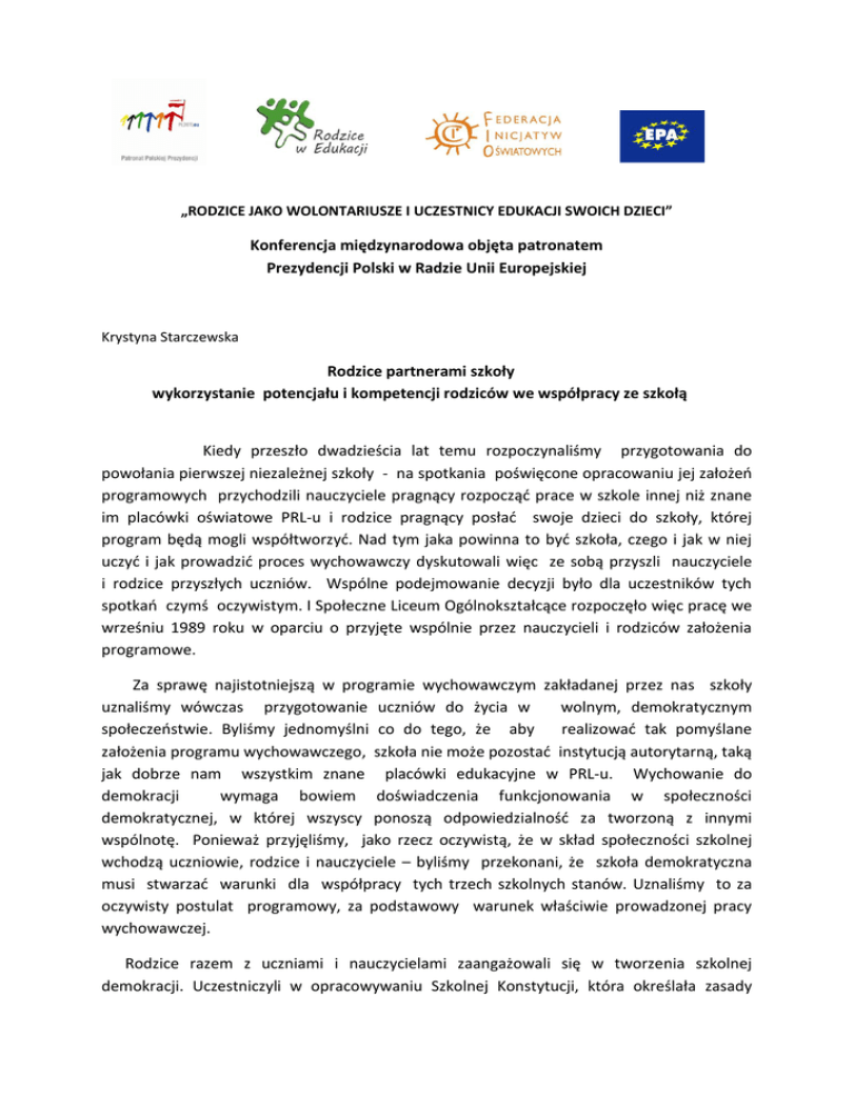 „RODZICE JAKO WOLONTARIUSZE I UCZESTNICY EDUKACJI SWOICH DZIECI” Konferencja międzynarodowa objęta patronatem Prezydencji Polski w Radzie Unii Europejskiej Krystyna Starczewska Rodzice partnerami szkoły wykorzystanie potencjału i kompetencji rodziców we współpracy ze szkołą Kiedy przeszło dwadzieścia lat temu rozpoczynaliśmy przygotowania do powołania pierwszej niezależnej szkoły - na spotkania poświęcone opracowaniu jej założeń programowych przychodzili nauczyciele pragnący rozpocząć prace w szkole innej niż znane im placówki oświatowe PRL-u i rodzice pragnący posłać swoje dzieci do szkoły, której program będą mogli współtworzyć. Nad tym jaka powinna to być szkoła, czego i jak w niej uczyć i jak prowadzić proces wychowawczy dyskutowali więc ze sobą przyszli nauczyciele i rodzice przyszłych uczniów. Wspólne podejmowanie decyzji było dla uczestników tych spotkań czymś oczywistym. I Społeczne Liceum Ogólnokształcące rozpoczęło więc pracę we wrześniu 1989 roku w oparciu o przyjęte wspólnie przez nauczycieli i rodziców założenia programowe. Za sprawę najistotniejszą w programie wychowawczym zakładanej przez nas szkoły uznaliśmy wówczas przygotowanie uczniów do życia w wolnym, demokratycznym społeczeństwie. Byliśmy jednomyślni co do tego, że aby realizować tak pomyślane założenia programu wychowawczego, szkoła nie może pozostać instytucją autorytarną, taką jak dobrze nam wszystkim znane placówki edukacyjne w PRL-u. Wychowanie do demokracji wymaga bowiem doświadczenia funkcjonowania w społeczności demokratycznej, w której wszyscy ponoszą odpowiedzialność za tworzoną z innymi wspólnotę. Ponieważ przyjęliśmy, jako rzecz oczywistą, że w skład społeczności szkolnej wchodzą uczniowie, rodzice i nauczyciele – byliśmy przekonani, że szkoła demokratyczna musi stwarzać warunki dla współpracy tych trzech szkolnych stanów. Uznaliśmy to za oczywisty postulat programowy, za podstawowy warunek właściwie prowadzonej pracy wychowawczej. Rodzice razem z uczniami i nauczycielami zaangażowali się w tworzenia szkolnej demokracji. Uczestniczyli w opracowywaniu Szkolnej Konstytucji, która określała zasady demokracji szkolnej opartej na klasycznym trójpodziale władzy, powołując - władzę ustawodawczą czyli Sejm Szkolony, władzę wykonawczą czyli Radę Szkoły i władzę sądowniczą czyli Szkolny Sąd. Do każdego organu władz szkolnych, zgodnie z Konstytucją, mieli wchodzić wybrani w demokratycznych wyborach, w równych proporcjach, przedstawiciele trzech szkolnych stanów – uczniów, rodziców i nauczycieli. Rodzice aktywnie uczestniczyli w wyborach, współpracowali z uczniami i nauczycielami, zajmując często ważne stanowiska w szkolnych władzach. Szczególnie istotny był udział rodziców prawników w Sądzie Szkolnym – dzięki ich kompetencji szkolne rozprawy sądowe były prowadzone fachowo i z wielką powagą. Wspominam wydarzenia sprzed lat dwudziestu, od których zaczęła się działalność I Społecznego Liceum Ogólnokształcącego, a dziś już zespołu sześciu szkół funkcjonujących według stworzonych wówczas zasad programowych, po to by zastanowić się nad tym, jakie warunki muszą zostać spełnione, by rodzice stali się rzeczywistymi partnerami szkoły, aby można było w pełni wykorzystać ich potencjał i kompetencje we współpracy ze szkołą. Ideą szkół społecznych tworzonych u progu przemian ustrojowych w Polsce było partnerstwo z rodzicami w tworzeniu i prowadzeniu szkoły . Rodzice byli twórcami stowarzyszeń społecznych, które otrzymywały status organów prowadzących szkołę. Stąd właśnie pochodzi nazwa „szkoły społeczne” w odróżnieniu od szkół publicznych prowadzonych przez władze państwowe, a potem gminne. W pierwszych latach niepodległości byliśmy przekonani, że tworzenie szkół społecznych może stać się swoistym laboratorium przemian dla całego systemu edukacji, otworzyć drogą dla oddolnie dokonującej się reformy: włączenia w proces prowadzenia szkoły rodziców, odejścia od autorytarnego zbiurokratyzowanego stylu zarządzania szkołą, nastawienia procesu kształcenia i wychowania na rozwijanie samodzielności myślenia i działania uczniów. Z doświadczeń zdobytych przeze mnie w tamtych latach wynika, że rodzice stawali się partnerami szkoły w jej działaniu wówczas, gdy mogli mieć rzeczywisty, a nie jedynie fikcyjny i pokazowy, wpływ na sposób funkcjonowania szkoły, gdy mogli współdecydować o najważniejszych dla całej szkolnej społeczności sprawach. Przeszło dwudziestoletnie doświadczenie naszych szkół potwierdza to przeświadczenie. Doświadczenia szkół społecznych nie stały się jednak „laboratorium przemian” systemu polskiej edukacji, pozostały marginesem tego systemu, nie wpływając w istotny sposób na zasady funkcjonowania szkolnictwa publicznego. Z czasem nawet zarzucono nazwę” szkolnictwo społeczne” zrównując szkoły tworzone przez stowarzyszenia rodziców ze szkołami prywatnymi pod wspólnym mianem” szkolnictwa niepublicznego”. Czy w ciągu minionego dwudziestolecia zaszły istotne zmiany we współpracy rodziców ze szkołą ? Wydaje się niestety, że w większości polskich szkół rodzice nadal są postrzegani przez dyrekcję i nauczycieli jako uciążliwi petenci, mający o cos wiecznie pretensje , a ci, którzy ze szkołą współpracują bywają przez pozostałych rodziców traktowani jako swoiści „kolaboranci” dążący jedynie do zaskarbienia łask dla swego dziecka. Utrwalona od czasów PRL-u wrogość szkoły i domu nie została niestety w pełni przełamana przez rozporządzenia MEN-u o tworzeniu Rad Rodziców i rozwijaniu ich współpracy ze szkołą. Rodzice w swej przytłaczającej masie są nadal przekonani, że ich powinnością jest przede wszystkim obrona własnego dziecka przed niesprawiedliwym traktowaniem prze
