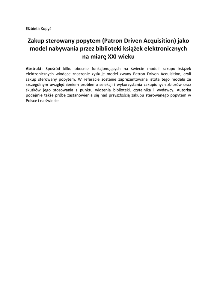 Elżbieta Kopyś Zakup sterowany popytem (Patron Driven Acquisition) jako model nabywania przez biblioteki książek elektronicznych na miarę XXI wieku Abstrakt: Spośród kilku obecnie funkcjonujących na świecie modeli zakupu książek elektronicznych wiodące znaczenie zyskuje model zwany Patron Driven Acquisition, czyli zakup sterowany popytem. W referacie zostanie zaprezentowana istota tego modelu ze szczególnym uwzględnieniem problemu selekcji i wykorzystania zakupionych zbiorów oraz skutków jego stosowania z punktu widzenia biblioteki, czytelnika i wydawcy. Autorka podejmie także próbę zastanowienia się nad przyszłością zakupu sterowanego popytem w Polsce i na świecie.