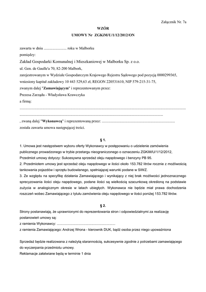 Załącznik Nr. 7a WZÓR UMOWY Nr ZGKiM/U/1/12/2012/ON zawarta w dniu ........................ roku w Malborku pomiędzy: Zakład Gospodarki Komunalnej i Mieszkaniowej w Malborku Sp. z o.o. ul. Gen. de Gaulle'a 70, 82-200 Malbork, zarejestrowanym w Wydziale Gospodarczym Krajowego Rejestru Sądowego pod pozycją 0000299365, wniesiony kapitał zakładowy 10 443 529,63 zł, REGON 220531610, NIP 579-215-31-75, zwanym dalej "Zamawiającym" i reprezentowanym przez: Prezesa Zarządu - Władysława Krawczyka a firmą: ............................................................................................................................................................................... ....................................................................................................................................................... , zwaną dalej "Wykonawcą" i reprezentowaną przez: ............................................................................. została zawarta umowa następującej treści. § 1. 1. Umowa jest następstwem wyboru oferty Wykonawcy w postępowaniu o udzielenie zamówienia publicznego prowadzonego w trybie przetargu nieograniczonego o oznaczeniu ZGKiM/U/1/12/2012, Przedmiot umowy dotyczy: Sukcesywna sprzedaż oleju napędowego i benzyny PB 95. 2. Przedmiotem umowy jest sprzedaż oleju napędowego w ilości około 153.782 litrów rocznie z możliwością tankowania pojazdów i sprzętu budowlanego, spełniającej warunki podane w SIWZ. 3. Ze względu na specyfikę działania Zamawiającego i wynikający z niej brak możliwości jednoznacznego sprecyzowania ilości oleju napędowego, podane ilości są wielkością szacunkową określoną na podstawie zużycia w analogicznym okresie w latach ubiegłych. Wykonawca nie będzie miał prawa dochodzenia roszczeń wobec Zamawiającego z tytułu zamówienia oleju napędowego w ilości poniżej 153.782 litrów. § 2. Strony postanawiają, że uprawnionymi do reprezentowania stron i odpowiedzialnymi za realizację postanowień umowy są: z ramienia Wykonawcy: ............................................................. z ramienia Zamawiającego: Andrzej Wrona - kierownik DUK, bądź osoba przez niego upoważniona Sprzedaż będzie realizowana z należytą starannością, sukcesywnie zgodnie z potrzebami zamawiającego do wyczerpania przedmiotu umowy. Reklamacje załatwiane będą w terminie 1 dnia § 3. Umowa zostaje zawarta od dnia zawarcia do 2013-12-31. § 4. 1. Tankowany olej napędowy powinien spełniać wymagania określone w Rozporządzeniu Ministra Gospodarki i Pracy z dnia 9 grudnia 2008 r. w sprawie wymagań jakościowych dla paliw ciekłych (Dz. U. Nr 169, poz. 1200 oraz z 2008 r. Nr 157, poz. 976). 2. Wykonawca zobowiązany jest do tankowania pojazdów, maszyn budowlanych oraz stosowanych pojemników Zamawiającego na swojej stacji paliw położonej przy ul. ............................................................................................................................................................. 3. Tankowanie pojazdów Zamawiającego odbywać się będzie w tygodniu między godziną 6:00 a 20:00 natomiast w weekendy od 7:00 do 16:00. 4. Wykonawca do wykonywania sprzedaży zapewnia niezbędny sprzęt i materiały. 5. Ilość wydanego oleju napędowego Wykonawca określa na podstawie informacji z jego własnych legalizowanych urządzeń pomiarowych i wydrukowanych lub wypisanych pokwitowaniach wystawianych przez osobę upoważnioną i odebranym przez kierowcę Zamawiającego. § 5. 1. Zamawiający może odstąpić od umowy w terminie 30 dni od powzięcia wiadomości o wystąpieniu istotnej zmiany okoliczności powodującej, że wykonanie umowy nie leży w interesie publicznym, czego nie można było przewidzieć w chwili zawarcia umowy. W takim przypadku Wykonawcy przysługuje wynagrodzenie należne z tytułu wykonania części umowy. 2. W razie powstania sporu związanego z wykonaniem umowy w sprawie zamówienia publicznego, Wykonawca zobowiązany jest wyczerpać drogę postępowania reklamacyjnego, kierując swe roszczenia do Zamawiającego. 3. Niedopuszczalne jest pod rygorem nieważności wprowadzanie zmian i postanowień, jeżeli przy ich uwzględnieniu należałoby zmienić treść oferty na podstawie, której dokonano wyboru Wykonawcy chyba, że konieczność wprowadzenia takich zmian wynika z okoliczności, których nie można było przewidzieć w chwili zawarcia umowy. § 6. Wykonawca zobowiązany jest do bezpłatnego zapewnienia obsługi oraz serwisu wszlkich środków potrzebnych do zapewnienia ciągłości sprzedaży. § 7. 1. Za wykonanie przedmiotu umowy określonego w §1 niniejszej umowy Zamawiający zapłaci Wykonawcy wynagrodzenie maksymalne, które łącznie nie przekroczy kwoty: .......................................... zł netto + ........ podatek VAT = ......................................... zł brutto (słownie: ....................................................................................................................................................................) 2. Wykonawcy, przysługuję z tytułu wykonania umowy wynagrodzenie obliczane w następujący sposób: jest to średnia arytmetyczna z cen hurtowych grupy LOTOS S.A. i PKN ORLEN S.A.: na dzień 2012-12-12 .............................................................................................................. złotych / litr plus marża stała (kwotowo) ................................................................................................... złotych / litr łącznie cena netto .................................................................................................................. złotych / litr VAT ......................................................................................................................................... złotych / litr cena brutto ............................................................................................................