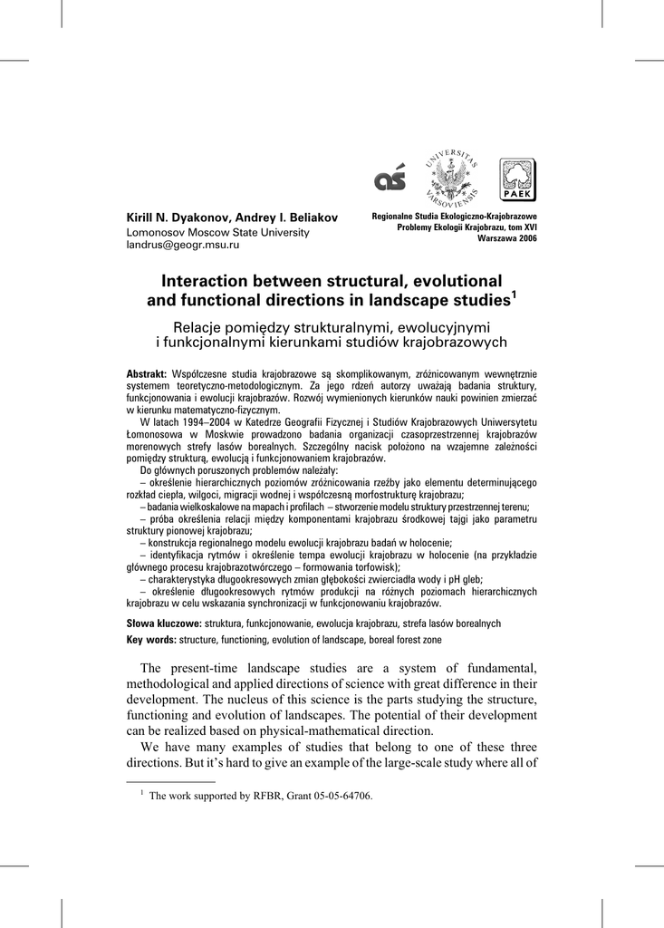 Kirill N. Dyakonov, Andrey I. Beliakov Lomonosov Moscow State University [email protected] Regionalne Studia Ekologiczno-Krajobrazowe Problemy Ekologii Krajobrazu, tom XVI Warszawa 2006 Interaction between structural, evolutional and functional directions in landscape studies1 Relacje pomiêdzy strukturalnymi, ewolucyjnymi i funkcjonalnymi kierunkami studiów krajobrazowych Abstrakt: Wspó³czesne studia krajobrazowe s¹ skomplikowanym, zró¿nicowanym wewnêtrznie systemem teoretyczno-metodologicznym. Za jego rdzeñ autorzy uwa¿aj¹ badania struktury, funkcjonowania i ewolucji krajobrazów. Rozwój wymienionych kierunków nauki powinien zmierzaæ w kierunku matematyczno-fizycznym. W latach 1994–2004 w Katedrze Geografii Fizycznej i Studiów Krajobrazowych Uniwersytetu £omonosowa w Moskwie prowadzono badania organizacji czasoprzestrzennej krajobrazów morenowych strefy lasów borealnych. Szczególny nacisk po³o¿ono na wzajemne zale¿noœci pomiêdzy struktur¹, ewolucj¹ i funkcjonowaniem krajobrazów. Do g³ównych poruszonych problemów nale¿a³y: – okreœlenie hierarchicznych poziomów zró¿nicowania rzeŸby jako elementu determinuj¹cego rozk³ad ciep³a, wilgoci, migracji wodnej i wspó³czesn¹ morfostrukturê krajobrazu; – badania wielkoskalowe na mapach i profilach – stworzenie modelu struktury przestrzennej terenu; – próba okreœlenia relacji miêdzy komponentami krajobrazu œrodkowej tajgi jako parametru struktury pionowej krajobrazu; – konstrukcja regionalnego modelu ewolucji krajobrazu badañ w holocenie; – identyfikacja rytmów i okreœlenie tempa ewolucji krajobrazu w holocenie (na przyk³adzie g³ównego procesu krajobrazotwórczego – formowania torfowisk); – charakterystyka d³ugookresowych zmian g³êbokoœci zwierciad³a wody i pH gleb; – okreœlenie d³ugookresowych rytmów produkcji na ró¿nych poziomach hierarchicznych krajobrazu w celu wskazania synchronizacji w funkcjonowaniu krajobrazów. S³owa kluczowe: struktura, funkcjonowanie, ewolucja krajobrazu, strefa lasów borealnych Key words: structure, functioning, evolution of landscape, boreal forest zone The present-time landscape studies are a system of fundamental, methodological and applied directions of science with great difference in their development. The nucleus of this science is the parts studying the structure, functioning and evolution of landscapes. The potential of their development can be realized based on physical-mathematical direction. We have many examples of studies that belong to one of these three directions. But it’s hard to give an example of the large-scale study where all of 1 The work supported by RFBR, Grant 05-05-64706. 80 Kirill N. Dyakonov, Andrey I. Beliakov them – structural, evolutional and functional were implemented together. The conclusion is that although the studying of structure, functioning and evolution of landscapes is the basis for studying of spatial-temporal organization of landscapes, the problem of synthesis in landscape has appeared from the division of these three directions. All in all the differentiation of these directions and even their transformation into independent sciences is an ordinary fact. Modern geomorphology and soil science experience is the same problem. The problem is: when we declare that landscape studies play the main role in the system of physical geography science, that landscapes are systems, we must present examples and results of researches using all kinds of field measures and mathematical methods of data processing. From 1994 to 2004 the research on spatial-temporal organization of local (in-landscape) geographical systems was carried out by Chair of Physical Geography and Landscape Studies. The interaction between structure, evolution and functioning of moraine landscapes of boreal forest zone were considered. The primary goals of research include: – Revealing of hierarchical levels of a relief as the matrix determining character of redistribution of heat, moisture and water migration of substance and modern morphological structure of a landscape; – Large-scale landscape mapping and profiling – creation of a model of spatial structure of territory; – Definition of intercomponental relations in middle-taiga landscape as parameter of its vertical structure; – Construction of regional model of evolution of an investigated landscape in Holocene; – Revealing of rhythms and definition of velocity of evolution of a landscape in Holocene (intensity of the basic physical-geographical process – bog formation); – Definition of long-term dynamics of depth soil and subsoil water tables and pH-parameter in soils; – Revealing the in-centennial rhythms of production process at various hierarchical levels of a landscape to find out the landscapes synchronous on functioning. The landscape within the range of research is characterized as structural-erosion-moraine plain formed by binary deposits of glacial and limnoglacial genesis at superficial occurrence and Perm marls with a combination of birch-pine-spruce woods on podsolic soils, oligotrophic and mesotrophic bogs on peat-gley soils. The landscape structure of territory is reproduced on the basis of mapping in scales 1:10 000–1:100 000 and landscape transects (in the east part of range) Interaction between structural, evolutional and functional directions... 81 with regular step of 25 m, with 325 points of the complex description, with step of levelling of 12.5 m. General extent of a transect is 8125 m. Yu.G. Puzachenko has carried out connected fractal and the multivariate mathematical analysis of the results of levelling of a structure. In addition the relief was removed from topographical maps of scales 1:10 000 and 1:50 000 on the transect by extent of 21 kms. The correlation between the linear sizes of forms of a relief with a hierarchical level was determined (fig.1). Five hierarchical levels with the minimal sizes of structures are allocated: 1
