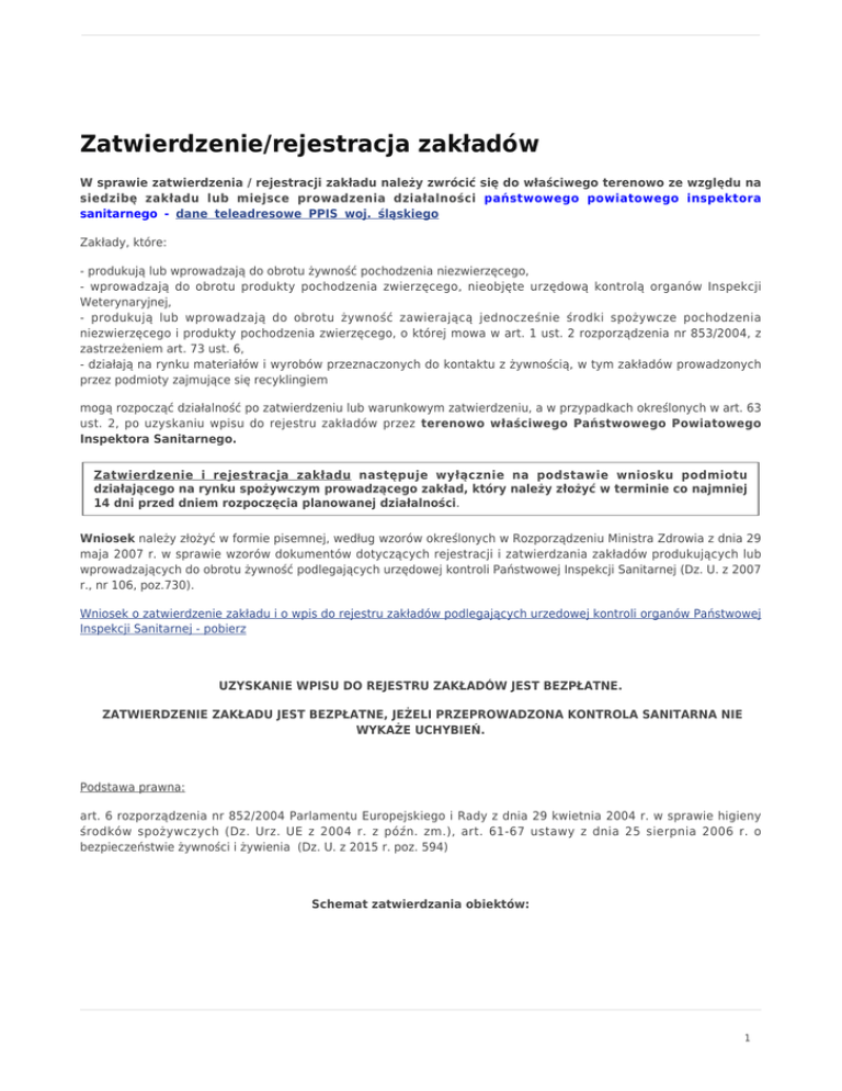 Zatwierdzenie/rejestracja zakładów W sprawie zatwierdzenia / rejestracji zakładu należy zwrócić się do właściwego terenowo ze względu na siedzibę zakładu lub miejsce prowadzenia działalności państwowego powiatowego inspektora sanitarnego - dane teleadresowe PPIS woj. śląskiego Zakłady, które: - produkują lub wprowadzają do obrotu żywność pochodzenia niezwierzęcego, - wprowadzają do obrotu produkty pochodzenia zwierzęcego, nieobjęte urzędową kontrolą organów Inspekcji Weterynaryjnej, - produkują lub wprowadzają do obrotu żywność zawierającą jednocześnie środki spożywcze pochodzenia niezwierzęcego i produkty pochodzenia zwierzęcego, o której mowa w art. 1 ust. 2 rozporządzenia nr 853/2004, z zastrzeżeniem art. 73 ust. 6, - działają na rynku materiałów i wyrobów przeznaczonych do kontaktu z żywnością, w tym zakładów prowadzonych przez podmioty zajmujące się recyklingiem mogą rozpocząć działalność po zatwierdzeniu lub warunkowym zatwierdzeniu, a w przypadkach określonych w art. 63 ust. 2, po uzyskaniu wpisu do rejestru zakładów przez terenowo właściwego Państwowego Powiatowego Inspektora Sanitarnego. Zatwierdzenie i rejestracja zakładu następuje wyłącznie na podstawie wniosku podmiotu działającego na rynku spożywczym prowadzącego zakład, który należy złożyć w terminie co najmniej 14 dni przed dniem rozpoczęcia planowanej działalności. Wniosek należy złożyć w formie pisemnej, według wzorów określonych w Rozporządzeniu Ministra Zdrowia z dnia 29 maja 2007 r. w sprawie wzorów dokumentów dotyczących rejestracji i zatwierdzania zakładów produkujących lub wprowadzających do obrotu żywność podlegających urzędowej kontroli Państwowej Inspekcji Sanitarnej (Dz. U. z 2007 r., nr 106, poz.730). Wniosek o zatwierdzenie zakładu i o wpis do rejestru zakładów podlegających urzedowej kontroli organów Państwowej Inspekcji Sanitarnej - pobierz UZYSKANIE WPISU DO REJESTRU ZAKŁADÓW JEST BEZPŁATNE. ZATWIERDZENIE ZAKŁADU JEST BEZPŁATNE, JEŻELI PRZEPROWADZONA KONTROLA SANITARNA NIE WYKAŻE UCHYBIEŃ. Podstawa prawna: art. 6 rozporządzenia nr 852/2004 Parlamentu Europejskiego i Rady z dnia 29 kwietnia 2004 r. w sprawie higieny środków spożywczych (Dz. Urz. UE z 2004 r. z późn. zm.), art. 61-67 ustawy z dnia 25 sierpnia 2006 r. o bezpieczeństwie żywności i żywienia (Dz. U. z 2015 r. poz. 594) Schemat zatwierdzania obiektów: 1 Właściwy organ może udzielić warunkowego zatwierdzenia jeżeli stwierdzi, że zakład spełnia wszystkie wymagania w zakresie infrastruktury i wyposażenia. Właściwy organ udziela bezwarunkowego zatwierdzenia jedynie wtedy gdy z nowej kontroli urzędowej zakładu, przeprowadzonej w ciągu trzech miesięcy od chwili udzielenia zatwierdzenia warunkowego, wynika, że zakład spełnia inne odpowiednie wymagania prawa paszowego lub żywnościowego. Jeżeli dokonano wyraźnego postępu, ale zakład nadal nie spełnia wszystkich odpowiednich wymagań, właściwy organ może przedłużyć urzędowe zatwierdzenie. Jednakże zatwierdzenie warunkowe nie może przekraczać łącznie sześciu miesięcy. Wpis do rejestru zakładów następuje na podstawie: - wniosku podmiotu działającego na rynku spożywczym lub na rynku materiałów i wyrobów przeznaczonych do kontaktu z żywnością w przypadkach określonych w art. 63 ust. 2; Wniosek o wpis zakładu do rejestru zakładów podlegających urzędowej kontroli organów Państwowej Inspekcji Sanitarnej - pobierz - decyzji o zatwierdzeniu lub warunkowym zatwierdzeniu zakładów. Schemat rejestru obiektów: 2 Sama rejestracja dotyczy wyłącznie poniższych przypadków: - działalności w zakresie dostaw bezpośrednich; - urządzeń dystrybucyjnych do sprzedaży żywności; - obiektów lub urządzeń ruchomych lub tymczasowych, uprzednio dopuszczonych do prowadzenia działalności gospodarczej w zakresie produkcji lub obrotu żywnością w innym państwie członkowskim Unii Europejskiej; - gospodarstw agroturystycznych; - podmiotów prowadzących działalność w zakresie produkcji win gronowych uzyskanych z winogron pochodzących z upraw własnych w ilości mniejszej niż 1 000 hl w ciągu roku kalendarzowego zgodnie z zasadami określonymi w przepisach o wyrobie i rozlewie wyrobów winiarskich, obrocie tymi wyrobami i organizacji rynku wina; - aptek, punktów aptecznych i hurtowni farmaceutycznych określonych przepisami prawa farmaceutycznego; - sklepów zielarskich; - przedsiębiorców prowadzących sprzedaż detaliczną innych niż środki spożywcze produktów oraz wprowadzających do obrotu środki spożywcze opakowane, trwałe mikrobiologicznie; - producentów gazów technicznych na potrzeby podmiotów działających na rynku spożywczym; - zakładów prowadzących działalność gospodarczą w zakresie pośrednictwa w sprzedaży żywności „na odległość” (sprzedaży wysyłkowej), w tym sprzedaży przez Internet; - zakładów działających na rynku materiałów i wyrobów przeznaczonych do kontaktu z żywnością, w tym zakładów prowadzonych przez podmioty zajmujące się recyklingiem; - podmiotów działających na rynku spożywczym prowadzących produkcję pierwotną. UWAGA! Zakłady inne niż wyżej wymienione wymagają uzyskania zatwierdzenia i rejestracji. Niedopełnienie ustawowego obowiązku zagrożone jest sankcją w postaci kary pieniężnej nakładanej w trybie postępowania administracyjnego przez Państwowego Wojewódzkiego Inspektora Sanitarnego (art. 103 ust 1 pkt 4 wyżej cytowanej ustawy) W przypadku zmiany danych podmiot działający na rynku spożywczym lub na rynku materiałów i wyrobów przeznaczonych do kontaktu z żywnością składa wniosek o dokonanie zmian w rejestrze zakładów, w formie pisemnej, według wzoru, w terminie 30 dni od dnia powstania zmiany. 3 Wniosek o dokonanie zmian w rejestrze zakładów podlegających urzędowej kontroli organów Państwowej Inspekcji Sanitarnej