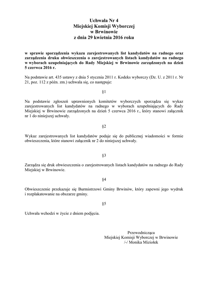 Uchwała Nr 4 Miejskiej Komisji Wyborczej w Brwinowie z dnia 29 kwietnia 2016 roku w sprawie sporządzenia wykazu zarejestrowanych list kandydatów na radnego oraz zarządzenia druku obwieszczenia o zarejestrowanych listach kandydatów na radnego w wyborach uzupełniających do Rady Miejskiej w Brwinowie zarządzonych na dzień 5 czerwca 2016 r. Na podstawie art. 435 ustawy z dnia 5 stycznia 2011 r. Kodeks wyborczy (Dz. U. z 2011 r. Nr 21, poz. 112 z późn. zm.) uchwala się, co następuje: §1 Na podstawie zgłoszeń uprawnionych komitetów wyborczych sporządza się wykaz zarejestrowanych list kandydatów na radnego w wyborach uzupełniających do Rady Miejskiej w Brwinowie zarządzonych na dzień 5 czerwca 2016 r., który stanowi załącznik nr 1 do niniejszej uchwały. §2 Wykaz zarejestrowanych list kandydatów podaje się do publicznej wiadomości w formie obwieszczenia, które stanowi załącznik nr 2 do niniejszej uchwały. §3 Zarządza się druk obwieszczenia o zarejestrowanych listach kandydatów na radnego do Rady Miejskiej w Brwinowie. §4 Obwieszczenie przekazuje się Burmistrzowi Gminy Brwinów, który zapewni jego wydruk i rozplakatowanie na obszarze gminy. §5 Uchwała wchodzi w życie z dniem podjęcia. Przewodnicząca Miejskiej Komisji Wyborczej w Brwinowie /-/ Monika Miziołek Załącznik nr 1 do uchwały nr 4/2016 Miejskiej Komisji Wyborczej w Brwinowie z dnia 29 kwietnia 2016 r. Zarejestrowane listy kandydatów na radnego w wyborach uzupełniających do Rady Miejskiej w Brwinowie zarządzonych na dzień 5 czerwca 2016 r. Okręg nr IX 1. NASTAROWICZ Rafał, lat 31, zam. Brwinów Zgłoszony przez KWW ARKADIUSZA KOSIŃSKIEGO „DOBRO WSPÓLNE” – lista nr 1 2. KORALEWSKA Barbara, lat 63, zam. Brwinów Zgłoszona przez KWW BARBARY KORALEWSKIEJ NASZ BRWINÓW – lista nr 2 3. MATUSZEWSKI Waldemar, lat 62, zam. Brwinów Zgłoszony przez KWW WALDEMARA MATUSZEWSKIEGO – lista nr 3 4. TYNIEC Danuta Maria, lat 63, zam. Milęcin Zgłoszona przez KWW DOBREJ ZMIANY – lista nr 4 Załącznik nr 2 do uchwały nr 4/2016 Miejskiej Komisji Wyborczej w Brwinowie z dnia 29 kwietnia 2016 r. OBWIESZCZENIE Miejskiej Komisji Wyborczej z dnia 29 kwietnia 2016 r. o zarejestrowanych listach kandydatów na radnego w wyborach uzupełniających do Rady Miejskiej w Brwinowie zarządzonych na dzień 5 czerwca 2016 r. Na podstawie art. 435 §1 ustawy z dnia 5 stycznia 2011 r. Kodeks wyborczy (Dz. U. z 2011 r. Nr 21, poz. 112 z późn. zm.) Miejska Komisja Wyborcza w Brwinowie podaje do wiadomości informację o zarejestrowanych listach kandydatów na radnego: Okręg nr IX 1. NASTAROWICZ Rafał, lat 31, zam. Brwinów Zgłoszony przez KWW ARKADIUSZA KOSIŃSKIEGO „DOBRO WSPÓLNE” – lista nr 1 2. KORALEWSKA Barbara, lat 63, zam. Brwinów Zgłoszona przez KWW BARBARY KORALEWSKIEJ NASZ BRWINÓW – lista nr 2 3. MATUSZEWSKI Waldemar, lat 62, zam. Brwinów Zgłoszony przez KWW WALDEMARA MATUSZEWSKIEGO – lista nr 3 4. TYNIEC Danuta Maria, lat 63, zam. Milęcin Zgłoszona przez KWW DOBREJ ZMIANY – lista nr 4 Przewodnicząca Miejskiej Komisji Wyborczej w Brwinowie /-/ Monika Miziołek