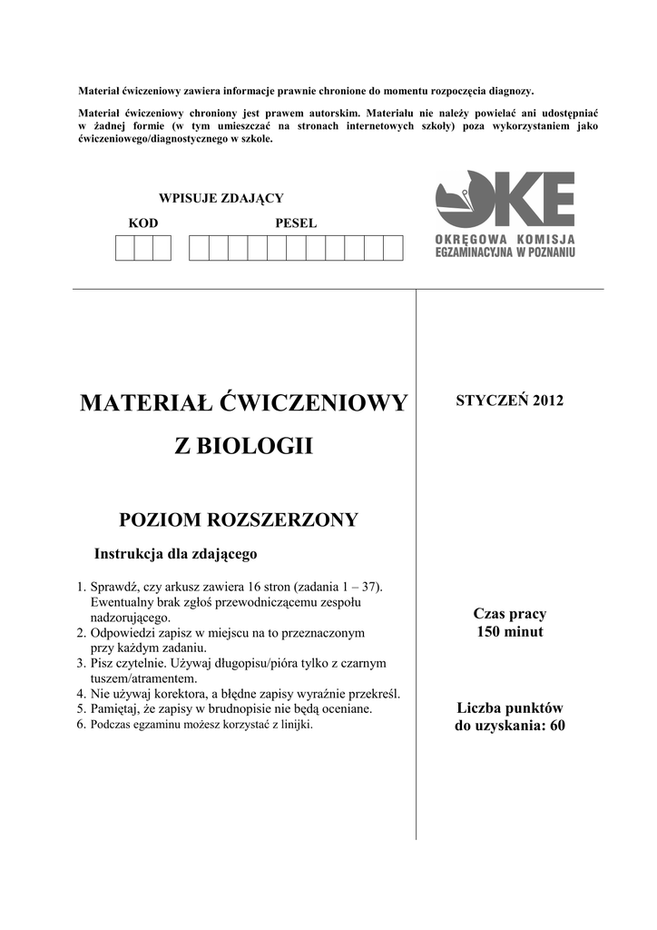 Materiał ćwiczeniowy zawiera informacje prawnie chronione do momentu rozpoczęcia diagnozy. Materiał ćwiczeniowy chroniony jest prawem autorskim. Materiału nie należy powielać ani udostępniać w żadnej formie (w tym umieszczać na stronach internetowych szkoły) poza wykorzystaniem jako ćwiczeniowego/diagnostycznego w szkole. WPISUJE ZDAJĄCY KOD PESEL MATERIAŁ ĆWICZENIOWY STYCZEŃ 2012 Z BIOLOGII POZIOM ROZSZERZONY Instrukcja dla zdającego 1. Sprawdź, czy arkusz zawiera 16 stron (zadania 1 – 37). Ewentualny brak zgłoś przewodniczącemu zespołu nadzorującego. 2. Odpowiedzi zapisz w miejscu na to przeznaczonym przy każdym zadaniu. 3. Pisz czytelnie. Używaj długopisu/pióra tylko z czarnym tuszem/atramentem. 4. Nie używaj korektora, a błędne zapisy wyraźnie przekreśl. 5. Pamiętaj, że zapisy w brudnopisie nie będą oceniane. 6. Podczas egzaminu możesz korzystać z linijki. Czas pracy 150 minut Liczba punktów do uzyskania: 60 Okręgowa Komisja Egzaminacyjna w Poznaniu Materiał ćwiczeniowy z biologii 2012 Poziom rozszerzony 2 Zadanie 1. (1 pkt) Na schemacie przedstawiono układ pokarmowy człowieka. Przyporządkuj wszystkie wymienione procesy (oznaczone cyframi 1-5) do odpowiednich odcinków układu pokarmowego, oznaczonych na schemacie literami A, B i C. 1. 2. 3. 4. 5. rozkład sacharozy emulgacja tłuszczów odkażanie treści pokarmowej rozkład białek pod wpływem pepsyny wchłanianie składników pokarmowych przez kosmki jelitowe A - .......... B - ............ C - .............. Zadanie 2. (2 pkt) Na schemacie przedstawiono budowę ciałka nerkowego ssaków. a) Podaj nazwę struktury oznaczonej literą X. ……...………………………….......……… b) Wyjaśnij znaczenie różnych wielkości średnicy tętniczki doprowadzającej i odprowadzającej dla procesów zachodzących w ciałku nerkowym. ………………………………………………………………...………………………………… ………………………………………………………………...………………………………… ………………………………………………………………...………………………………… ………………………………………………………………...………………………………… Okręgowa Komisja Egzaminacyjna w Poznaniu Materiał ćwiczeniowy z biologii 2012 Poziom rozszerzony 3 Zadanie 3. (1 pkt) Na pracę układu wydalniczego wpływa między innymi wazopresyna (ADH), wydzielana przez przysadkę. Hormon ten stymuluje zwrotne wchłanianie wody w kanalikach nefronu, a jego wydzielanie jest uwarunkowane różnymi czynnikami. W sytuacji, gdy ciśnienie osmotyczne krwi spada (np. po spożyciu dużej ilości napojów), produkcja ADH zostaje ograniczona, co skutkuje zmniejszoną resorpcją wody z kanalików nerkowych do krwi, w związku z czym wydalane są duże ilości moczu. Wyjaśnij, uwzględniając działanie ADH, dlaczego po intensywnym treningu, np. na siłowni, wydalane są małe ilości moczu. ………………………………………………………………...………………………………… ………………………………………………………………...………………………………… ………………………………………………………………...………………………………… Zadanie 4. (1 pkt) Wielu ludzi zmienia tradycyjne zasady żywienia i realizuje diety alternatywne, np. wegetarianizm. Dieta ta polega na ograniczeniu pożywienia do produktów pochodzenia roślinnego. Z punktu widzenia współczesnej wiedzy o odżywianiu wegetarianizm może być zarówno korzystny, jak i niekorzystny dla zdrowia człowieka. Podaj jedną wadę diety wegetariańskiej i przykład jej możliwych negatywnych skutków dla zdrowia człowieka. ....................................................................................................................................................... ....................................................................................................................................................... ....................................................................................................................................................... Zadanie 5. (2 pkt) Na schemacie przedstawiono krzywe dysocjacji tlenowej dla hemoglobiny i mioglobiny. a) Określ na podstawie wykresu, który barwnik łatwiej przyłącza tlen. Odpowiedź uzasadnij. ....................................................................................................................................................... ....................................................................................................................................................... b) Wyjaśnij, jakie znaczenie dla pracy mięśni ma zależność przedstawiona na schemacie. ....................................................................................................................................................... ....................................................................................................................................................... 4 Okręgowa Komisja Egzaminacyjna w Poznaniu Materiał ćwiczeniowy z biologii 2012 Poziom rozszerzony Zadanie 6. (2 pkt) Odruch to automatyczna, mimowolna reakcja organizmu na określony bodziec. Przykładem odruchu jest zmiana średnicy źrenicy oka wywołana zmianą natężenia światła. a) Określ, czy odruch źreniczny jest odruchem warunkowym, czy bezwarunkowym. Uzasadnij odpowiedź. ....................................................................................................................................................... ....................................................................................................................................................... b) Wyjaśnij znaczenie odruchu źrenicznego dla prawidłowego funkcjonowani