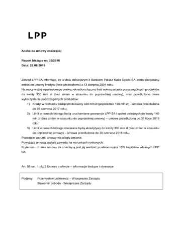 Aneks do umowy znaczącej Raport bieżący nr: 35/2016 Data: 22.06.2016 Zarząd LPP SA informuje, że w dniu dzisiejszym z Bankiem Polska Kasa Opieki SA został podpisany aneks do umowy kredytu (linia wielocelowa) z 13 sierpnia 2004 roku. Na mocy wyżej wymienionego aneksu określono łączny limit wykorzystania poszczególnych produktów do kwoty 330 mln zł (bez zmian w stosunku do poprzedniej umowy), oraz przedłużono okres wykorzystania poszczególnych produktów: 1) Kredyt w rachunku bieżącym do kwoty 330 mln zł (poprzednio 190 mln zł) – umowa przedłużona do 30 czerwca 2017 roku; 2) Limit w ramach którego będą uruchamiane gwarancje LPP SA i spółek zależnych do kwoty 140 mln zł (bez zmian w stosunku do poprzedniej umowy) – umowa przedłużona do 31 lipca 2019 roku; 3) Limit w ramach którego otwierane będą akredytywy do kwoty 330 mln zł (bez zmian w stosunku do poprzedniej umowy) – umowa przedłużona do 30 czerwca 2018 roku. Pozostałe warunki umowy nie uległy zmianie. Powyższa umowa została zawarta na warunkach rynkowych. Kryterium uznania umowy za znaczącą jest jej wartość przekraczająca 10% kapitałów własnych LPP SA. Art. 56 ust. 1 pkt 2 Ustawy o ofercie – informacje bieżące i okresowe Podpisy: Przemysław Lutkiewicz – Wiceprezes Zarządu Sławomir Łoboda - Wiceprezes Zarządu