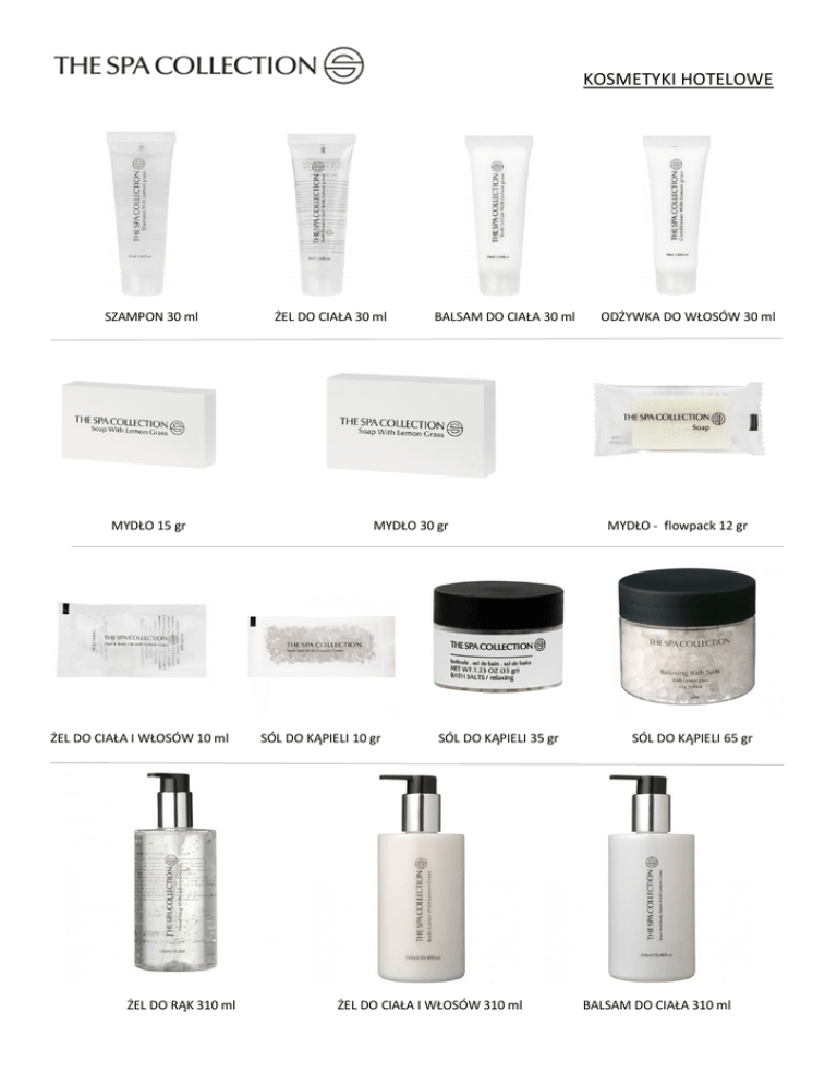 KOSMETYKI HOTELOWE SZAMPON 30 ml MYDŁO 15 gr ŻEL DO CIAŁA I WŁOSÓW 10 ml ŻEL DO RĄK 310 ml ŻEL DO CIAŁA 30 ml BALSAM DO CIAŁA 30 ml MYDŁO 30 gr SÓL DO KĄPIELI 10 gr SÓL DO KĄPIELI 35 gr ŻEL DO CIAŁA I WŁOSÓW 310 ml ODŻYWKA DO WŁOSÓW 30 ml MYDŁO - flowpack 12 gr SÓL DO KĄPIELI 65 gr BALSAM DO CIAŁA 310 ml AKCESORIA HOTELOWE CZYŚCIK DO BUTÓW PILNICZEK CZEPEK KĄPIELOWY – pudełko ZESTAW KOSMETYCZNY GRZEBIEŃ CZEPEK KĄPIELOWY – saszetka IGIELNIK ŁYŻKA DO BUTÓW ZATYCZKI DO USZU – saszetka AKCESORIA HOTELOWE ZESTAW DO MYCIA ZĘBÓW CZYŚCIK – RĘKAWICA DO UBRAŃ UCHWYT METALOWY POJEDYNCZY 310 ml ZESTAW DO GOLENIA RĘKAWICA DO MASAŻU LUSTERKO PODRĘCZNE MYJKA DO CIAŁA UCHWYT METALOWY PODWÓJNY 2 X 310 ml