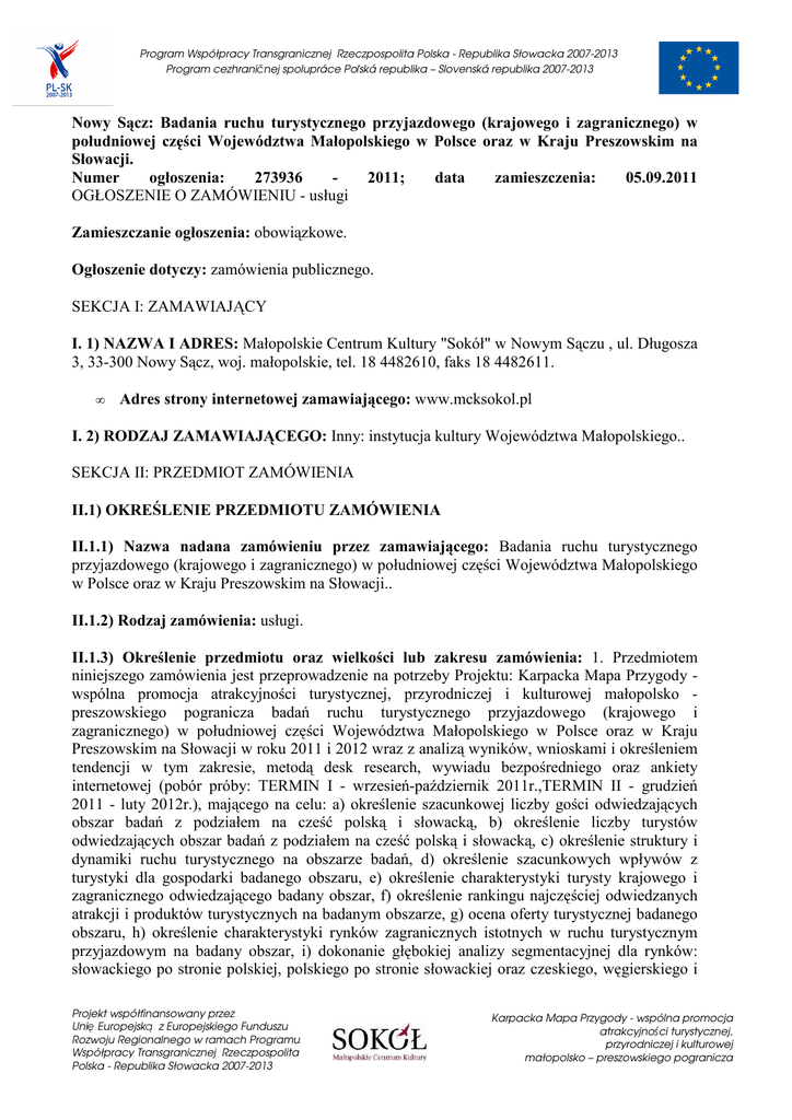 Program Współpracy Transgranicznej Rzeczpospolita Polska - Republika Słowacka 2007-2013 Program cezhraničnej spolupráce Poľská republika – Slovenská republika 2007-2013 Nowy Sącz: Badania ruchu turystycznego przyjazdowego (krajowego i zagranicznego) w południowej części Województwa Małopolskiego w Polsce oraz w Kraju Preszowskim na Słowacji. Numer ogłoszenia: 273936 2011; data zamieszczenia: 05.09.2011 OGŁOSZENIE O ZAMÓWIENIU - usługi Zamieszczanie ogłoszenia: obowiązkowe. Ogłoszenie dotyczy: zamówienia publicznego. SEKCJA I: ZAMAWIAJĄCY I. 1) NAZWA I ADRES: Małopolskie Centrum Kultury "Sokół" w Nowym Sączu , ul. Długosza 3, 33-300 Nowy Sącz, woj. małopolskie, tel. 18 4482610, faks 18 4482611. • Adres strony internetowej zamawiającego: www.mcksokol.pl I. 2) RODZAJ ZAMAWIAJĄCEGO: Inny: instytucja kultury Województwa Małopolskiego.. SEKCJA II: PRZEDMIOT ZAMÓWIENIA II.1) OKREŚLENIE PRZEDMIOTU ZAMÓWIENIA II.1.1) Nazwa nadana zamówieniu przez zamawiającego: Badania ruchu turystycznego przyjazdowego (krajowego i zagranicznego) w południowej części Województwa Małopolskiego w Polsce oraz w Kraju Preszowskim na Słowacji.. II.1.2) Rodzaj zamówienia: usługi. II.1.3) Określenie przedmiotu oraz wielkości lub zakresu zamówienia: 1. Przedmiotem niniejszego zamówienia jest przeprowadzenie na potrzeby Projektu: Karpacka Mapa Przygody wspólna promocja atrakcyjności turystycznej, przyrodniczej i kulturowej małopolsko preszowskiego pogranicza badań ruchu turystycznego przyjazdowego (krajowego i zagranicznego) w południowej części Województwa Małopolskiego w Polsce oraz w Kraju Preszowskim na Słowacji w roku 2011 i 2012 wraz z analizą wyników, wnioskami i określeniem tendencji w tym zakresie, metodą desk research, wywiadu bezpośredniego oraz ankiety internetowej (pobór próby: TERMIN I - wrzesień-październik 2011r.,TERMIN II - grudzień 2011 - luty 2012r.), mającego na celu: a) określenie szacunkowej liczby gości odwiedzających obszar badań z podziałem na cześć polską i słowacką, b) określenie liczby turystów odwiedzających obszar badań z podziałem na cześć polską i słowacką, c) określenie struktury i dynamiki ruchu turystycznego na obszarze badań, d) określenie szacunkowych wpływów z turystyki dla gospodarki badanego obszaru, e) określenie charakterystyki turysty krajowego i zagranicznego odwiedzającego badany obszar, f) określenie rankingu najczęściej odwiedzanych atrakcji i produktów turystycznych na badanym obszarze, g) ocena oferty turystycznej badanego obszaru, h) określenie charakterystyki rynków zagranicznych istotnych w ruchu turystycznym przyjazdowym na badany obszar, i) dokonanie głębokiej analizy segmentacyjnej dla rynków: słowackiego po stronie polskiej, polskiego po stronie słowackiej oraz czeskiego, węgierskiego i Projekt współfinansowany przez Unię Europejską z Europejskiego Funduszu Rozwoju Regionalnego w ramach Programu Współpracy Transgranicznej Rzeczpospolita Polska - Republika Słowacka 2007-2013 Karpacka Mapa Przygody - wspólna promocja atrakcyjności turystycznej, przyrodniczej i kulturowej małopolsko – preszowskiego pogranicza Program Współpracy Transgranicznej Rzeczpospolita Polska - Republika Słowacka 2007-2013 Program cezhraničnej spolupráce Poľská republika – Slovenská republika 2007-2013 ukraińskiego dla całego obszaru. 2. W ramach realizacji przedmiotu zamówienia Wykonawca zobowiązany jest również do: a) przygotowania raportu końcowego z badań (6 egzemplarzy w formie drukowanej, oprawionej i w formie zapisu komputerowego na płycie CD/DVD w formacie MS Word i PDF) i przekazania autorskich praw majątkowych do wykonanych raportów końcowych, b) przygotowania dwóch sprawozdań bieżących z badań w języku polskim i słowackim (6 egzemplarzy w formie drukowanej, oprawionej i w formie zapisu komputerowego na płycie CD/DVD w formacie MS Word i PDF) i przekazania autorskich praw majątkowych do wykonanych sprawozdań bieżących, c) przygotowania Zamawiającemu prezentacji w formacie PowerPoint, prezentującej założenia, wyniki i wnioski z badań w polskiej i słowackiej wersji językowej i przekazania autorskich praw majątkowych do wykonanych prezentacji, d) przygotowania Zamawiającemu skrótu z raportu (3 strony formatu A4, w wersji elektronicznej, w formacie MS Word, w polskiej i słowackiej wersji językowej), prezentującego założenia, wyniki i wnioski z badań i przekazania autorskich praw majątkowych do wykonanych skrótów raportu, e) zaprezentowania badań, omówienia ich treści, skomentowania wyników podczas spotkań grup eksperckich pracujących w projekcie oraz podczas publicznych spotkań i dyskusji zorganizowanych przez Zamawiającego w związku z wykonanymi badaniami na potrzeby realizacji Projektu, na każdorazowy wniosek Zamawiającego, w terminie do 6 miesięcy od daty realizacji przedmiotu zamówienia. 3. Szczegółowy opis przedmiotowego badania stanowi Część III SIWZ - Opis przedmiotu zamówienia. 4. Warunki wykonania zamówienia zawarte są we wzorze umowy stanowiącym Część II SIWZ - Projekt Umowy.. II.1.4) Czy przewiduje się udzielenie zamówień uzupełniających: nie. II.1.5) Wspólny Słownik Zamówień (CPV): 79.31.00.00-0. II.1.6) Czy dopuszcza się złożenie oferty częściowej: nie. II.1.7) Czy dopuszcza się złożenie oferty wariantowej: nie. II.2) CZAS TRWANIA ZAMÓWIENIA LUB TERMIN WYKONANIA: Zakończenie: 30.03.2012. SEKCJA III: INFORMACJE O CHARAKTERZE PRAWNYM, EKONOMICZNYM, FINANSOWYM I TECHNICZNYM III.1) WADIUM Informacja na temat wadium: Zamawiający nie wymaga wniesienia wadium III.2) ZALICZKI • Czy przewiduje się udzielenie zaliczek na poczet wykonania zamówienia: nie III.3) WARUNKI UDZIAŁU W POSTĘPOWANIU ORAZ DOKONYWANIA OCENY SPEŁNIANIA TYCH WARUNKÓW Projekt współfinansowany przez Unię Europejską z Europejskiego Funduszu Rozwoju Regionalnego w ramach Programu Współp
