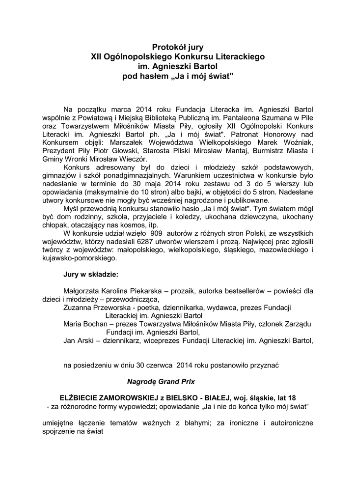 Protokół jury XII Ogólnopolskiego Konkursu Literackiego im. Agnieszki Bartol pod hasłem „Ja i mój świat" Na początku marca 2014 roku Fundacja Literacka im. Agnieszki Bartol wspólnie z Powiatową i Miejską Biblioteką Publiczną im. Pantaleona Szumana w Pile oraz Towarzystwem Miłośników Miasta Piły, ogłosiły XII Ogólnopolski Konkurs Literacki im. Agnieszki Bartol ph. „Ja i mój świat". Patronat Honorowy nad Konkursem objęli: Marszałek Województwa Wielkopolskiego Marek Woźniak, Prezydent Piły Piotr Głowski, Starosta Pilski Mirosław Mantaj, Burmistrz Miasta i Gminy Wronki Mirosław Wieczór. Konkurs adresowany był do dzieci i młodzieży szkół podstawowych, gimnazjów i szkół ponadgimnazjalnych. Warunkiem uczestnictwa w konkursie było nadesłanie w terminie do 30 maja 2014 roku zestawu od 3 do 5 wierszy lub opowiadania (maksymalnie do 10 stron) albo bajki, w objętości do 5 stron. Nadesłane utwory konkursowe nie mogły być wcześniej nagrodzone i publikowane. Myśl przewodnią konkursu stanowiło hasło „Ja i mój świat". Tym światem mógł być dom rodzinny, szkoła, przyjaciele i koledzy, ukochana dziewczyna, ukochany chłopak, otaczający nas kosmos, itp. W konkursie udział wzięło 909 autorów z różnych stron Polski, ze wszystkich województw, którzy nadesłali 6287 utworów wierszem i prozą. Najwięcej prac zgłosili twórcy z województw: małopolskiego, wielkopolskiego, śląskiego, mazowieckiego i kujawsko-pomorskiego. Jury w składzie: Małgorzata Karolina Piekarska – prozaik, autorka bestsellerów – powieści dla dzieci i młodzieży – przewodnicząca, Zuzanna Przeworska - poetka, dziennikarka, wydawca, prezes Fundacji Literackiej im. Agnieszki Bartol Maria Bochan – prezes Towarzystwa Miłośników Miasta Piły, członek Zarządu Fundacji im. Agnieszki Bartol, Jan Arski – dziennikarz, wiceprezes Fundacji Literackiej im. Agnieszki Bartol, na posiedzeniu w dniu 30 czerwca 2014 roku postanowiło przyznać Nagrodę Grand Prix ELŻBIECIE ZAMOROWSKIEJ z BIELSKO - BIAŁEJ, woj. śląskie, lat 18 - za różnorodne formy wypowiedzi; opowiadanie „Ja i nie do końca tylko mój świat” umiejętne łączenie tematów ważnych z błahymi; za ironiczne i autoironiczne spojrzenie na świat W kategorii autorów do 15 lat I nagrodę otrzymuje Antonina Matczak z Gdańska, woj. pomorskie, lat 13 - za opowieść psychologiczną „(bez tytułu) …niestety, nie mogę jej przyjąć” trafną analizę tego, czym są i skąd się biorą uczucia lub ich brak; za wciągającą narrację, ciekawy pomysł i jego realizację II nagrodę Marcin Rzęsista z Myślenic, woj. małopolskie, lat 12 - za bajkę „ O sierotce Dobrotce, która miłości szukała” przepiękna bajka z zagadkami III nagrodę Laura Chuchla z Piły, woj. wielkopolskie, lat 15 - za cykl wierszy za niezwykłą wrażliwość poezji intelektualnej, poszukującej własne „ego” Wyróżnienia Julia Adamus z Łodzi, woj. łódzkie, lat 14 - za cykl wierszy - za umiejętne połączenie nauki z poezją Julia Perzyńska - Wydrych, Szczecin, woj. zachodniopomorskie, lat 12 - za prozę „Mój świat” ciekawe wykorzystanie bohaterów znanych z innych książek W kategorii autorów powyżej 15 lat I nagrodę otrzymuje Jacek Cholewiński z Krzyżanowa, pow. płocki, woj. mazowieckie, lat 18 - za cykl wierszy - za niezwykłą, krótką w formie poezję; dyscyplinę słowa, wyciszoną refleksję i wnikliwą obserwację otaczającego świata II nagrodę Joanna Nowak z Płocka, woj. mazowieckie, lat 17 - za cykl wierszy - za trafne i zaskakujące puenty III nagrodę Adam Cieślewicz z Piły, woj. wielkopolskie, lat 17 - za wiersze „o opuszczonym mieście” - za koncepcję wierszy i konsekwencję w ich realizacji Wyróżnienia Zuzanna Bulińska z Bydgoszczy, woj. kujawsko-pomorskie, lat 18 - za wiersze - za zwięzłość myśli, piękny język, zauważanie „drobiazgów” w życiu codziennym, często pomijanych, a przecież istotnych Antonina Kudasik z Zębu k/Zakopanego, woj. małopolskie, lat 16 - za wiersze - za ciekawą obserwację świata opisanego w niebanalny sposób Nagrody specjalne Nagrodę Burmistrza Miasta i Gminy Wronki Mirosława Wieczora - za indywidualność twórczą: Elżbieta Zamorowska z Bielsko - Białej, woj. śląskie, lat 18 Nagrodę im. Danuty Bartol – mamy patronki konkursu, ufundowaną przez Leszka Bartola z Wronek, ojca Agnieszki: Dawid Gabryś z Ochab Wielkich, gmina Skoczów, pow. Cieszyn, woj. śląskie, lat 10 - za niezwykły talent literacki opowiadanie „Tęcza”, ciekawe wykorzystanie wyobraźni i marzeń Nagrodę im. Stanisława Sitka - drukarza z Czarnkowa, współzałożyciela Fundacji Literackiej im. Agnieszki Bartol, ufundowaną przez jego żonę Teresę Sitek: Agata Kuliberda z Wągrowca, woj. wielkopolskie, lat 15 - za opowieść „Pozostawiona w cieniu” przepiękną relację o rodzinie i miłości do muzyki Nagrodę „Pióro Czarnego Kruka”, ufundowaną przez tygodnik „Wroniecki Bazar” Grażyny Kaźmierczak: Mikołaj Koza z Wronek, woj. wielkopolskie, lat 13 - za prozę „Ja i mój świat” - za pokazanie rówieśnikom kultury włoskiego odrodzenia Piła, dnia 30 czerwca 2014 roku Podpisy Jury: Małgorzata Karolina Piekarska – przewodnicząca Maria Bochan Zuzanna Przeworska Jan Arski