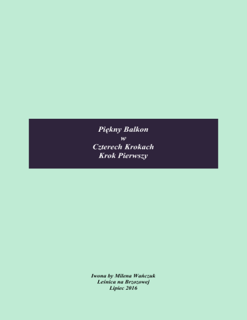 Piękny Balkon w Czterech Krokach Krok Pierwszy Iwona by Milena Wańczuk Leśnica na Brzozowej Lipiec 2016 Kilka słów na wstępie. Balkon jest przedłużeniem mieszkania i jednocześnie miejscem, gdzie zewnętrzne otoczenie wchodzi do naszego domu. Jest miejscem, które jednocześnie łączy nasz dom z otoczeniem i jednocześnie oddziela od negatywnego wpływu środowiska. W całym moim życiu miałam do czynienia z różnymi balkonami. Tymi malutkimi wielkości szafki na buty (no dobrze ciut większymi) tymi standardowymi w bloku oraz takimi co miały wymiary tarasu. Były takie zagracone go granic możliwości, a inne stały puste, ale ani jedne, ani drugie nie zachęcały do wypoczynku. Teraz mieszkam na wsi i nie posiadam balkonu. Brakuje mi tego miejsca, które jest wpisane w krajobraz miejskich osiedli. Ciągle wracam myślami do tych balkonów, które zaplanowałam i wykonałam. W tej chcę się podzielić moim doświadczeniem jakie zdobyłam na przestrzeni kilku lat i pokazać, że balkon to bardzo istotny element mieszkania. Nawet malutki balkon może być miejscem przyjemnym. Pomysł Zanim zaczniesz urządzać balkon musisz mieć na niego plan, pomysł do czego będzie Ci służył. Zakładam, że nie będzie to forma składziku, gdzie będą lądowały niepotrzebne „graty”. Poza funkcją praktyczną ważniejsza jest jego estetyczna forma. Ważne dla Ciebie funkcje balkonu. Miło usiąść, wypić poranną kawę, po południu poczytać książkę i patrzeć jak dzieci układają klocki. A może zaprosić koleżankę na kawałek domowego ciasta? Przyjemnie jest cieszyć się własnymi kwiatami, a może pokusisz się o własne warzywa? Przemyśl co chcesz mieć na balkonie: miejsce wypoczynku, miejsce zabaw dla dzieci, rabata kwiatowa, albo kwiaty doniczkowe, rabata warzywna, albo warzywa i zioła w doniczkach, miejsce na suszarkę miejsce na grilla elektrycznego? TWOJE POMYSŁY NA BALKON. 1 …………………………………………………………………. 2 …………………………………………………………………. 3 …………………………………………………………………. 4 …………………………………………………………………. 5 …………………………………………………………………. 6 ………………………………………………………………….. Wyjdź na balkon. Rozejrzyj się w koło? Co widzisz? Czy mieszkasz w ustronnym miejscu? A może przy głównej ulicy? Być może jest to spokojne osiedle, ale sąsiedzi mieszkają tak blisko, że mogą zobaczyć jaką kawę pijesz? To wszystko ma znaczenie. Jeśli Twój balkon znajduje się „pod ostrzałem” wzroku ciekawskich sąsiadów, albo w pobliżu znajduje się ruchliwy deptak, to trzeba użyć wszelkich dostępnych metod, żeby „odgrodzić” Twój azyl od świata zewnętrznego. Kolejną rzeczą, którą musisz sprawdzić jakie jest usytuowanie Twojego balkonu względem słońca. Najczęściej są to balkony południowe to znaczy takie gdzie najwięcej światła jest w południe. Nie znaczy, że to najlepsze rozwiązanie. Latem w czasie upałów może to być uciążliwe. Zdarzają się balkony od strony wschodniej, zachodniej, a najrzadziej od północnej. Każdy można urządzić by stał się Twoim azylem. Mój balkon jest: Skoro już jesteś na balkonie przyjrzyj się mu uważnie. Jeśli jest pusty nieumeblowany to możesz zakończyć na tym etapie. Jeśli jednak masz sporo sprzętów, mebli i różnych przyda się w tym momencie powinnaś przemyśleć do czego dane rzeczy są Ci potrzebne: Analiza sytuacji Potrzebne: Może się przydać: Zbędne: 1 …………………… 1 …………………… 1 …………………… 2 …………………… 2 …………………… 2 …………………… 3 …………………… 3 …………………… 3 …………………… 4 …………………… 4 …………………… 4 …………………… 5 …………………… 5 …………………… 5 …………………… 6 …………………… 6 …………………… 6 …………………… Notatki Notatki Notatki ……………………… ……………………… ……………………… ……………………… ……………………… ……………………… ……………………… ……………………… ……………………… ……………………… …………………........ ……………………… W szybkim skrócie: powinnaś przeanalizować otoczenie i usytuowanie balkonu, jakie funkcje będzie pełnił oraz co chcesz mieć na balkonie oraz czego już nie chcesz na nim mieć? Kolejny krok do Pięknego balkony w następnej części e-booka.
