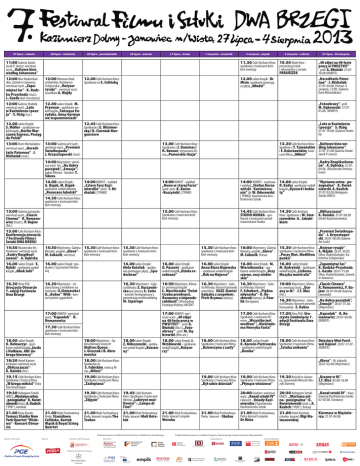 27 lipca - sobota 28 lipca - niedziela 29 lipca - poniedziałek 30 lipca - wtorek 31 lipca - środa 1 sierpnia - czwartek 11:00 Galeria Sztuki skie, Zamek w Janowcu: wernisaż wyst. „Zapamiętać las” - K. Rudzka-Przychoda (mal.), L. Gazda (kol. bursztynu) 12:00 Galeria Stodoła: wernisaż wyst. „Lato w Kazimierzu i poezja” - S. Ożóg (rys.) 12.00 salon Empik: S. Möller - spotkanie wokół książki „Berlin-Warszawa Express. Pociąg do Polski” 13:00 Dom Michalaków: wernisaż wyst. „Hereditatis Paternae” - J. Michalak (mal.) spotkanie z twórcami krótkich metraży 12:00 Muzeum Nad- wiślańskie, Kamienica Celejowska: „Reżyser rysuje” - wernisaż wyst. rysunków A. Wajdy 12.00 Cafe Kocham Kino: Spotkanie ze S. Celińską PARAUSZEK 03.08. (KOKPiT) „Lato w Kazimierzu i poezja” - S. Ożóg: 27.07-10.08. (Galeria Stodoła) 13.00 Cafe Kocham Kino: Spotkanie z J. Dammas i H. Renner, reżyserami filmu „Pomorskie iluzje”. 13.30 Cafe Kocham Kino: Spotknie z T. Tymańskim i F. Dzierżawskim, twórcami filmu „Miłość” 14:00 KOKPiT - wykład „Nowe w starej Farze” (prof. arch. K. Kucza-Kuczyński) | TPMKD 14:00 KOKPiT - wystawa i wykład „Stefan Kurzawiński - Kazimierzanin” (dr W. Odorowski) 15.00 Cafe Kocham Kino: 14.45 Cafe Kocham Kino: 14.30 Cafe Kocham „Oblicza jazzu” STUDIO MUNKA - spo- Kino: Spotkanie z W. Sma- K. Rainka: 27.07-04.08 tkanie z twórcami i przedrzowskim i A. Jakubi- (Hotel Kazimierzówka) stawicielami Studia kiem | TPMKD, Kazimierska Konfranternia Sztuki (fot.) 16.30 Mięćmierz - wi- ślany brzeg z widokiem na Janowiec: A.Siemaszko i K. „Bobas” Wilk - koncert pieśni cygańskich 17:00 KOKPiT: wernisaż wyst. “Kapselek” - R. Romanowicz 17.30 Cafe Kocham Kino: spotkanie z twórcami krótkich metraży 18:00 Mięćmierz - Galeria Klimaty: koncert Maîtres Queux – J. Giszczak i B. Abramowicz 14.00 salon Empik: R. Kalisz spotkanie wokół książki „Ryszard i kobiety” 15.30 Cafe Kocham Kino: 15.30 Cafe Kocham Kino: 16:00 Mięćmierz, Galeria 15.30 Cafe Kocham Kino: spotkanie z twórcami krótspotkanie z twórcami krót- Klimaty: projekt „Glova” - spotkanie z twórcami filmu kich metraży kich metraży „Pussy Riot. Modlitwa M. Łukasik, finisaż punka” 16.00 salon Empik: 16.00 salon Empik: 16.00 salon Empik: 16.00 salon Empik: M. 16.00 salon Empik: Mela Koteluk - spotka- D. Passent - spotkanie Anna Klara Majewska Wiernikowska - spoM. Kydryński - spotkanie nie promujące płytę „Spa- wokół książki „Dzieła ro- - spotkanie wokół książki tkanie wokół książki „Oczy wokół książki „Lizbona. dochron” zebrane” „Rok na Majorce” czarne, oczy niebieMuzyka moich ulic” skie” 16.30 Mięćmierz - Gale- 16:30 Mięćmierz, Klima- 16.30 Mięćmierz - Gale- 16.30 Mięćmierz - Gale- 16:00 Mięćmierz, Klimaria Klimaty: koncert piosenki ria Klimaty: koncert ra Klimaty: S. Kurzawiń- ty: promocja książki ty: wernisaż wyst. „Oceska gra utwory E. Satie Ł. Marcińczaka “Świat autorskiej - DGZZ (Daniel F. Schubert, „Piękna any w M.” - J.T. Kłos - koncert fortepianowy z trzeba przekręcić. Gałązka z zespołem), młynarka” - K. Ko(fot.) prezentacją multimedialną Rozmowy o imponde- Piotr Brymas (teksty) złowski (tenor), J. Paw16.30 Mięćmierz - GaleM. Szparago rabiliach” | Wschodnia lik (fortepian) ria Klimaty: koncert piosenki Fundacja Kultury AKCENT francuskiej - E. Kabsa 17:00 KOKPiT: wernisaż wyst. „40 zdjęć na 40-lecie pracy w PWSFTViT” - prof. A. Błoński (fot.) i „Fotoobrazy” - prof. M. Dąbrowski (film art.) 18.00 salon Empik: 18.00 salon Empik: J. Z. Miłoszewski - spotka- Wróblewski - spotkanie nie wokół książki „Bezcen- wokół książki „Reżyseny” rzy” 17.00 Cafe Kocham Kino: 17.00 Kino PGE: UroSpotkanie z twórcami filczyste Zamknięcie 7. mów: „Wszystko jest edycji Festiwalu Dwa możliwe” i „Niewiado- Brzegi ma Henryka Fasta” „Zaślepiona” „Był sobie dzieciak” Spotkanie z twórcami filmu 19.30 Cafe Kocham Kino: 19.45 Cafe Kocham Kino: Spotkanie z twórcami filmów „Labirynt możliwości” i „Campo di Fiori” 21.00 Klub Festiwalowy Perła: Stanisława Celińska, Bartek Wąsik & Royal String Quartet 21.00 Klub Festiwalowy Perła: koncert zespołu The Toobes „Zapamiętać las” K. Rudzka-Przychoda, L. Gazda: 28.07-15.08 (Muz. Nadwiślańskie, Zamek w Janowcu) „Classic Cinema” R. Romanowicz, P. Bajew: 28.07-04.08 (Galeria Leonardo) „Na dobry początek”, „Emocje”: 28.07-31.08. (Mięćmierz) „Kapselek” - R. Romanowicz: 28.07-04.08. (KOKPiT) 28.07-02.08 (Mięćmierz) Spotkanie z twórcami filmu (“POV”), wernisaż (Muz. Nadwiślańskie, Kamienica Celejowska) „Glova” - M. Łukasik: 19.00 Cafe Kocham Kino: 19.00 Cafe Kocham Kino: 19.30 Kościół w Janow- „Zdjęcie” „Reżyser rysuje” A. Wajda: 28.07-30.09. 18.00 Cafe Kocham Kino: 18.00 salon Empik: 18.00 Cafe Kocham Kino: Dziecięcy Mini FestiSpotkanie z twórcami filmu K. Korwin-Piotrowska Spotkanie z tworcami filmu wal Kapsel: 28.07-31.07. „Dziewczyna z szafy” - spotkanie wokół książki „Sztuka znikania” (KOKPiT) „Bomba” S. Fabickim, twórcą filmu „Miłość” 19.00 Cafe Kocham Kino: Spotkanie z Twórcami filmu 27.07-03.08 (Kolegium Sztuki UMCS) Art Loch) Spotkanie ze 19:30 Kolegium Sztuki UMCS: „Wystawa setna - pożegnalna”: K. Kwietniewski (mal.), A. Kushch “Wystawa setna - pożegnalna” - K. Kwietniewski, A. Kushch: „Promień Światłospadu” - J. Krzysztoporski: 28.07-06.08 (Galeria 18.00 Cafe Kocham Kino: Spotkanie z Twórcą filmu „W kregu miłości” Felix Van Groeningen 27.07-31.08 (Galeria Sztuki Jacek P. Jarosz) 04.08. (Miasteczko festiwalowe) Spotkanie z twórcami krótkich metraży 15.00 Cafe Kocham Kino: Konferencja otwarcia 7 Festiwalu Filmu i Sztuki DWA BRZEGI 15:30 Miasteczko fes15:30 Mięćmierz, Galeria 15.30 Cafe Kocham Kino: tiwalowe: wernisaż wyst. Klimaty: projekt „Glova” - spotkani