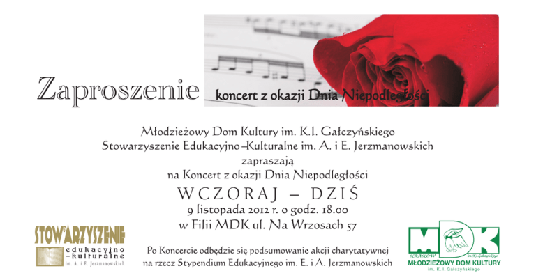 Zaproszenie koncert z okazji okazji Dnia Niepodleg³oci M³odzie¿owy Dom Kultury im. K.I. Ga³czyñskiego Stowarzyszenie Edukacyjno Kulturalne im. A. i E. Jerzmanowskich zapraszaj¹ na Koncert z okazji Dnia Niepodleg³oci WCZORAJ DZI STOWARZYSZENIE edukacyjno kulturalne im. A. i E. Jerzmanowskich 9 listopada 2012 r. o godz. 18.00 w Filii MDK ul. Na Wrzosach 57 Po Koncercie odbêdzie siê podsumowanie akcji charytatywnej na rzecz Stypendium Edukacyjnego im. E. i A. Jerzmanowskich M£ODZIE¯OWY DOM KULTURY im. K. I. Ga³czyñskiego