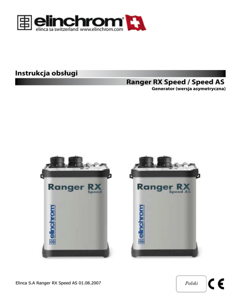 elinca sa switzerland www.elinchrom.com Instrukcja obsługi Ranger RX Speed / Speed AS Generator (wersja asymetryczna) Elinca S.A Ranger RX Speed AS 01.08.2007 Polski Spis treści Wprowadzenie 2 Deklaracja zgodności, usuwanie i recykling, Instrukcje Rady Europy 3 Informacje bezpieczeństwa 4 Przed rozpoczęciem pracy 5 Panel sterowania 6 Funkcje 7-8 Synchronizacja, System bezprzewodowy 9 Wymiana akumulatora 9 Ładowanie akumulatora, bezpieczniki 10 Podłączanie Głowic 10 Głowice Ranger 11 Dane techniczne 12 P.S: Dane techniczne mogą ulegać zmianie. Podano orientacyjne wartości, które mogą się zmieniać w zależności od użytych komponentów. 1 Wprowadzenie Generator Elinchrom Ranger RX Speed S/AS został wyprodukowany przez Elinca S.A. CH -1020 Renens/ Szwajcaria Drogi Fotografie, Dziękujemy za zakup Generatora akumulatorowego Ranger RX Speed S/AS. Wszystkie produkty Elinchrom są produkowane w najnowocześniejszych technologiach. Starannie dobrane komponenty i wnikliwe kontrole na każdym etapie produkcji zapewniają najwyższą jakość produktów. Ufamy, iż zapewni to wieloletnią i niezawodną pracę naszego sprzętu. Wszystkie urządzenia błyskowe dedykowane są dla profesjonalnych fotografów do pracy w studio i plenerze. Jedynie przestrzegając zasad zawartych w niniejszej instrukcji można uniknąć uszkodzeń powodujących utratę gwarancji oraz wydłużyć działanie sprzętu. Generator Ranger RX Speed/AS Jakość światła i wyjątkowa funkcjonalność jest rezultatem długich badań, przestrzegania rygorystycznych zasad oraz doświadczenia firmy ELINCHROM na rynku oświetlenia studyjnego, a także zastosowania najnowszych technologii. Generator Ranger RX Speed S/AS znakomicie wpisuje się w gamę produktów ELINCHROM zachowując tradycyjny wygląd i charakterystyczne dla niej funkcje. Zgodność z przepisami Federalnej Komisji Łączności Urządzenia zostały sprawdzone i uznane za zgodne z wymaganiami dotyczącymi urządzeń cyfrowych klasy B, zgodnie z rozdziałem 15 przepisów FCC i spełniają warunki Kanadyjskich Regulacji dotyczących sprzętu powodującego zakłócenia. Ograniczenia te mają na celu zapewnienie należytej ochrony przed szkodliwymi zakłóceniami w instalacji mieszkaniowej. Niniejsze urządzenie wytwarza, używa i może emitować częstotliwość radiową. Jeśli urządzenie jest zainstalowane i użytkowane niezgodnie z zaleceniami producenta, może emitować szkodliwe zakłócenia sygnałów radiowych. Nie można jednak zagwarantować, że w przypadku konkretnej instalacji zakłócenia nie wystąpią. Jeśli niniejsze urządzenie wywołuje zakłócenia w odbiorze radiowym lub telewizyjnym, które można zidentyfikować poprzez wyłączenie i ponowne włączenie urządzenia, użytkownik powinien podjąć próbę usunięcia zakłóceń w następujący sposób: - Zmianę ustawienie lub położenia anteny odbiorczej - Zwiększyć odległość pomiędzy urządzeniem, a odbiornikiem - Podłączyć urządzenie do gniazdka tak, aby było zasilane z innego obwodu niż odbiornik. - Skonsultować się ze sprzedawcą lub doświadczonym technikiem RTV. ELINCA S.A. nie odpowiada za żadne zakłócenia radiowe i telewizyjne spowodowane nieautoryzowane modyfikacje sprzętu lub w sytuacji gdy użyte zostało okablowanie inne niż to zalecane przez ELINCA S.A.. Za usuwanie zakłóceń spowodowanych nieautoryzowanymi modyfikacjami odpowiada użytkownik. 2 Deklaracja zgodności Niniejsze urządzenie spełnia wymagania przedstawione w rozdziale 15. Przepisów FCC. Używanie urządzenia jest dozwolone pod dwoma warunkami: 1. Urządzenie nie może powodować szkodliwych zakłóceń. 2. Urządzenie musi przyjmować wszelkie zakłócenia, w tym zakłócenia, które mogą powodować jego nieprawidłowe działanie. Nazwa produktu: Nazwa rynkowa: Numer(y) modelu: Nazwa firmy odpowiedzialnej: Telefon: Fax: Profesjonalny Generator Studyjny ELINCHROM Ranger RX Speed S/AS Elinca S.A Av.De Longemalle 11 1020 Renens / Szwajcaria +41 21 637 26 77 +41 21 637 26 81 ELINCA S.A. oświadcza, iż sprzęt noszący powyższą nazwę i numer modelu został sprawdzony i uznany za zgodny z wykonawczymi przepisami FCC. Przedsięwzięte zostaną wszystkie niezbędne kroki aby wszystkie te urządzenia wyprodukowane w przyszłości spełniały wymogi Komisji. Usuwanie oraz recykling Urządzenie to zostało wyprodukowane w największym możliwym stopniu z materiałów, które mogą być poddane recyklingowi lub unieszkodliwione w taki sposób, który nie jest szkodliwy dla środowiska naturalnego. Urządzenie może być odebrane po zużyciu i przeznaczone do recyklingu, pod warunkiem, że jest ono zwrócone w stanie, który jest rezultatem normalnego użytkowania. Wszelkie, nieregenerowane części składowe zostaną usunięte w sposób akceptowalny dla ochrony środowiska. Jeśli masz jakieś pytanie dotyczące usuwania, skontaktuj się z lokalnym biurem lub lokalnym agentem ELINCHROM (sprawdź na naszej stronie internetowej listę wszystkich agentów ELINCHROM). Instrukcje Rady Europy Przedstawiana wersja urządzenia jest zgodna z wymaganiami Dyrektywami ECC 89/336/ECC «Kompatybilność Elektromagnetyczna» i 73/23/ECC «Dyrektywa Niskiego Napięcia». Objaśnienie oznaczeń Znaczenie symboli i czcionek użytych w niniejszej instrukcji są następujące: Należy zwrócić szczególną uwagę na tekst oznaczony tym symbolem. Nieprzeczytanie tego ostrzeżenia zagraża życiu, grozi uszkodzeniem niniejszego urządzenia lub innych sprzętów. Tekst poprzedzony tym symbolem opisuje czynności, które muszą być wykonane w opisywanej kolejności «Znaki cytatu» wskazują nazwę rozdziału lub terminu. 3 Informacje bezpieczeństwa • Nie używać w miejscach zabronionych (np. w szpitalach) • Nie używać w środowisku narażonym na wybuch. Transport powietrzny (jak również każdy inny sposób transportu) Ze względu na przepisy bezpieczeństwa należy: • Wyjąć bezpiecznik 40A z g