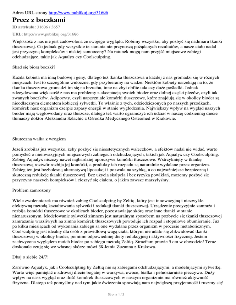 Adres URL strony http://www.publikuj.org/31606 Precz z boczkami ID artykułu: 31606 / 3657 URL: http://www.publikuj.org/31606 Większość z nas nie jest zadowolona ze swojego wyglądu. Robimy wszystko, aby pozbyć się nadmiaru tkanki tłuszczowej. Co jednak gdy wszystkie te starania nie przynoszą pożądanych rezultatów, a nasze ciało nadal jest przyczyną kompleksów i niskiej samooceny? Na ratunek mogą nam przyjść miejscowe zabiegi odchudzające, takie jak Aqualyx czy Coolsculpting. Skąd się biorą boczki? Każda kobieta ma inną budowę i geny, dlatego też tkanka tłuszczowa u każdej z nas gromadzi się w różnych miejscach. Jest to szczególnie widoczne, gdy przybieramy na wadze. Niektóre kobiety narzekają na to, że tkanka tłuszczowa gromadzi im się na brzuchu, inne na zbyt obfite uda czy duże pośladki. Jednak zdecydowana większość z nas ma problemy z akceptacją swoich bioder oraz dolnej części pleców, czyli tak zwanych boczków. Adipocyty, czyli napęczniałe komórki tłuszczowe, które znajdują się w okolicy bioder są nieodłącznym elementem kobiecej sylwetki. To właśnie z tych, odziedziczonych po naszych przodkach, komórek nasz organizm czerpie zapasy energii w stanie wygłodzenia. Największy wpływ na wygląd naszych bioder mają węglowodany oraz tłuszcze, dlatego też warto ograniczyć ich udział w naszej codziennej diecie tłumaczy doktor Aleksandra Szlachic z Ośrodka Medycznego Osteomed w Krakowie. Skuteczna walka z wrogiem Jeżeli zrobiłaś już wszystko, żeby pozbyć się nieestetycznych wałeczków, a efektów nadal nie widać, warto pomyśleć o nieinwazyjnych miejscowych zabiegach odchudzających, takich jak Aqualyx czy Coolsculpting. Zabieg Aqualyx niszczy nawet najbardziej uporczywe komórki tłuszczowe. Wstrzyknięty w tkankę tłuszczową roztwór rozbija jej komórki, a produkty ich rozpadu są naturalnie wydalane przez organizm. Zabieg ten jest bezbolesną alternatywą liposukcji i pozwala na szybką, a co najważniejsze bezpieczną i skuteczną redukcję tkanki tłuszczowej. Bez użycia skalpela i bez ryzyka powikłań, możemy pozbyć się przyczyny naszych kompleksów i cieszyć się ciałem, o jakim zawsze marzyłyśmy. Problem zamrożony Wiele zwolenniczek ma również zabieg Coolsculpting by Zeltiq, który jest innowacyjną i niezwykle efektywną metodą kształtowania sylwetki i redukcji tkanki tłuszczowej. Urządzenie precyzyjnie zamraża i rozbija komórki tłuszczowe w okolicach bioder, pozostawiając skórę oraz inne tkanki w stanie nienaruszonym. Modelowanie sylwetki zimnem jest naturalnym sposobem na pozbycie się tkanki tłuszczowej zamrażanie wrażliwych na zimno komórek tłuszczowych powoduje ich rozpad i stopniowe obumieranie. Już po kilku miesiącach od wykonania zabiegu są one wydalane przez organizm w procesie metabolicznym. Coolsculpting jest idealny dla osób z prawidłową wagą ciała, którym nie udało się zlikwidować tkanki tłuszczowej w okolicy bioder, pomimo odpowiedniej diety redukcyjnej i aktywności fizycznej. Jestem zachwycona wyglądem moich bioder po zabiegu metodą Zeltiq. Straciłam prawie 5 cm w obwodzie! Teraz doskonale czuję się we własnej skórze mówi 30-letnia Zuzanna z Krakowa. Dbaj o siebie 24/7! Zarówno Aqualyx, jak i Coolsculpting by Zeltiq nie są zabiegami odchudzającymi, a modelującymi sylwetkę. Warto więc pamiętać o zdrowej diecie bogatej w warzywa, owoce, białka i pełnoziarniste pieczywo. Duży wpływ na nasz wygląd oraz ilość komórek tłuszczowych w naszym organizmie ma również aktywność fizyczna. Dlatego też pomyślmy nad tym jakie ćwiczenia sprawiają nam największą przyjemność i ruszmy się! Strona 1 / 2 Aktywacja: 19/08/13 12:55, odsłony: 666 Strona 2 / 2