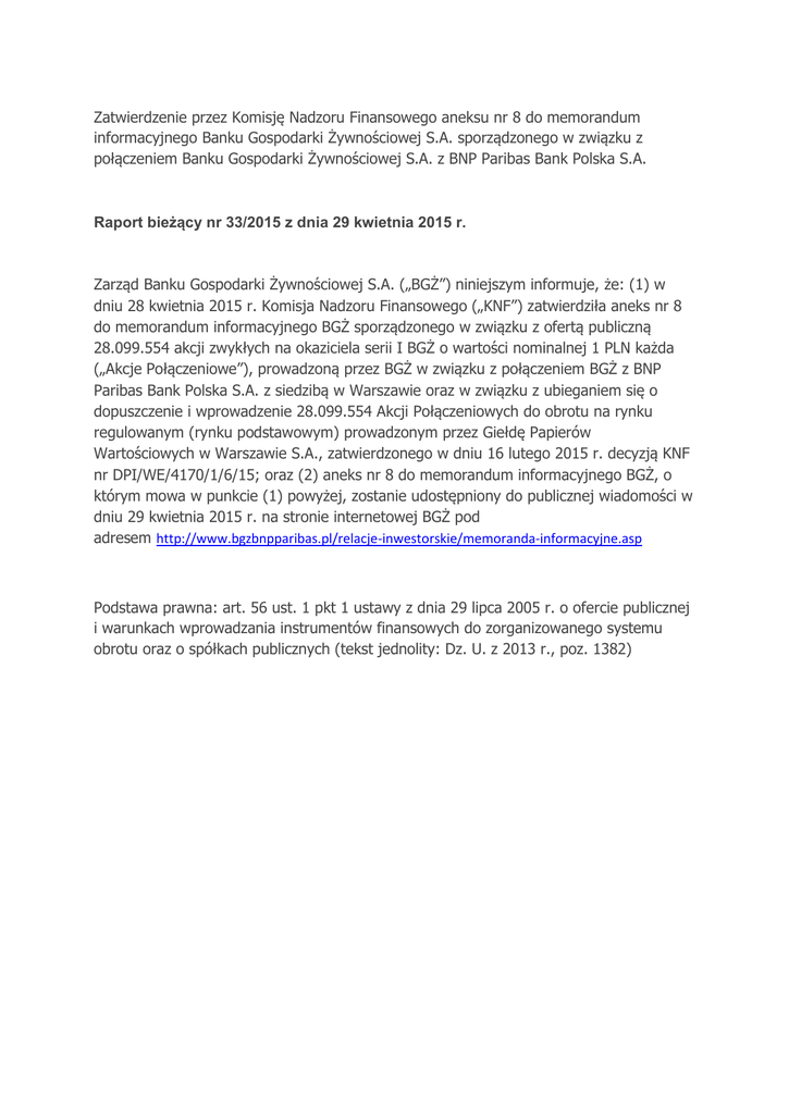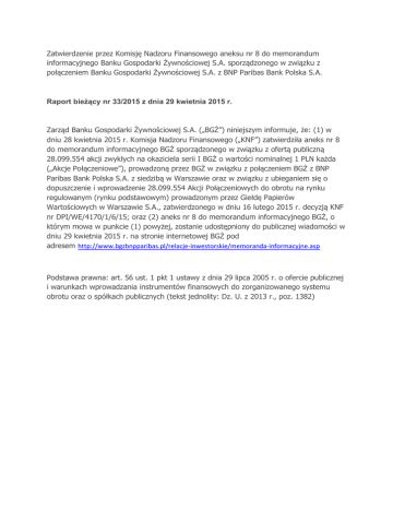 Zatwierdzenie przez Komisję Nadzoru Finansowego aneksu nr 8 do memorandum informacyjnego Banku Gospodarki Żywnościowej S.A. sporządzonego w związku z połączeniem Banku Gospodarki Żywnościowej S.A. z BNP Paribas Bank Polska S.A. Raport bieżący nr 33/2015 z dnia 29 kwietnia 2015 r. Zarząd Banku Gospodarki Żywnościowej S.A. („BGŻ”) niniejszym informuje, że: (1) w dniu 28 kwietnia 2015 r. Komisja Nadzoru Finansowego („KNF”) zatwierdziła aneks nr 8 do memorandum informacyjnego BGŻ sporządzonego w związku z ofertą publiczną 28.099.554 akcji zwykłych na okaziciela serii I BGŻ o wartości nominalnej 1 PLN każda („Akcje Połączeniowe”), prowadzoną przez BGŻ w związku z połączeniem BGŻ z BNP Paribas Bank Polska S.A. z siedzibą w Warszawie oraz w związku z ubieganiem się o dopuszczenie i wprowadzenie 28.099.554 Akcji Połączeniowych do obrotu na rynku regulowanym (rynku podstawowym) prowadzonym przez Giełdę Papierów Wartościowych w Warszawie S.A., zatwierdzonego w dniu 16 lutego 2015 r. decyzją KNF nr DPI/WE/4170/1/6/15; oraz (2) aneks nr 8 do memorandum informacyjnego BGŻ, o którym mowa w punkcie (1) powyżej, zostanie udostępniony do publicznej wiadomości w dniu 29 kwietnia 2015 r. na stronie internetowej BGŻ pod adresem http://www.bgzbnpparibas.pl/relacje-inwestorskie/memoranda-informacyjne.asp Podstawa prawna: art. 56 ust. 1 pkt 1 ustawy z dnia 29 lipca 2005 r. o ofercie publicznej i warunkach wprowadzania instrumentów finansowych do zorganizowanego systemu obrotu oraz o spółkach publicznych (tekst jednolity: Dz. U. z 2013 r., poz. 1382)