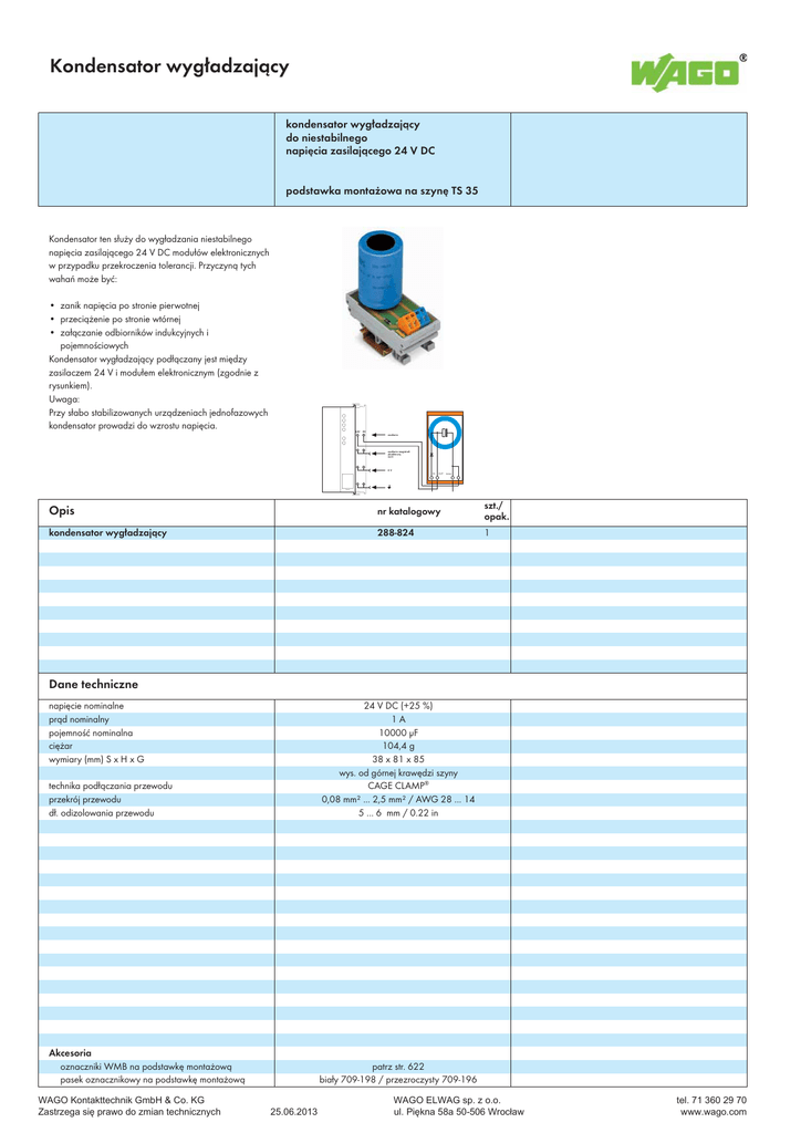 10 Kondensator wygładzający 566 kondensator wygładzający do niestabilnego napięcia zasilającego 24 V DC podstawka montażowa na szynę TS 35 Kondensator ten służy do wygładzania niestabilnego napięcia zasilającego 24 V DC modułów elektronicznych w przypadku przekroczenia tolerancji. Przyczyną tych wahań może być: • zanik napięcia po stronie pierwotnej • przeciążenie po stronie wtórnej • załączanie odbiorników indukcyjnych i pojemnościowych Kondensator wygładzający podłączany jest między zasilaczem 24 V i modułem elektronicznym (zgodnie z rysunkiem). Uwaga: Przy słabo stabilizowanych urządzeniach jednofazowych kondensator prowadzi do wzrostu napięcia. 24V 0V zasilanie zasilanie magistrali obiektowej 24 V 0V IN OUT masa Opis nr katalogowy szt./ opak. kondensator wygładzający 288-824 1 Dane techniczne napięcie nominalne prąd nominalny pojemność nominalna ciężar wymiary (mm) S x H x G technika podłączania przewodu przekrój przewodu dł. odizolowania przewodu 24 V DC (+25 %) 1A 10000 μF 104,4 g 38 x 81 x 85 wys. od górnej krawędzi szyny CAGE CLAMP® 0,08 mm² ... 2,5 mm² / AWG 28 ... 14 5 ... 6 mm / 0.22 in Akcesoria oznaczniki WMB na podstawkę montażową pasek oznacznikowy na podstawkę montażową patrz str. 622 biały 709-198 / przezroczysty 709-196 :$*2.RQWDNWWHFKQLN*PE+&R.* :$*2(/:$*VS]RR =DVWU]HJDVLĊSUDZRGR]PLDQWHFKQLF]Q\FK XO3LĊNQDD:URFáDZ WHO ZZZZDJRFRP